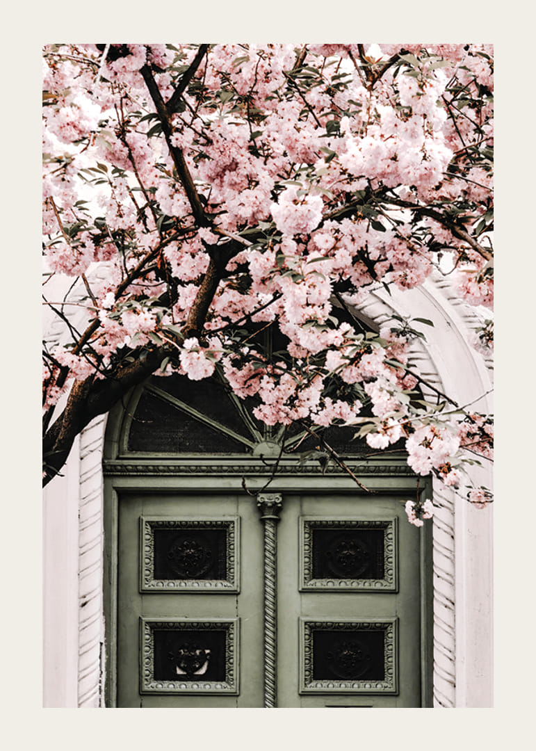 Poster med ett botaniskt och arkitektoniskt motiv – en dekorativ grön dörr ramas in av ett träd i full blom med täta klasar av ljusrosa körsbärsblommor. Dova pastelltoner och ett klassiskt arkitektoniskt inslag ger en tidlös samt mjuk känsla som passar i både vardagsrum och hall.