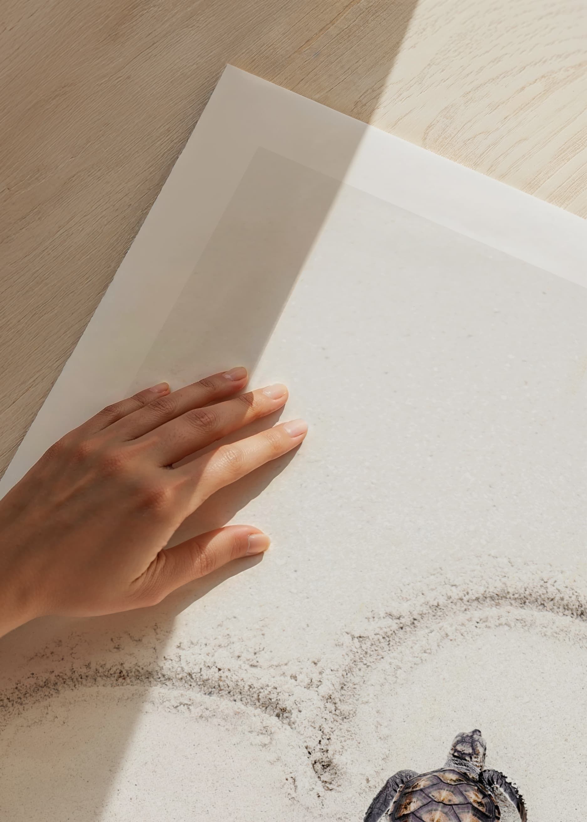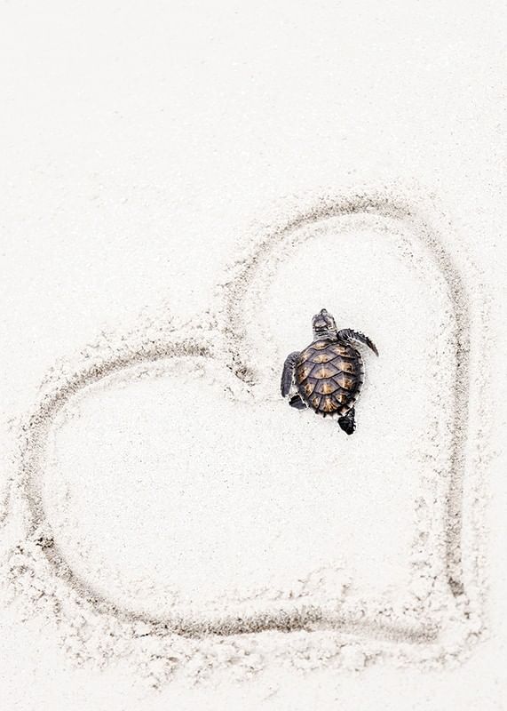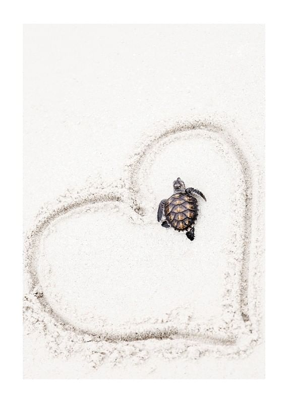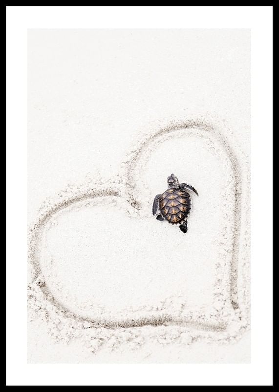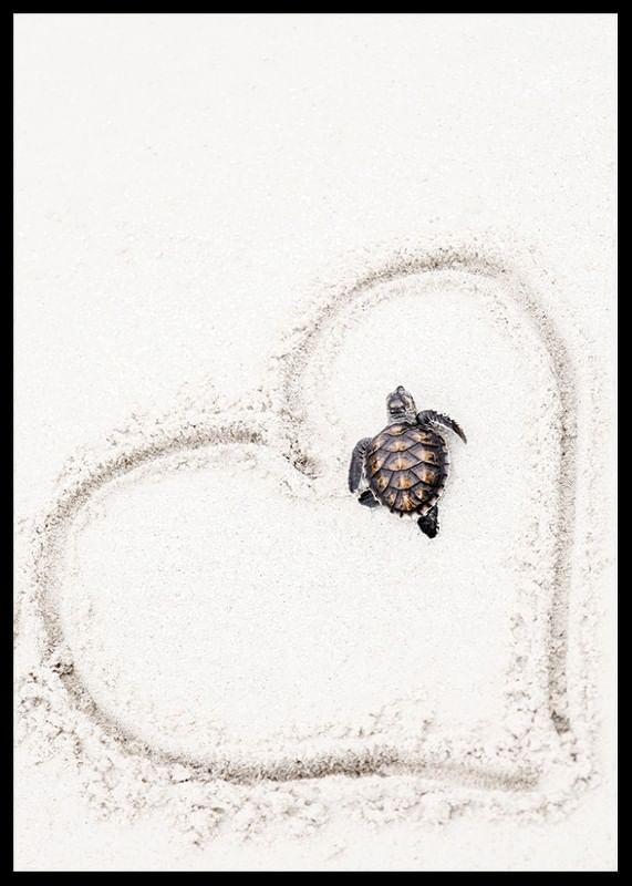 En ung havssköldpadda syns på en ljus sandstrand, inramad av ett hjärta ritat i sanden. Kontrasten mellan det mjuka sandiga underlaget och sköldpaddans mörka skal ger ett rent och lekfullt uttryck. Denna poster tillför en lättsam och varm känsla till barnrum eller andra rum där djurmotiv uppskattas.