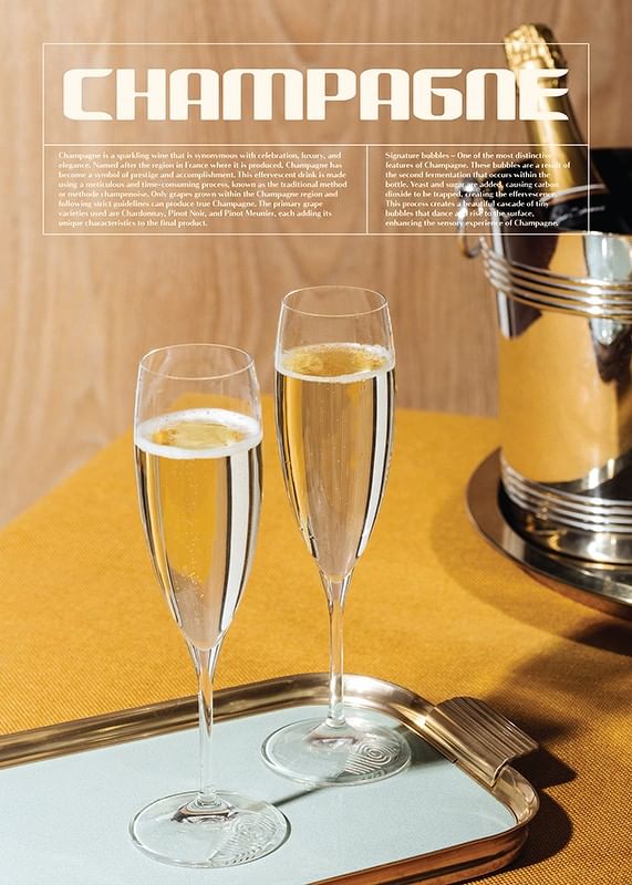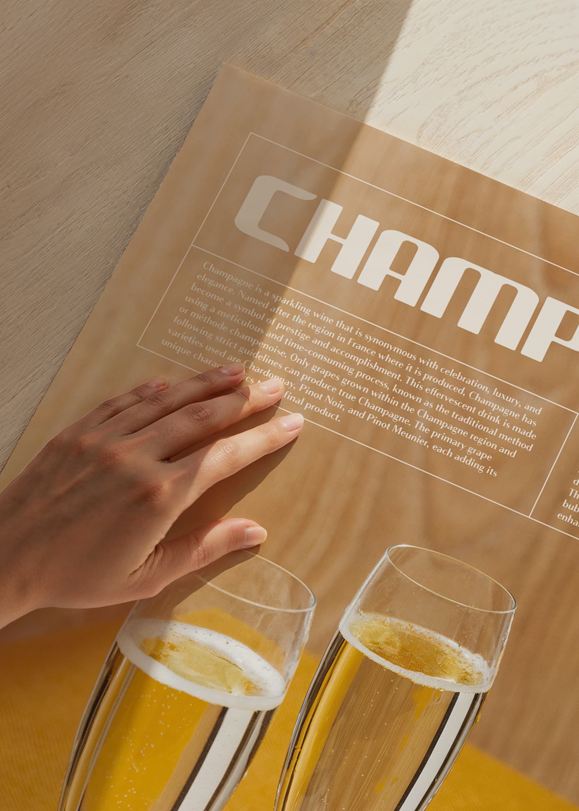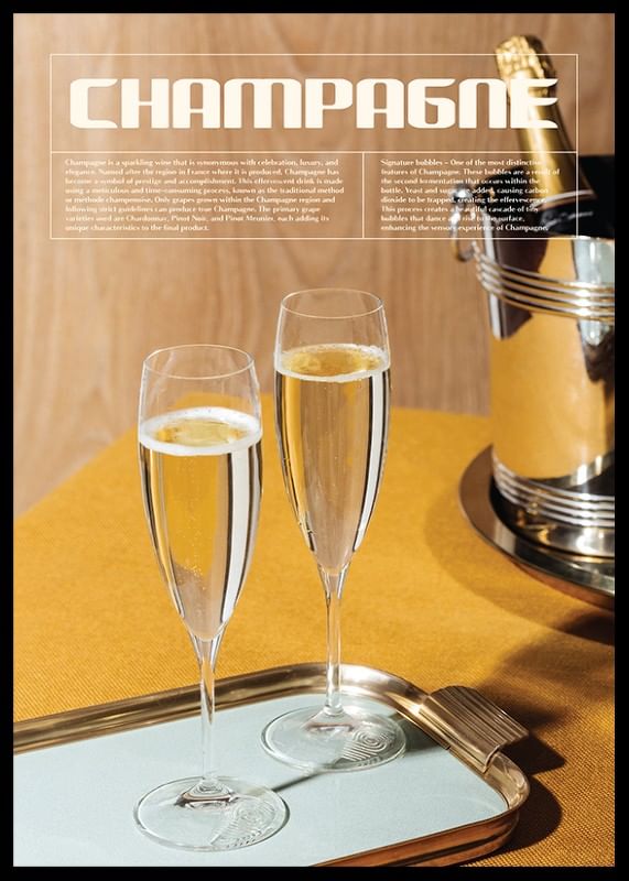 Två höga champagneglas fyllda med gyllene bubblor står på en ljus bricka, placerade mot en varm bakgrund i trätoner och en kryddig gul duk. Till höger syns en champagneflaska i en glänsande ishink. En informativ text om champagne pryder den övre delen av motivet. Postern ger ett elegant intryck i kök eller matsal.
