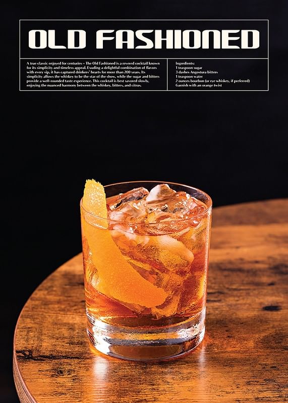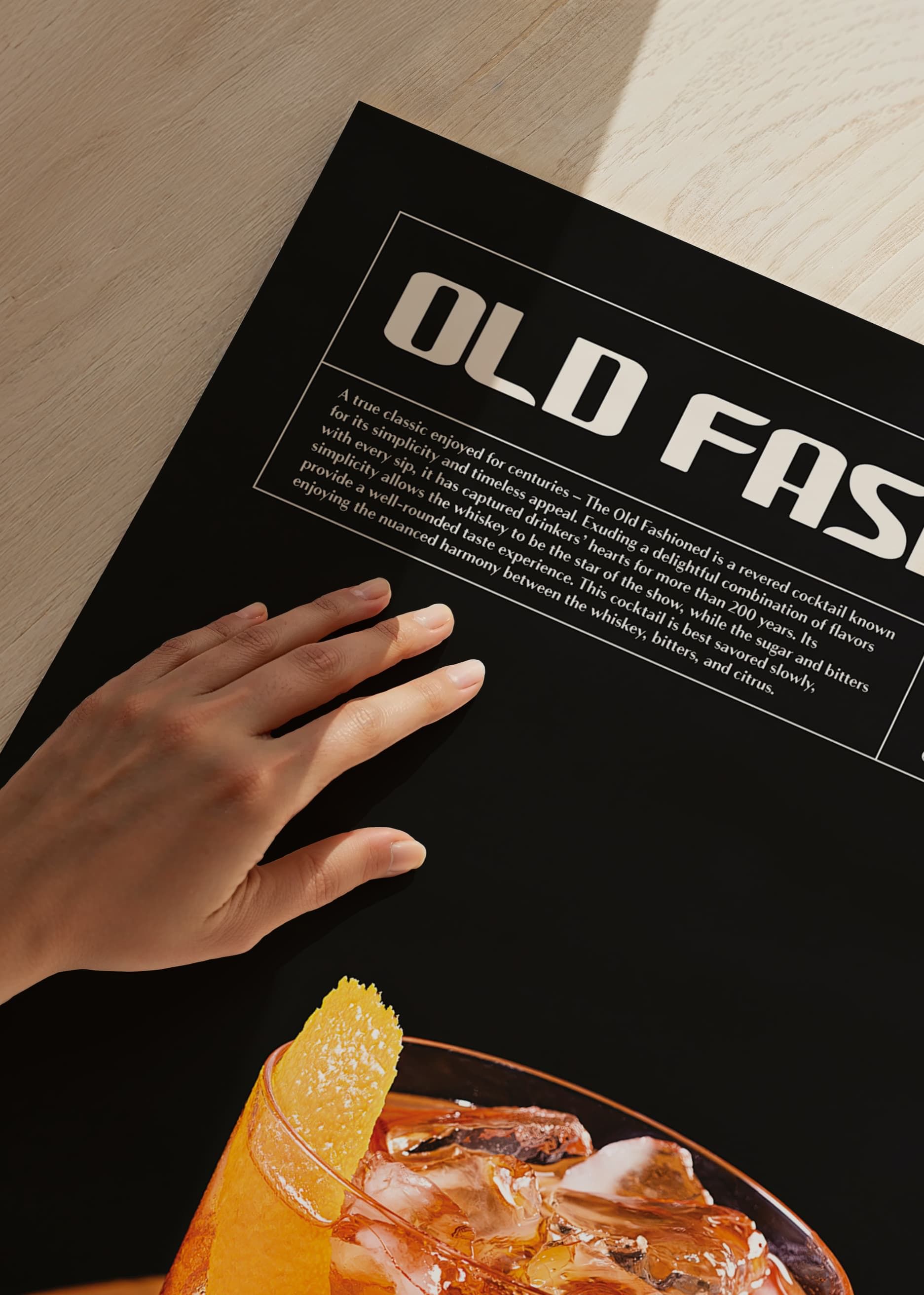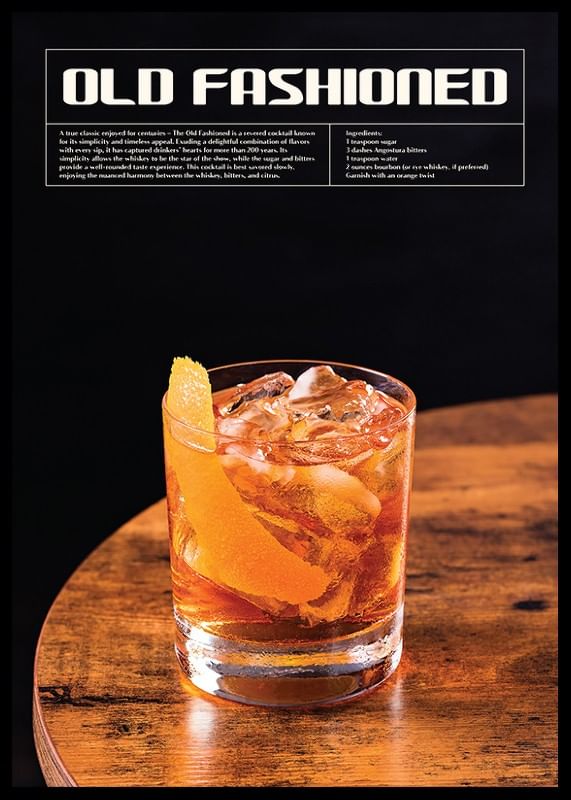 Motivet består av ett närfoto på ett glas Old Fashioned fylld med is, gyllene bärnstensfärgad dryck och en lång bit apelsinskal som dekoration. Ovanför syns vit text med drinkens namn, beskrivning och ingredienser mot svart bakgrund. En stilsäker poster för kök eller hemmabar som lyfter känslan av klassisk cocktailkultur.