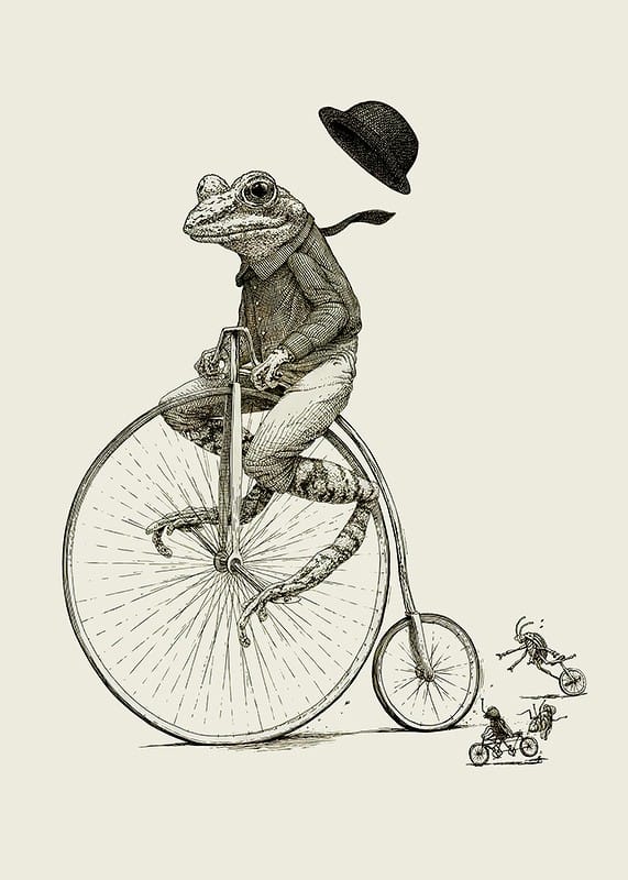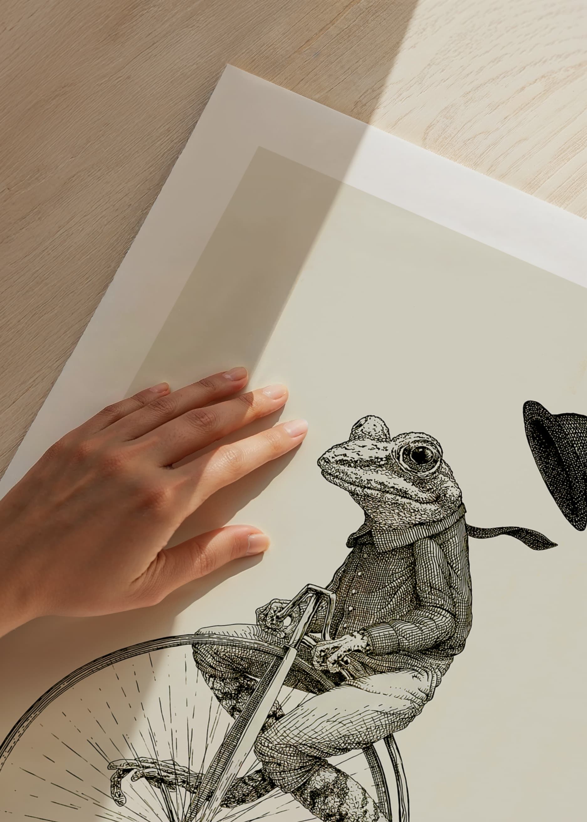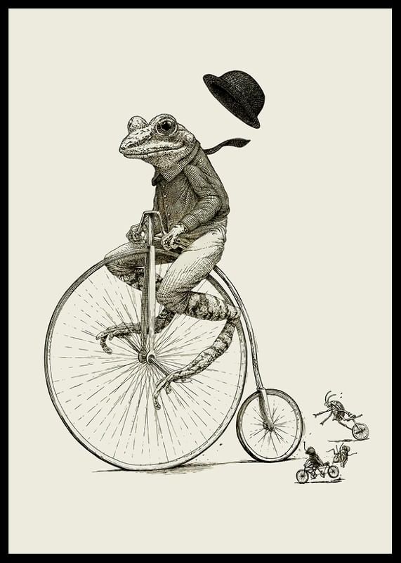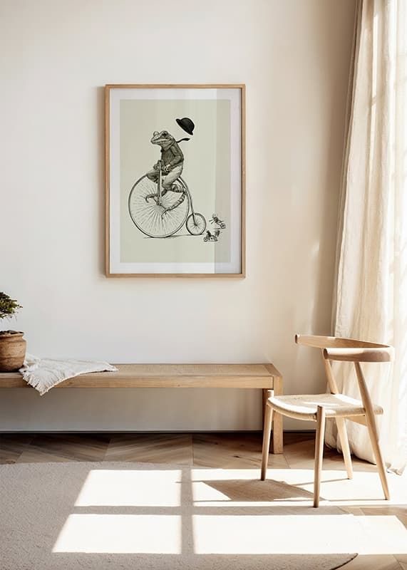 En groda klädd i skjorta och byxor cyklar på en gammaldags höghjuling medan en fluga svävar bakom honom och en hatt svävar i luften. Flera små insekter syns också på egna cyklar bredvid. Denna poster passar i barnrum eller som lekfull detalj i hemmets mer avslappnade miljöer.