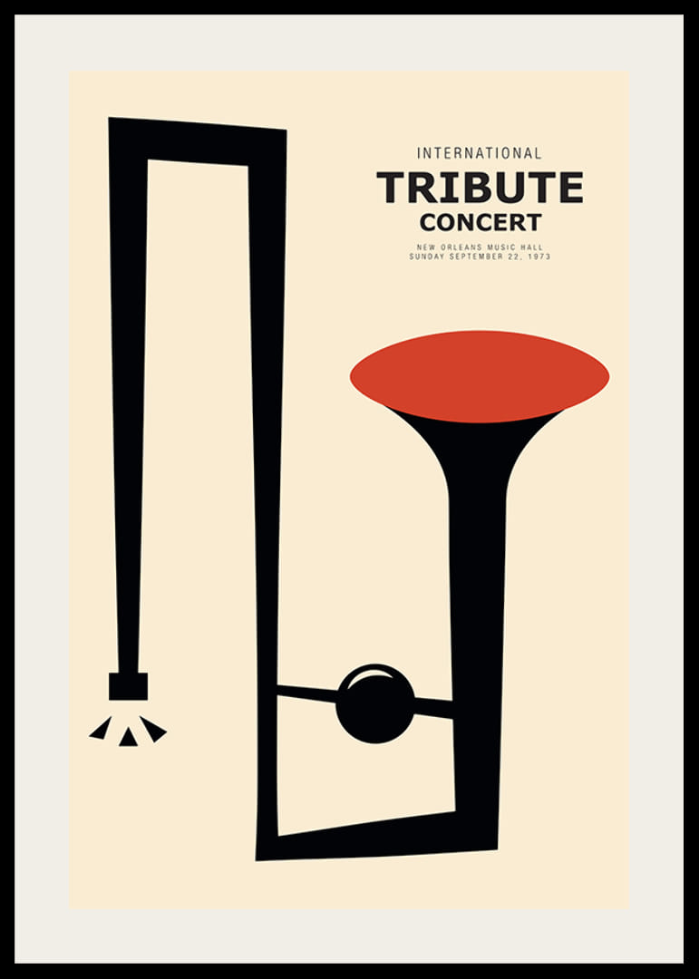 Motivet består av en stiliserad trumpet med rena svarta former och ett rödorange klockstycke mot ljus beige bakgrund. Texten 'International Tribute Concert' ger en känsla av vintageaffisch från 1970-talet. Den grafiska stilen gör denna poster lätt att kombinera med andra konstverk i musik- eller vardagsrum.