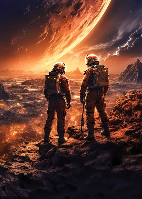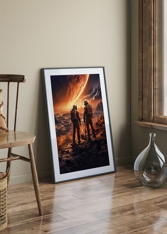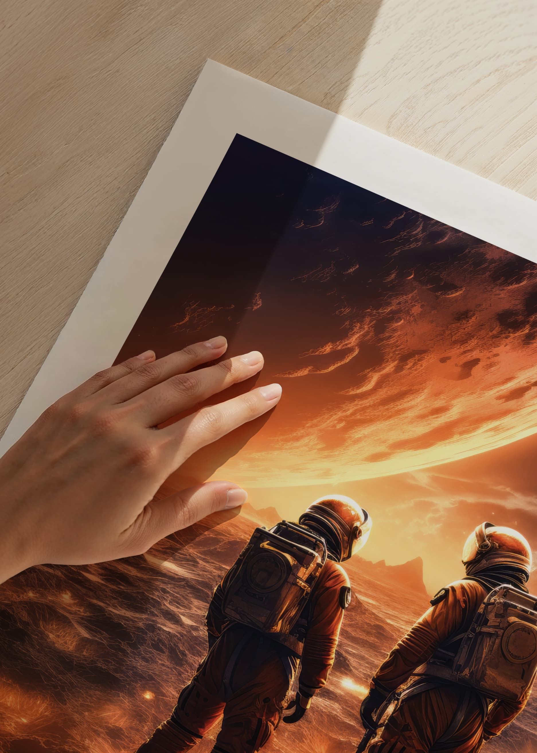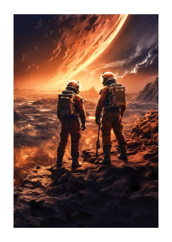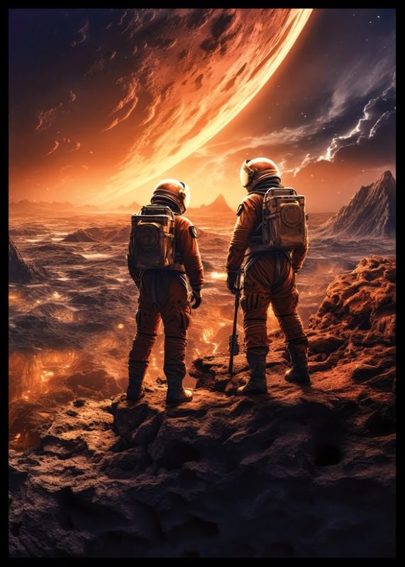 Två astronauter i orange dräkt betraktar ett dramatiskt och glödande landskap med berg och lavafylld mark under en massiv planet i bakgrunden. Intensiva orangea och mörka toner präglar denna poster, som tillför en futuristisk stämning till barnrum eller kreativa miljöer.