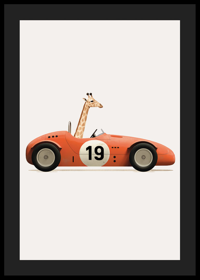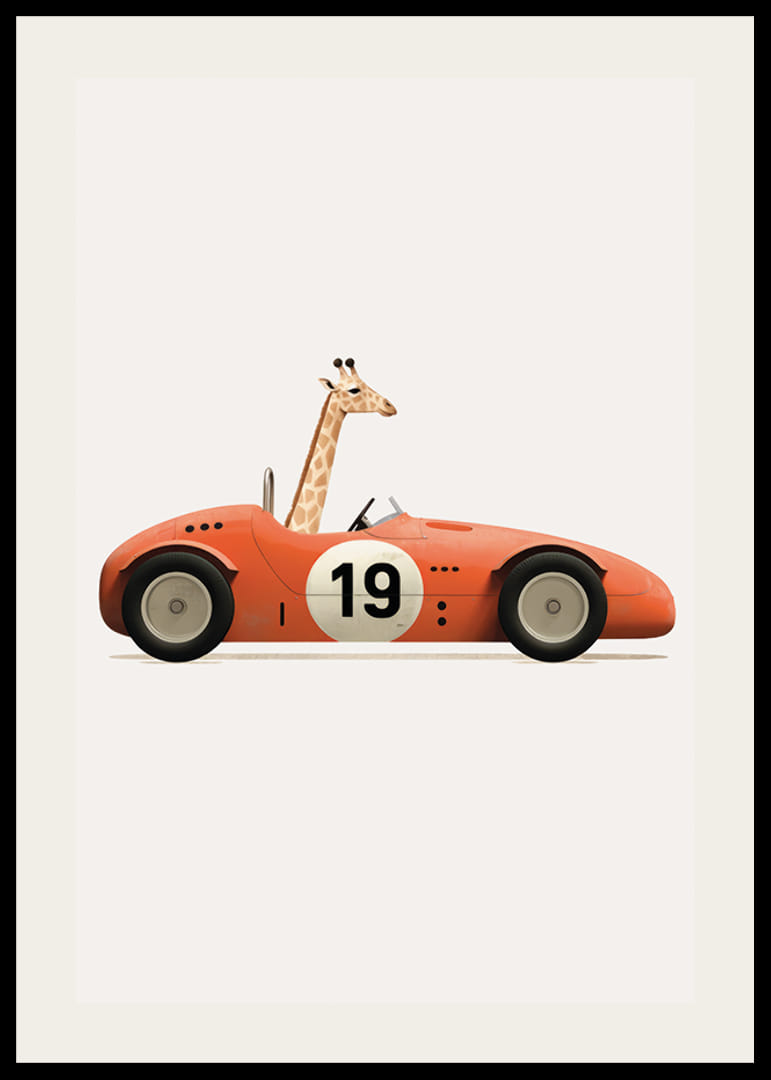 Motivet består av en tecknad giraff som sitter bakom ratten i en röd leksaksbil med siffran 19 på sidan. Den ljusa bakgrunden framhäver djurets långa hals och bilens klassiska form. Lekfull illustration som ger en fantasifull känsla till barnrummet. Denna poster passar utmärkt i en lekfull miljö.