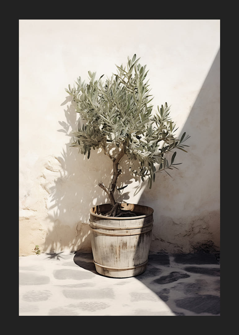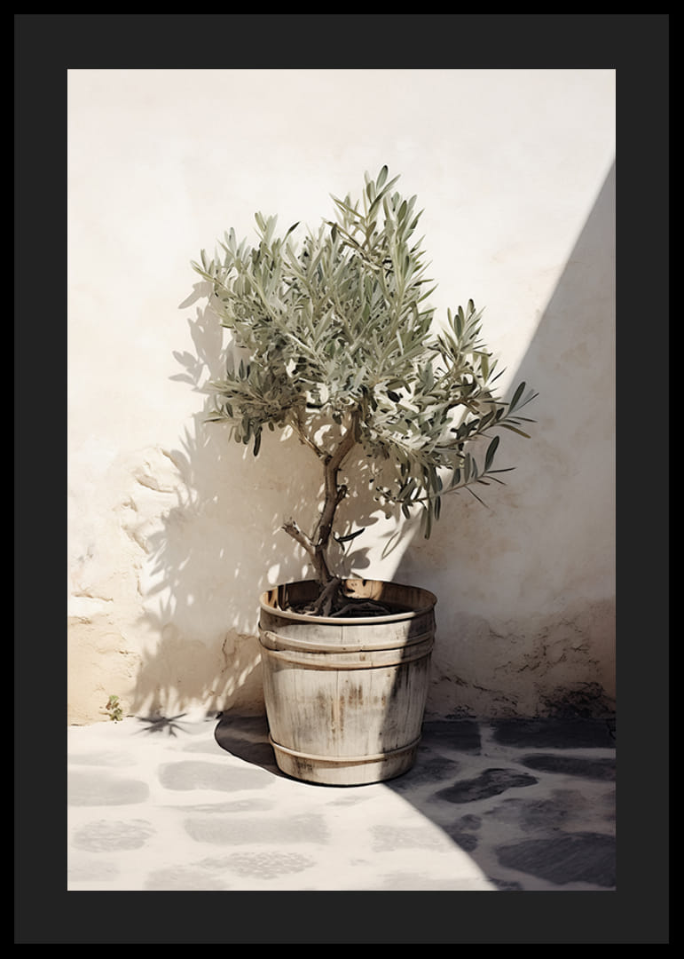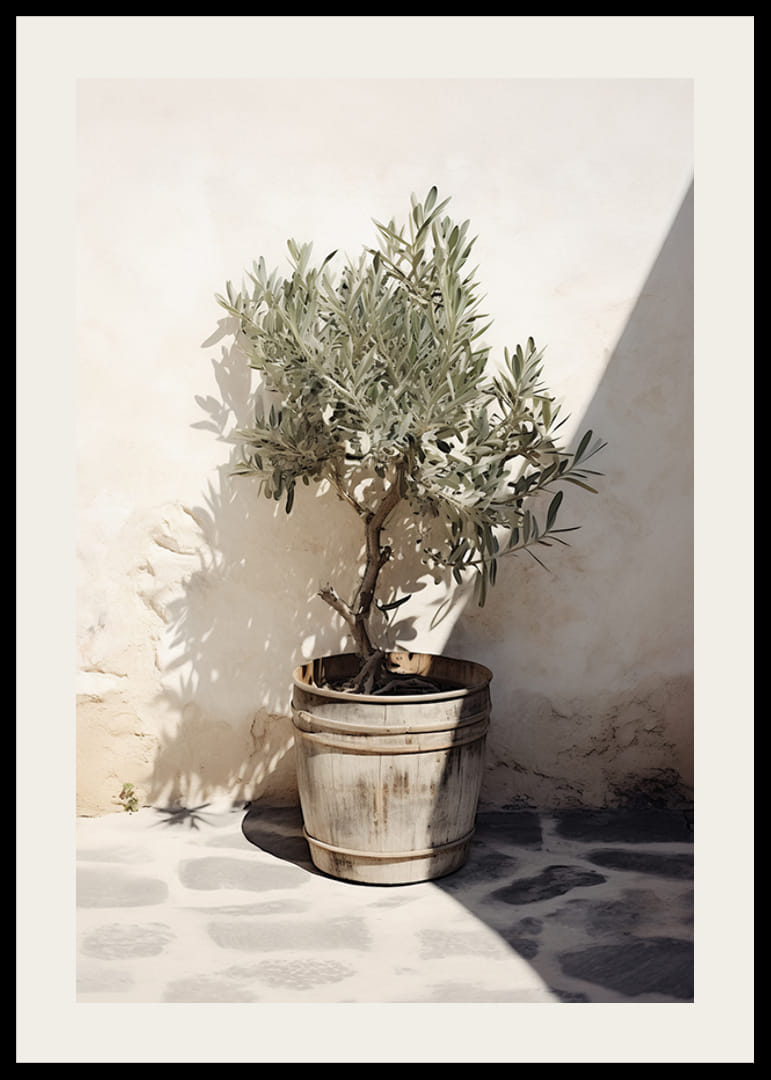 Ett litet olivträd står i en åldrad trätunna placerad mot en vitputsad vägg, där skarpa solstrålar och skuggor bildar tydliga kontraster på stenlagt golv. Denna poster förmedlar känslan av medelhav och enkelhet, och ger ett varmt, naturligt inslag till både kök och vardagsrum.