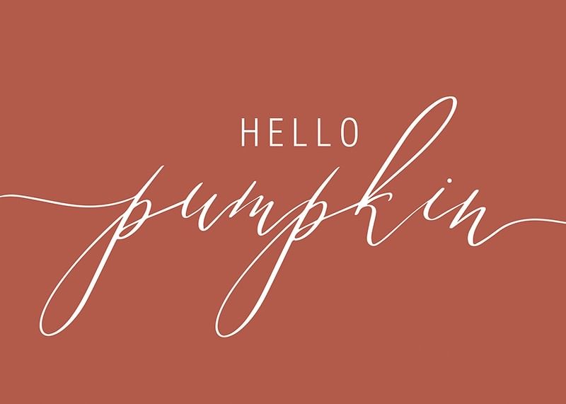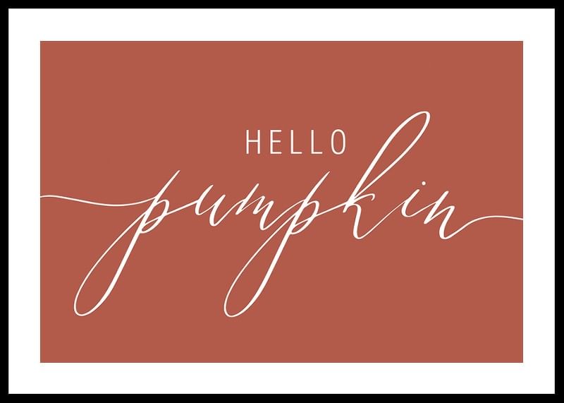 Varm höströd bakgrund med frasen 'Hello Pumpkin' i tydlig vit skrivstil. Kombinationen av enkel versal text och svepande kursiv ger en stilren, säsongsbetonad känsla till höst och Halloween. En textposter som skapar välkomnande ton och passar som dekorativ detalj i hemmet.