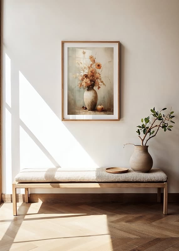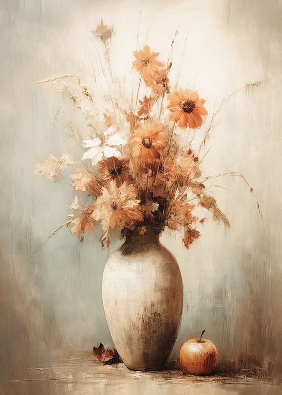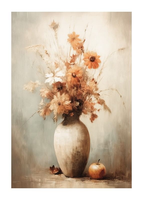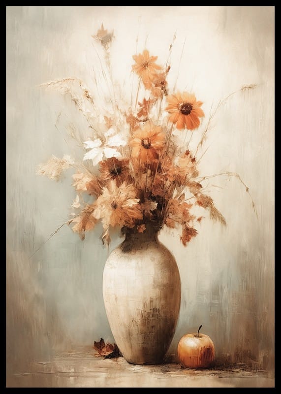 Solrosliknande orange och vita blommor arrangerade i en rustik vas, omgivna av torkat gräs och kvistar. Ett äpple vilar intill vasen på ett bord. Mjuka brunbeiga och dova blå toner sätter en varm höstkänsla. Den här poster lyfter vardagsrum eller kök med sin tidlösa, botaniska stil.