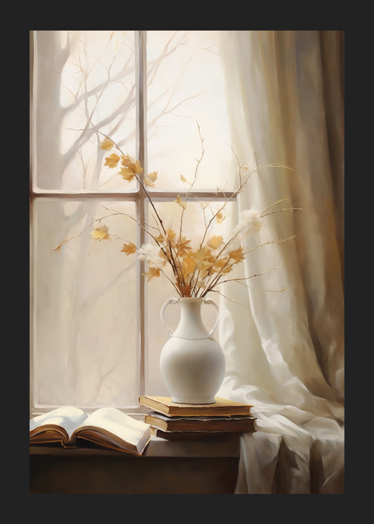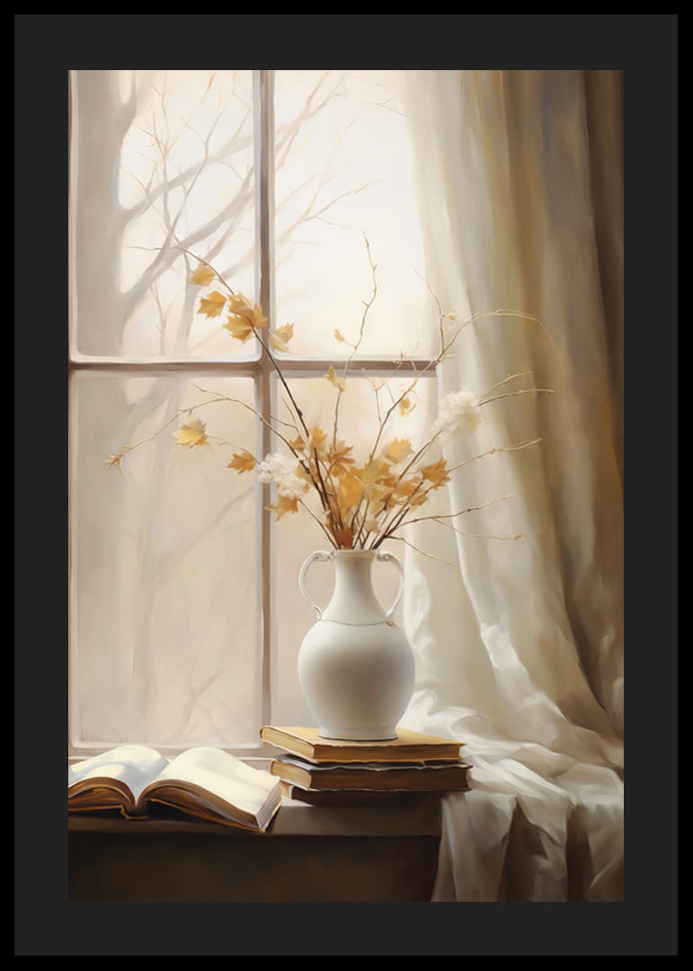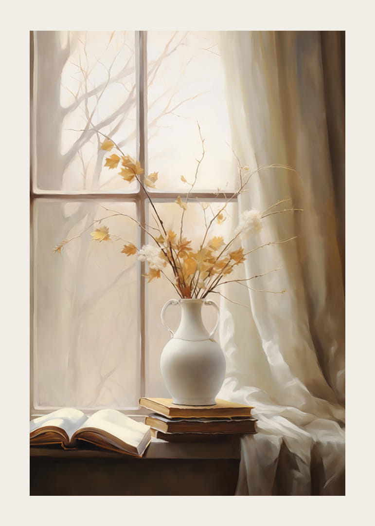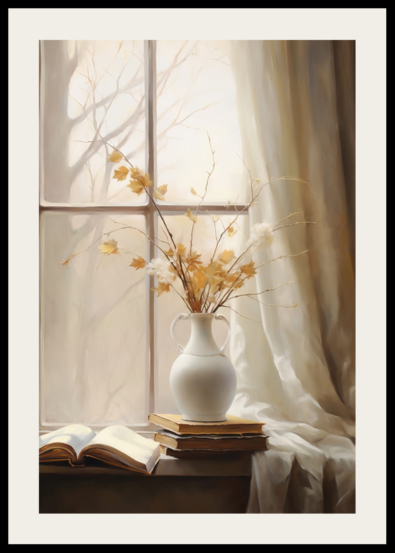 Grenar med gula höstlöv och vita blommor står i en vit keramikvas på en fönsterbräda. Fönstret omges av ljusa gardiner, utanför anas trädens siluetter i dämpat ljus. På fönsterbrädan ligger också några böcker, varav en är uppslagen. Denna poster ger ett lugnt och varmt inslag till hemmet.