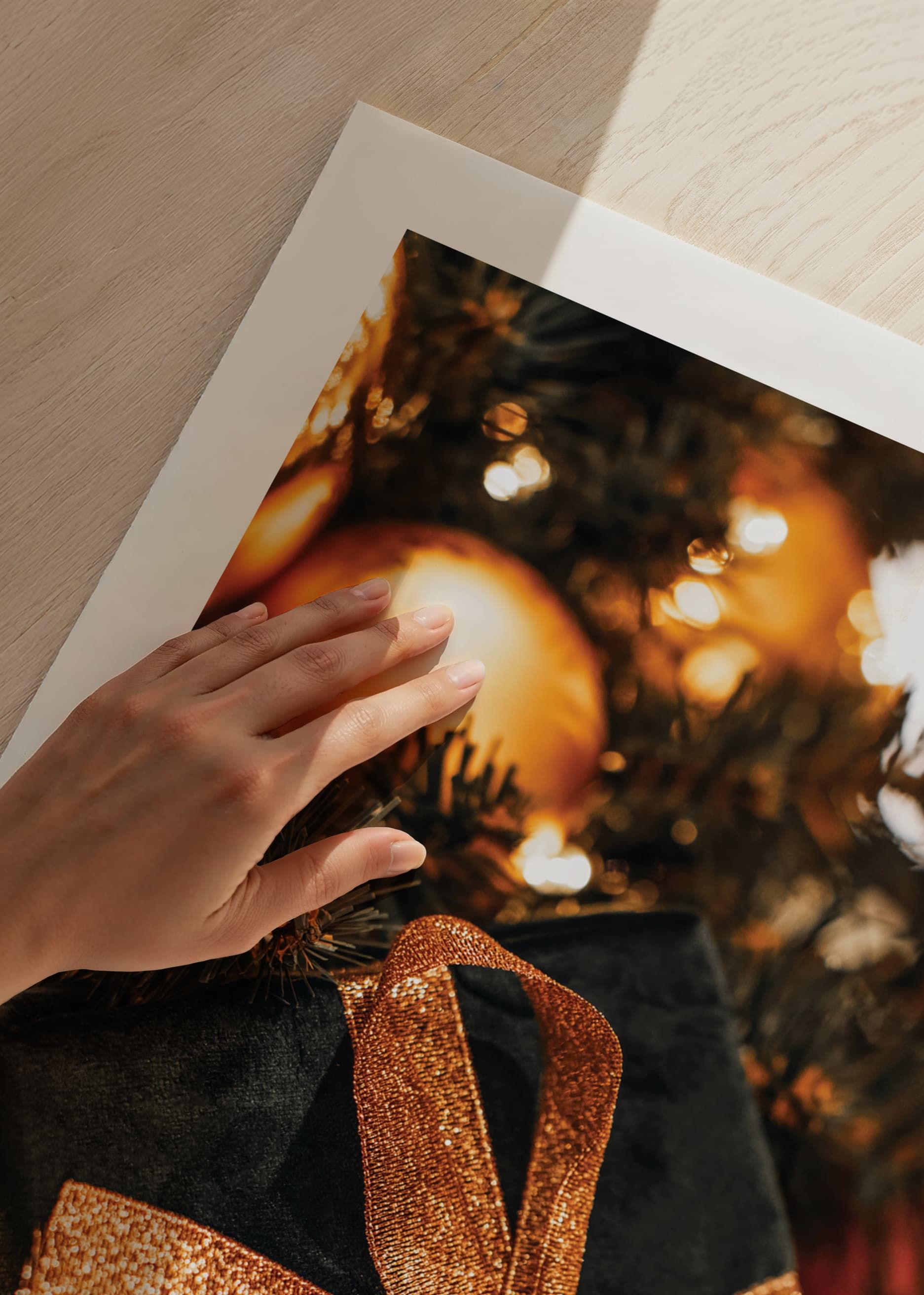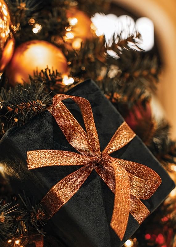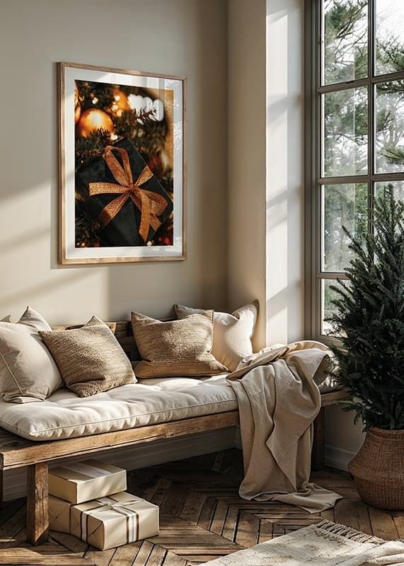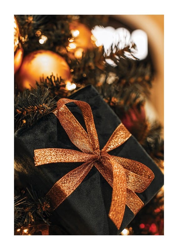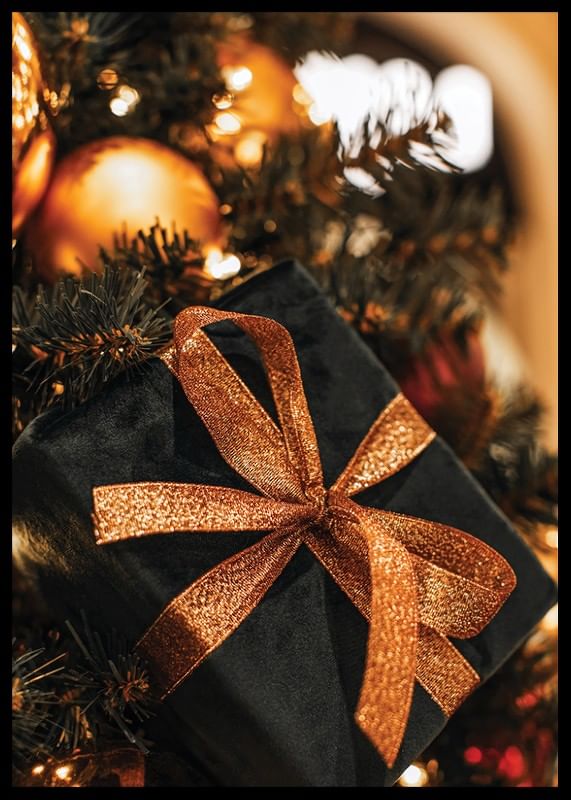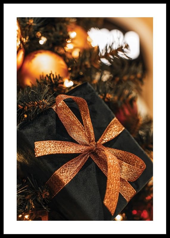 Svartpaketerad julklapp med ett skimrande koppartonat band vilar bland täta, mörkgröna grenar och gyllene julkulor. De varma ljuspunkterna från granens dekorationer skapar en stämningsfull kontrast. Denna poster passar utmärkt som säsongsbetonad dekoration i vardagsrum eller hall.