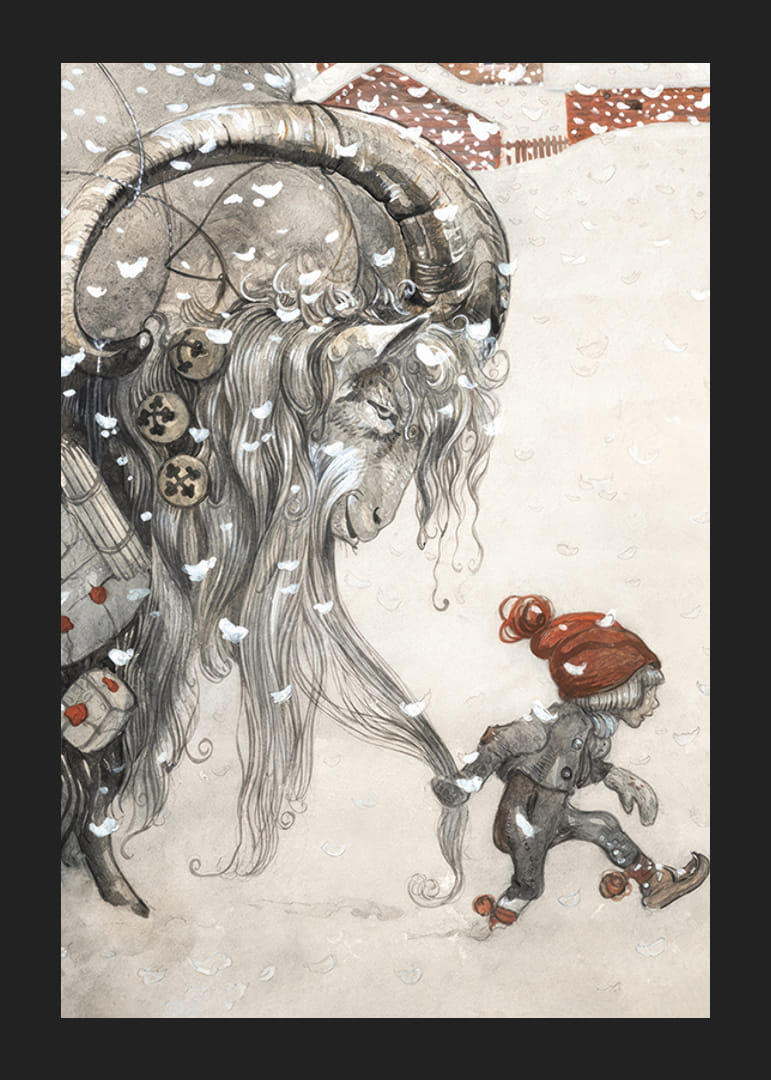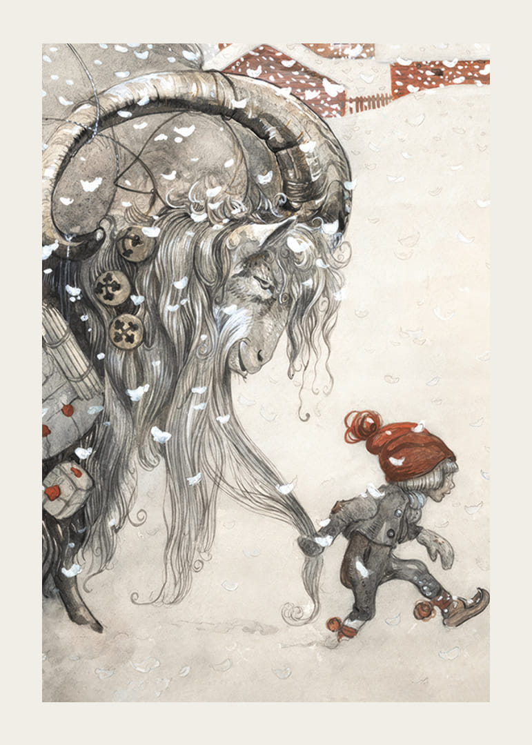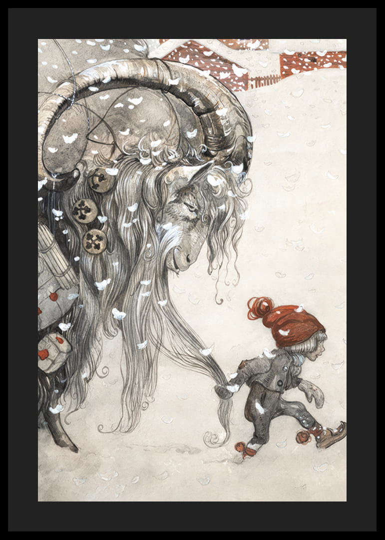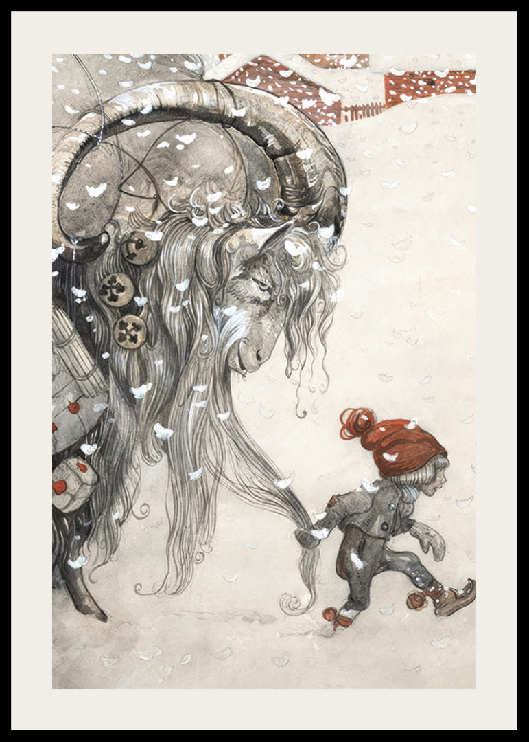 Motivet består av en stor julbock med långa horn, bredvid ett barn i röd mössa. Snöflingor faller över båda och en stuga syns i bakgrunden. Denna detaljrika poster av John Bauer från 1911 ger julkänsla och blir ett stämningsfullt inslag i hemmet under vintermånaderna. Målningen var omslagsbild till "Julbocken: Jultidning för stora och små barn".