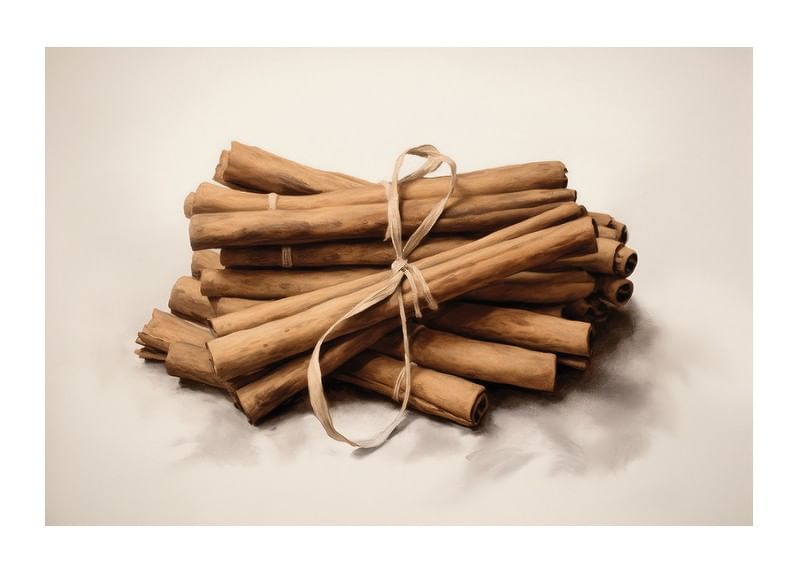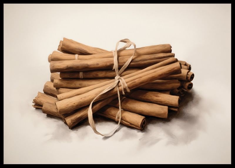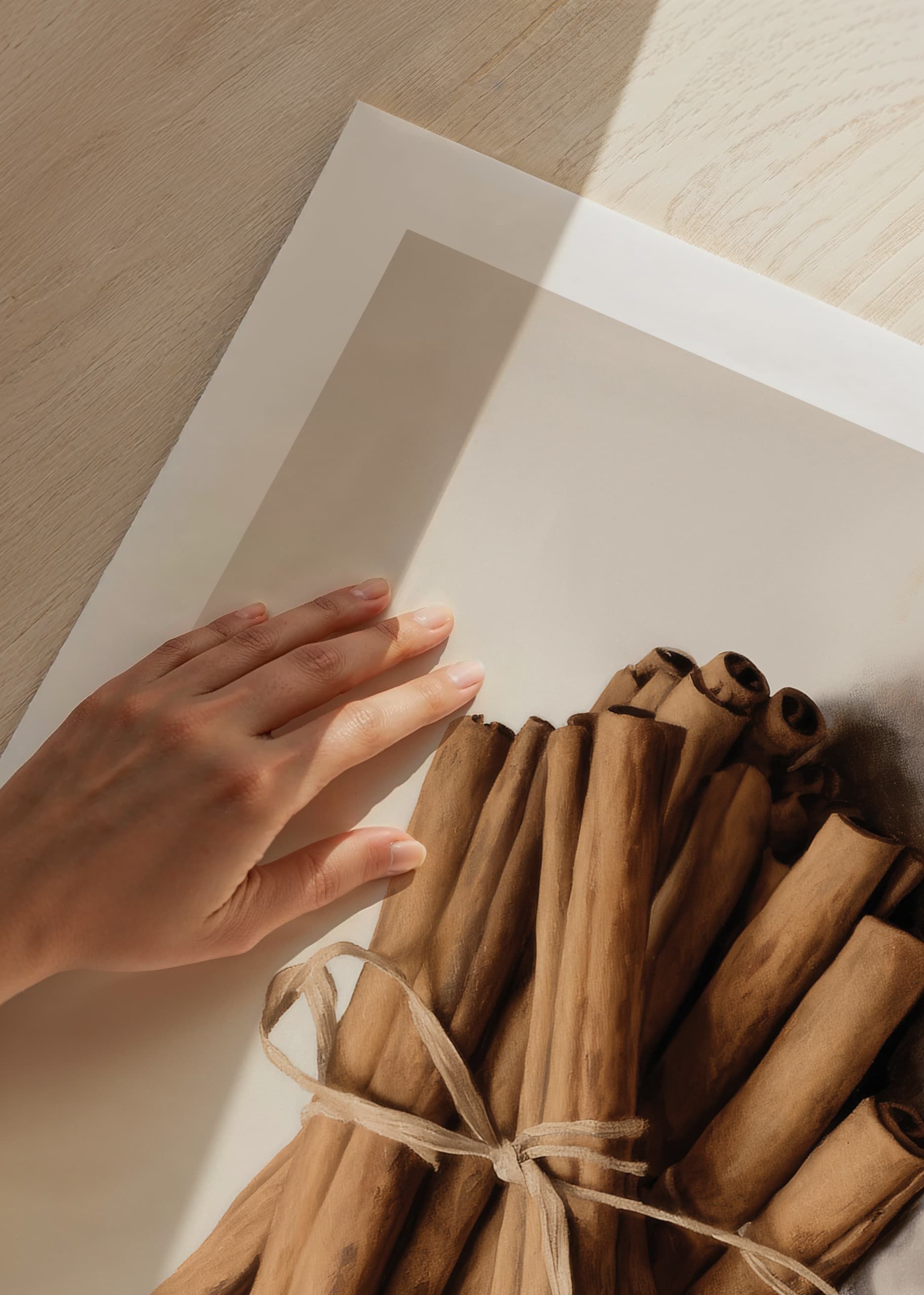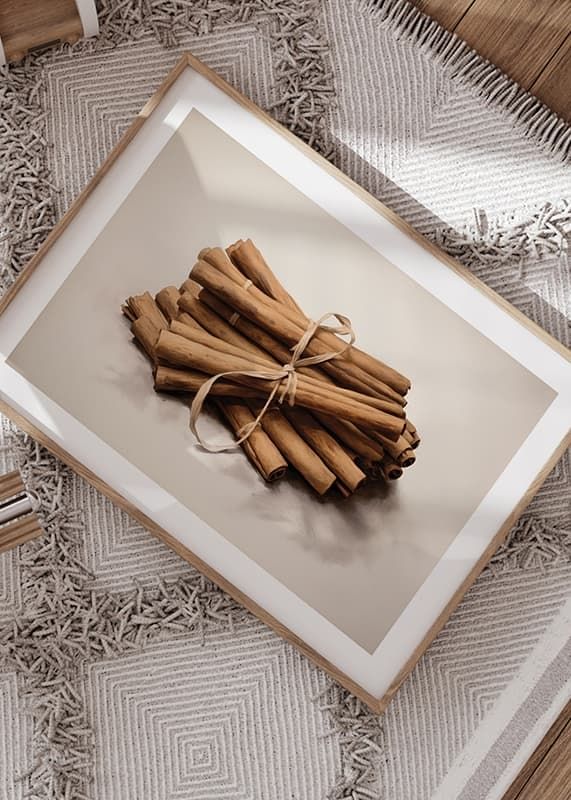 Kanelstänger ligger samlade i en liten hög och hålls ihop av ett enkelt snöre. Motivets mjuka akvarelltoner i brunt och beige skapar en varm och inbjudande känsla. Denna poster passar bra som säsongsbetonad dekoration i kök eller vardagsrum och ger en subtil jul- eller vinterstämning året om.