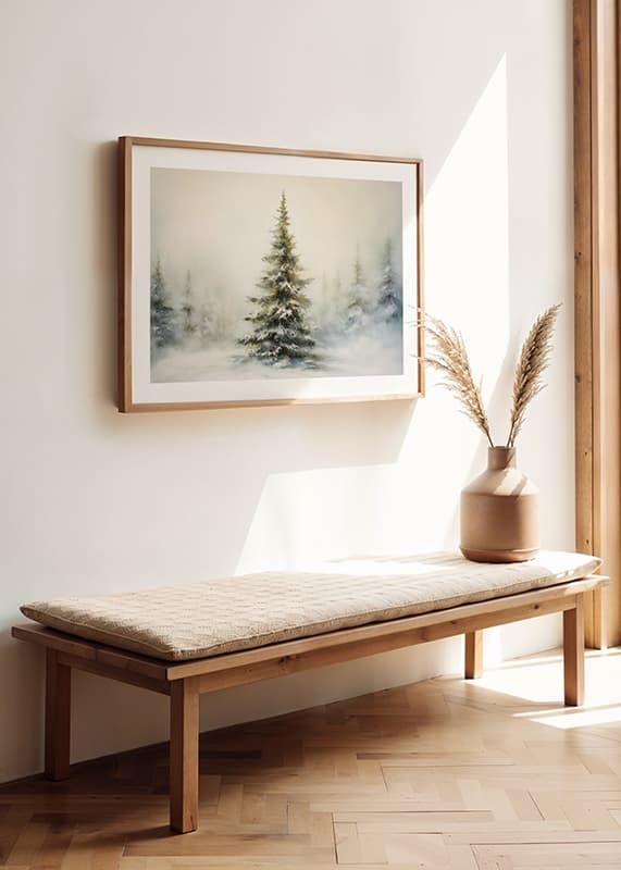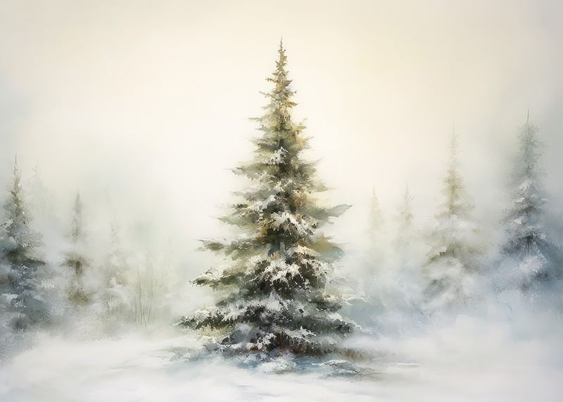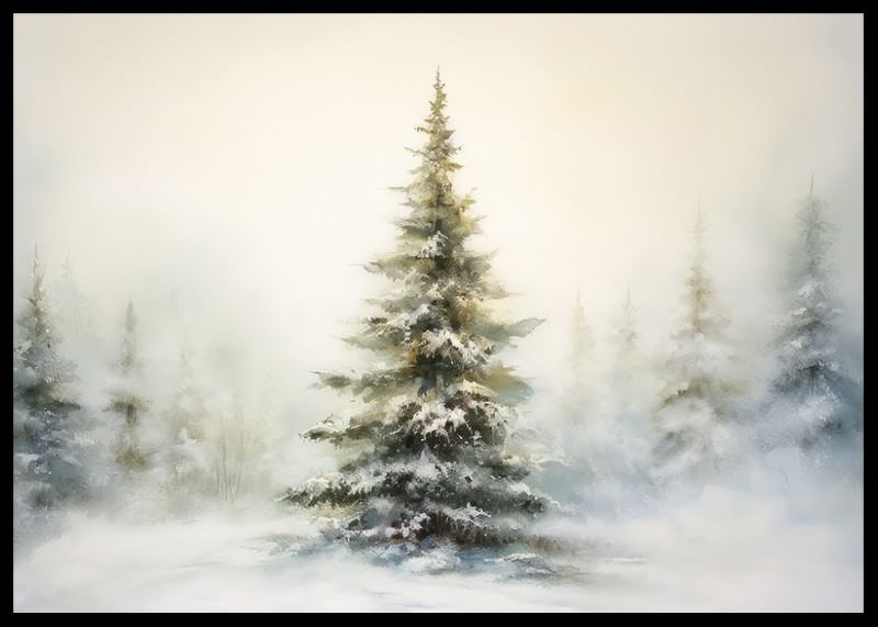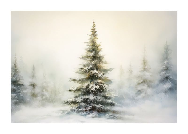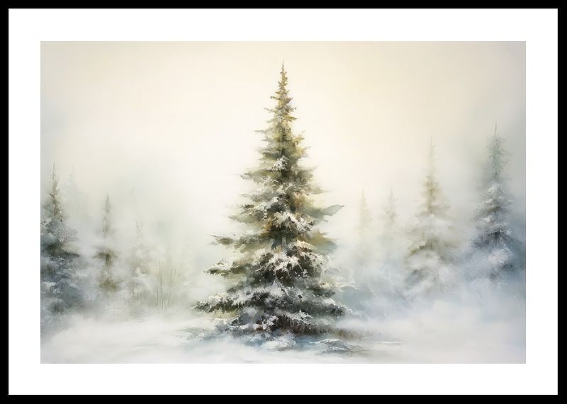 En fristående gran täckt av snö står i fokus mot en mjukt dimmig vinterbakgrund, med fler suddiga träd i fjärran. Ljusgrå och beige toner dominerar motivet, vilket ger en stillsam och naturlig känsla. Denna poster ger en säsongsbetonad accent till vardagsrum, hall eller sovrum utan att ta över helhetsintrycket.