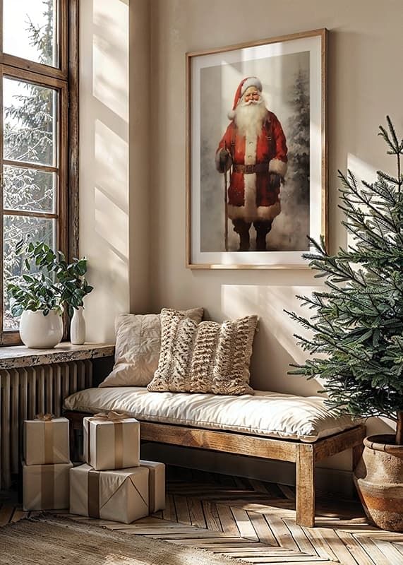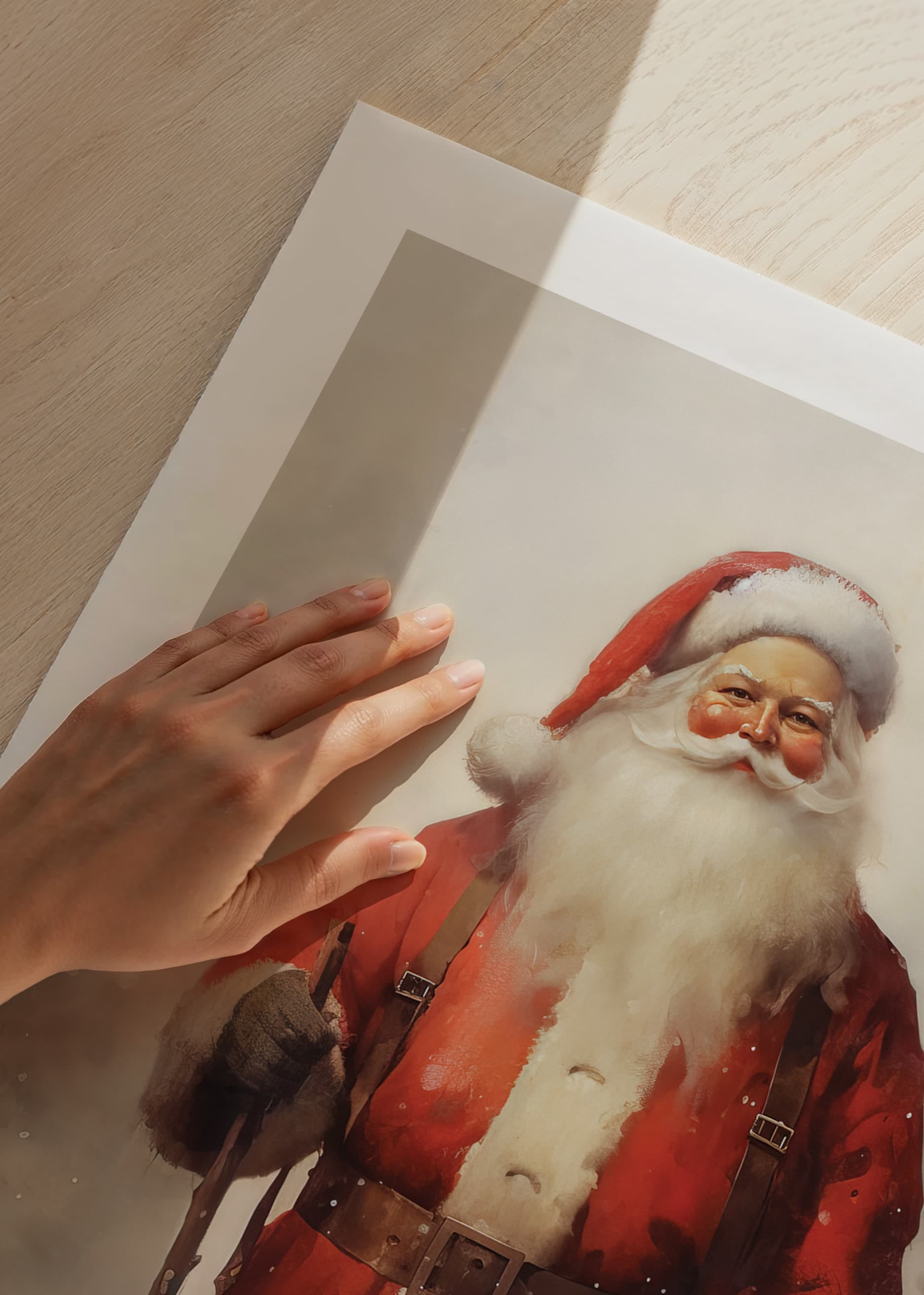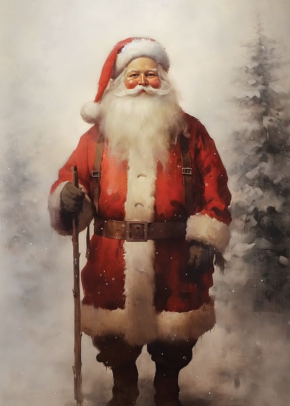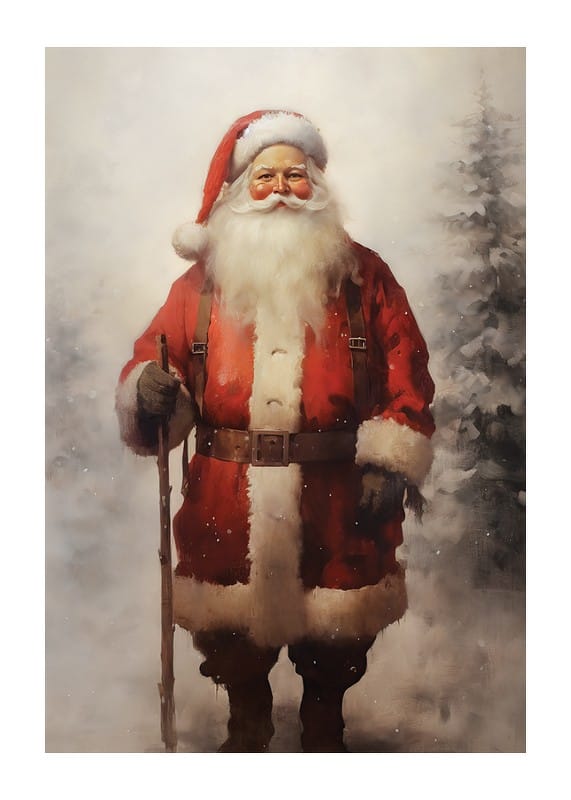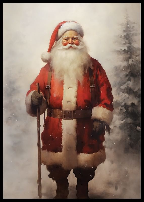 Jultomten står mitt i ett vintrigt landskap med mjuka snöflingor och frostiga granar i bakgrunden. Hans röda dräkt, vita skägg och vänliga uttryck framhävs av akvarellens mjuka färgövergångar. En käpp i handen förstärker den traditionella känslan. Denna poster tillför stämning till julens hem.