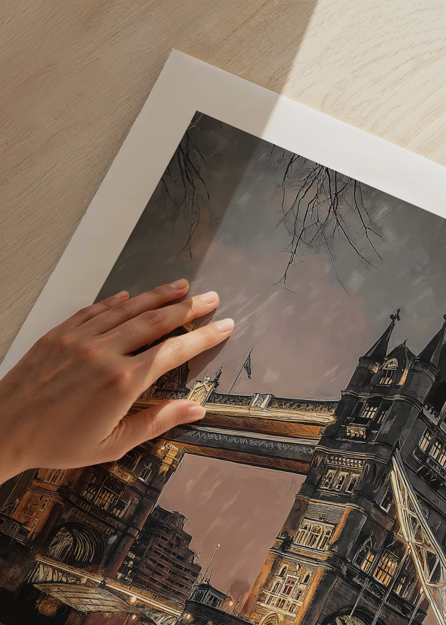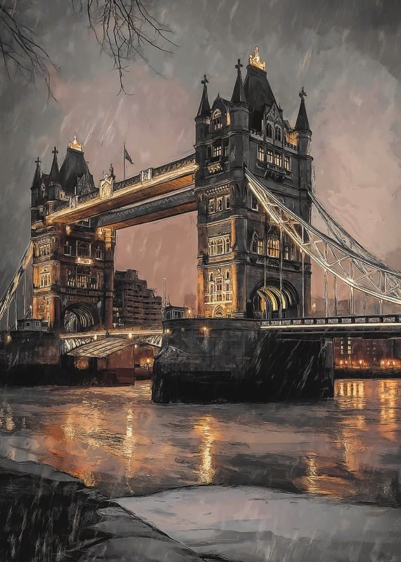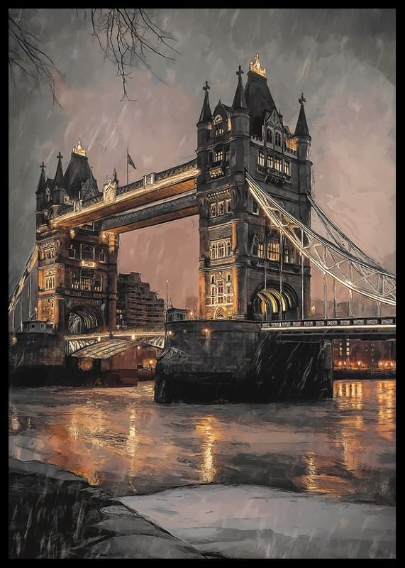 Tower Bridge i London är avbildad i kvällsljus med regndroppar och reflektioner i Themsens vatten. Mjuka grå och varma orange toner dominerar motivet, medan den ikoniska bron är upplyst mot stadens silhuett. En poster som ger en stämningsfull och urban prägel, särskilt fin i vardagsrum eller arbetsrum.