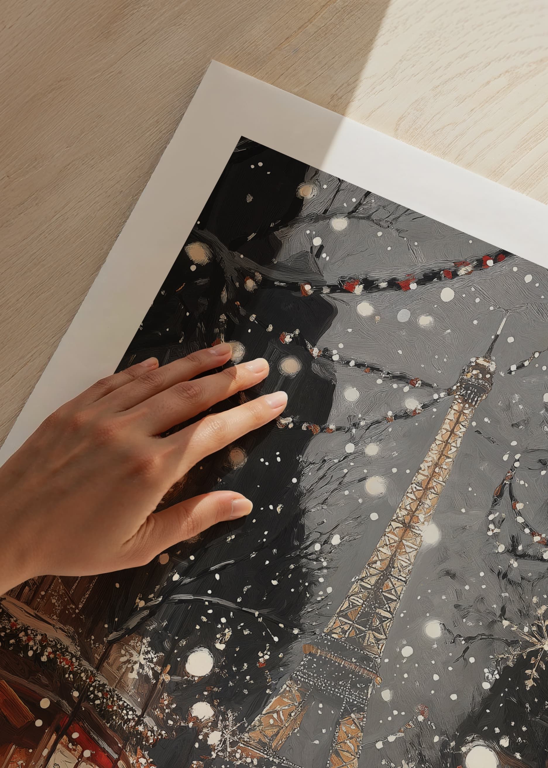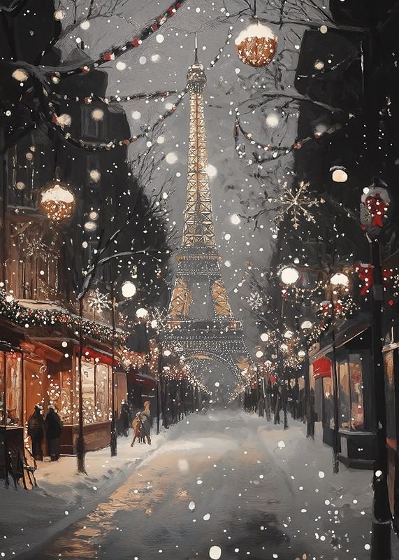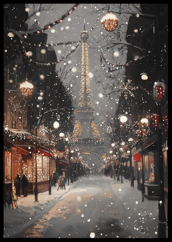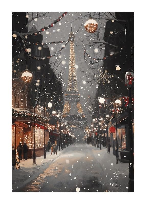 Eiffeltornet reser sig upplyst i bakgrunden, omgiven av en vintermörk stadsmiljö med snötäckta gator och butiker. Ljusslingor, dekorationer och stora snöflingor skapar en tydlig vinterscen med stämningsfullt sken. Denna poster fångar julstämningen och parisisk romantik till hemmet.
