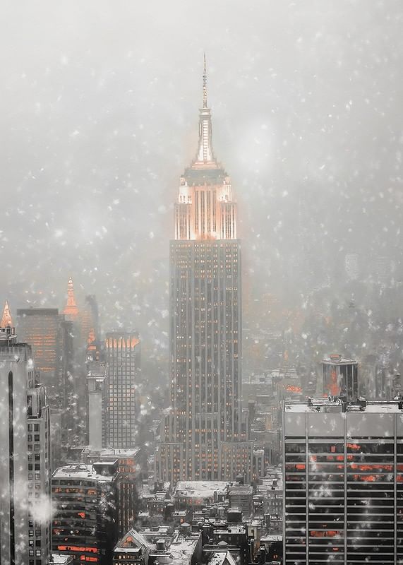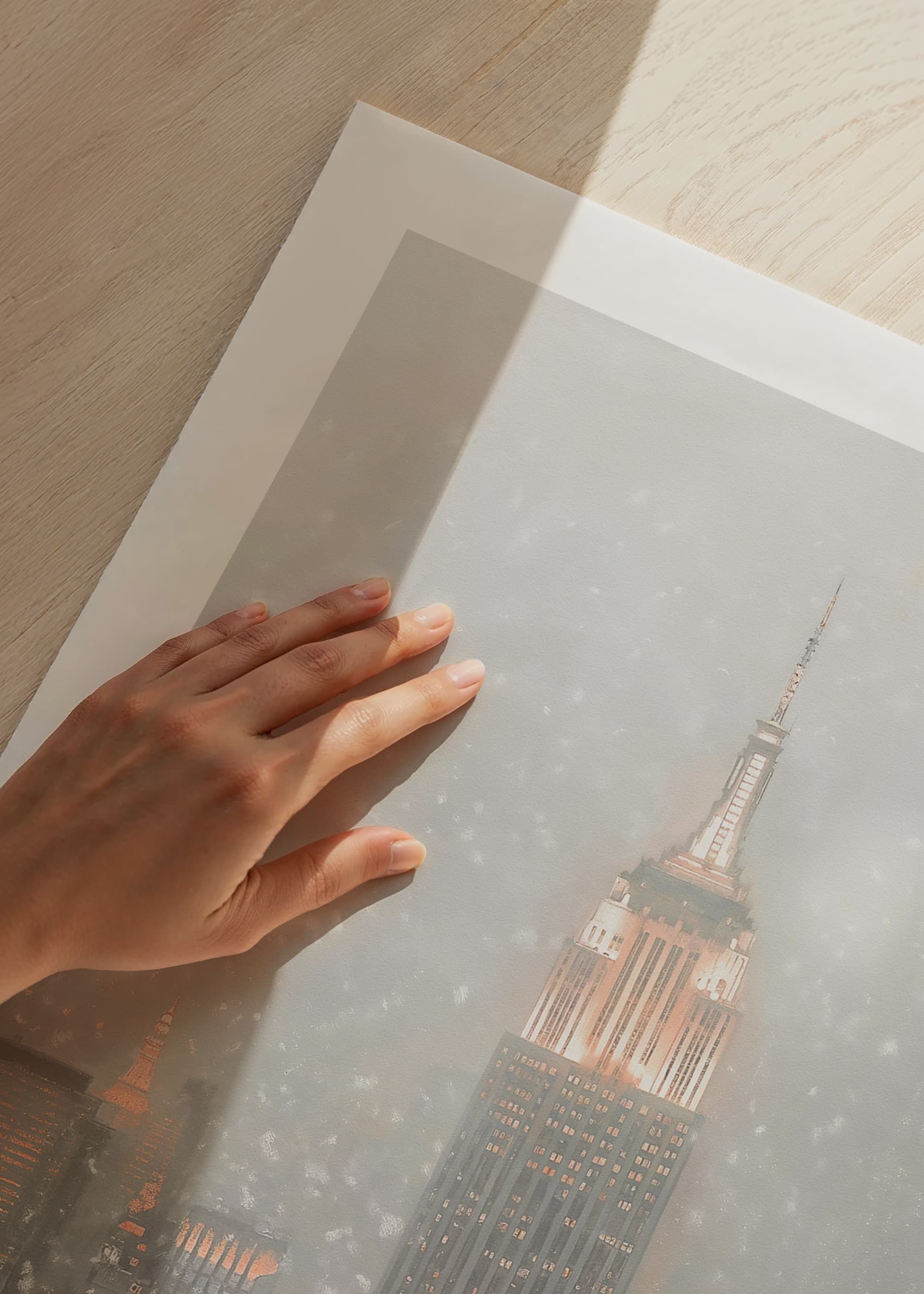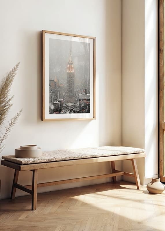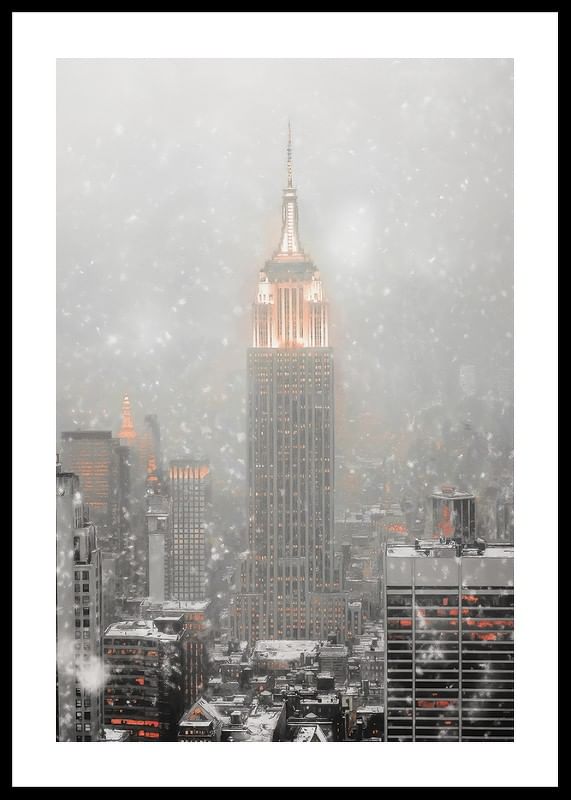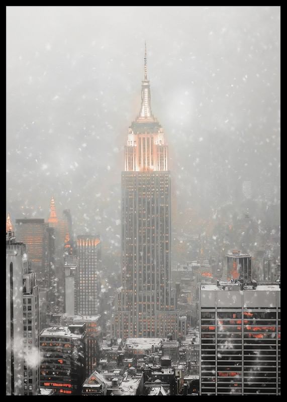 Empire State Building reser sig bland New Yorks skyskrapor, insvept i mjukt snöfall och dämpade gråtoner. De varma ljusen från fönster och topp bidrar till ett kontrasterande sken mot den vintervita staden. Denna poster fångar vinterns magi i The Big Apple och ger en urban känsla till stilrena hem.