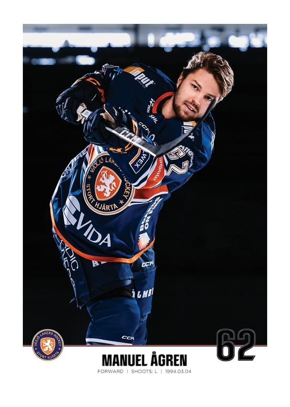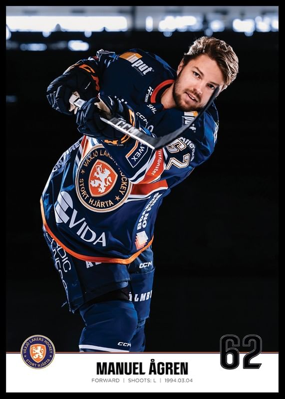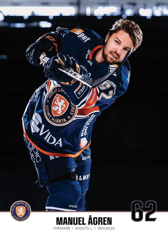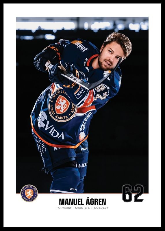 Poster med spelarbild på Växjö Lakers forward Manuel Ågren med tröjnummer 62 från säsongen 2023/2024.