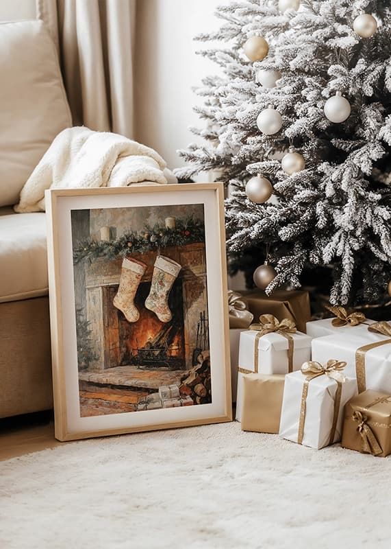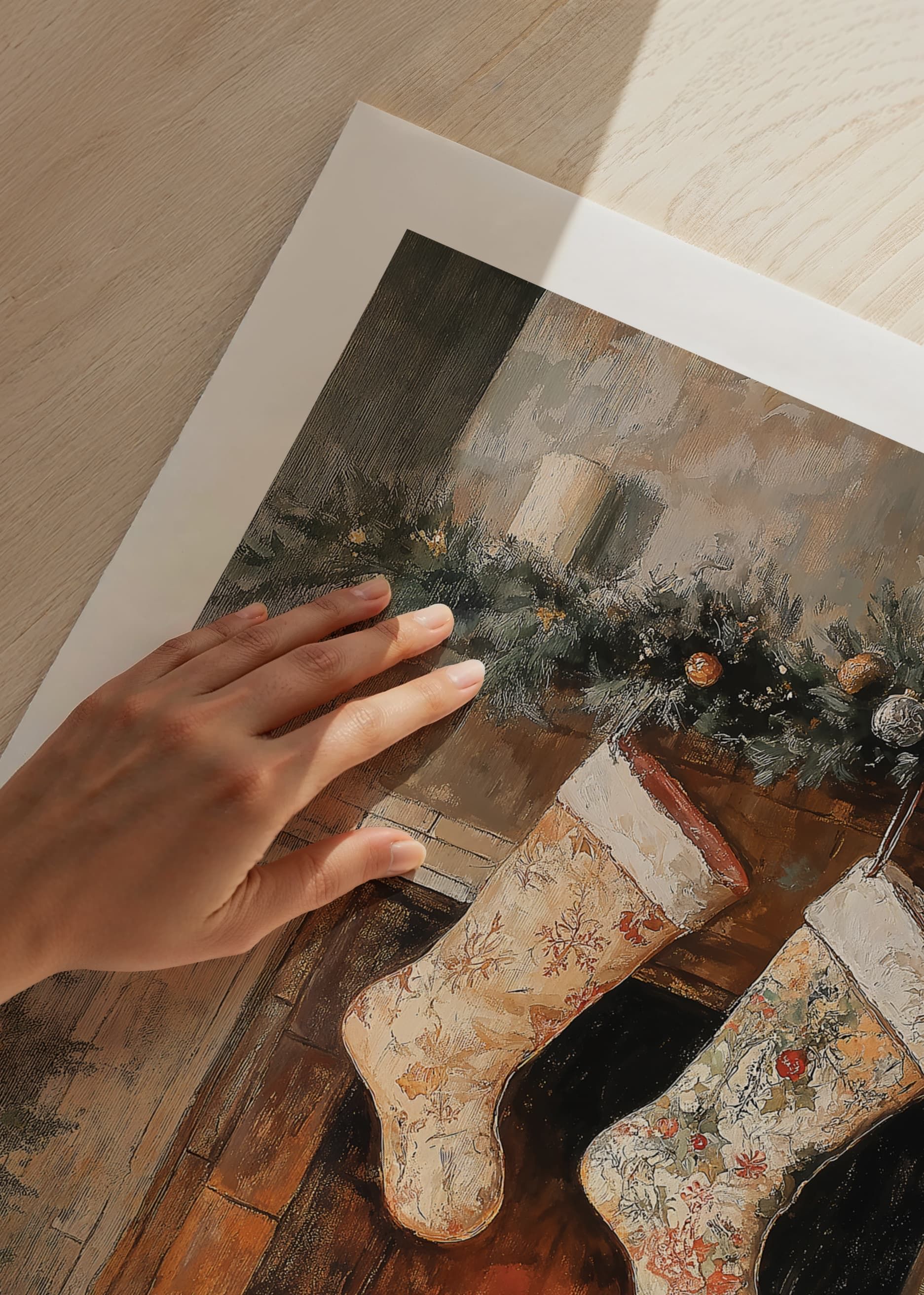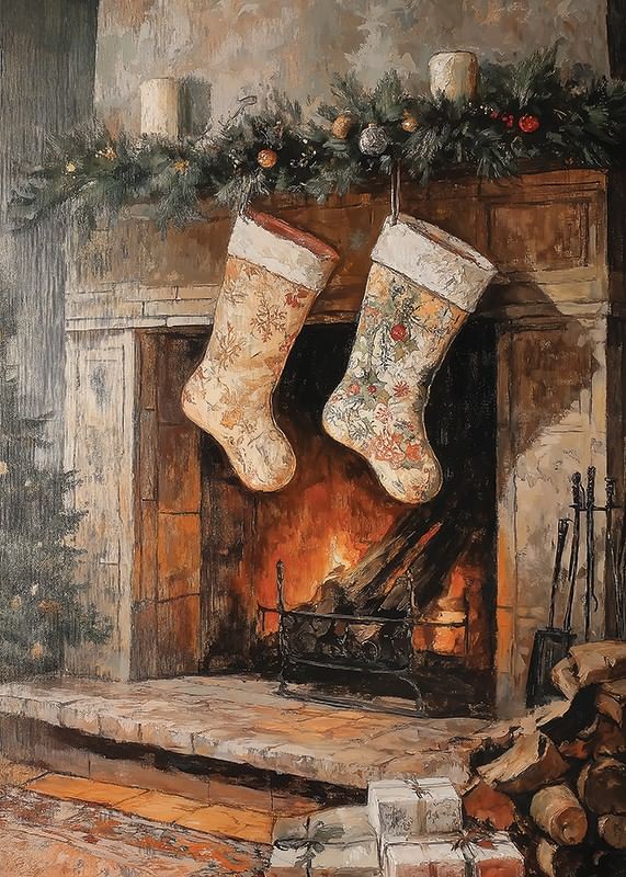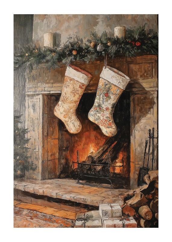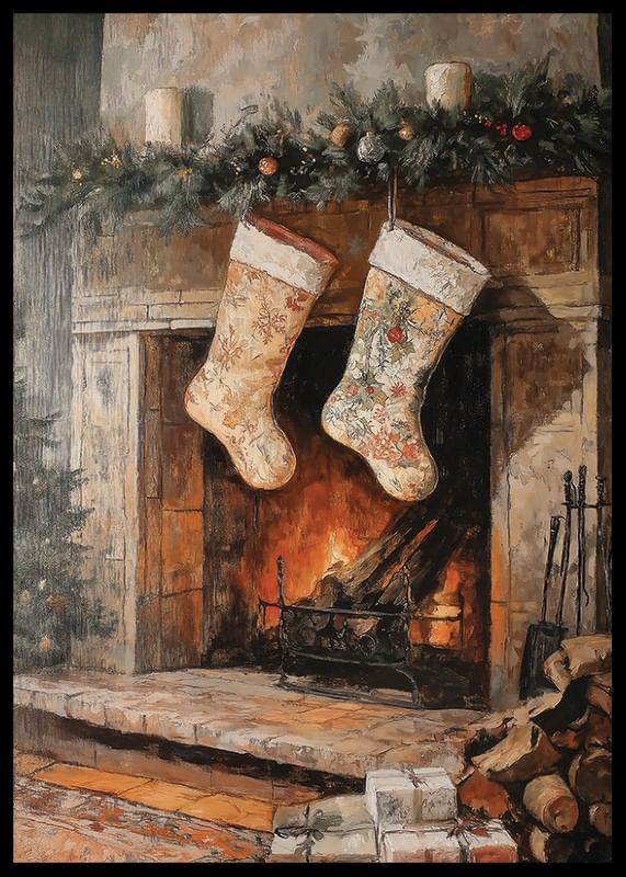 Två julstrumpor med mönster i rött, grönt och gult hänger ovanför en öppen spis där elden brinner. Granris och dekorationer pryder spiselkransen tillsammans med tända ljus. Klappar ligger staplade intill veden på golvet. Motivet ger postern en traditionell julkänsla och passar i hem som vill förstärka säsongens värme.