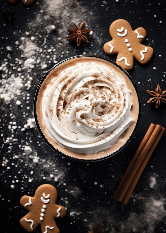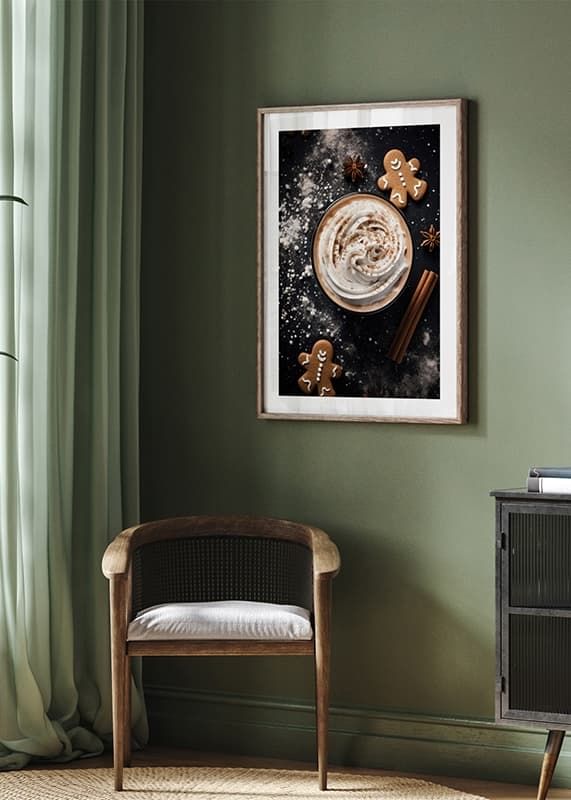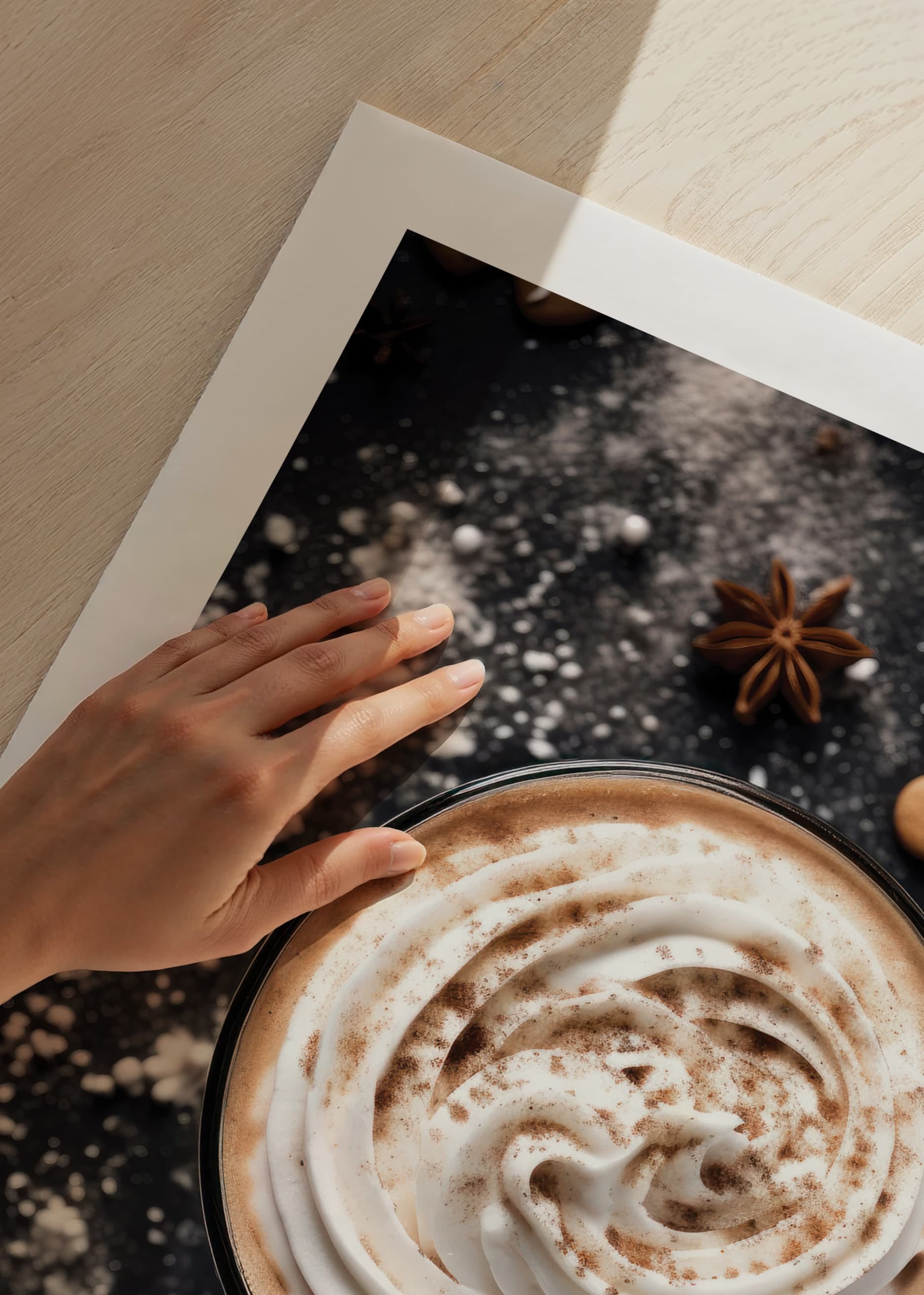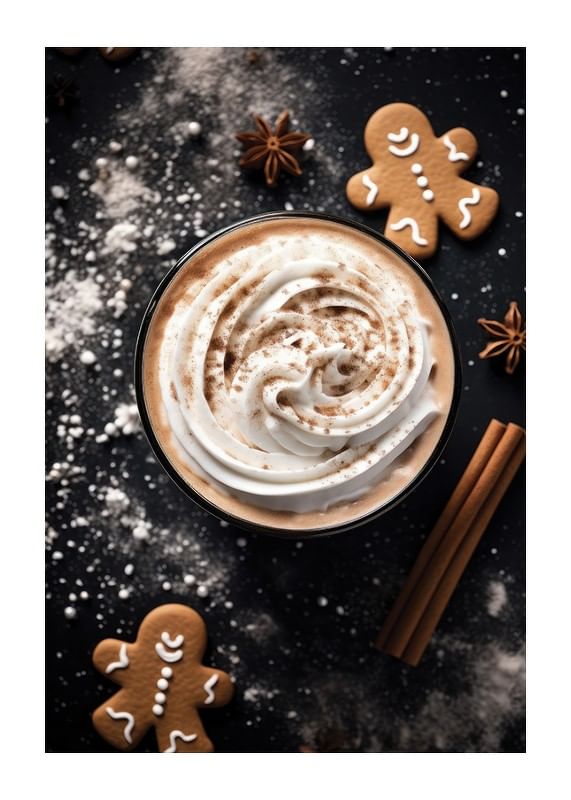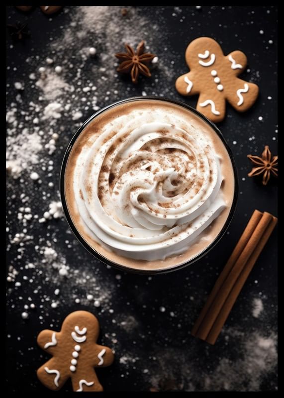 Kaffedryck toppad med generös grädde och ett lätt lager kanel står centrerad mot en mörk bakgrund. Runtom syns pepparkakor formade som små gubbar, kanelstänger och stjärnanis, samt stänk av mjöl. Med sina varma toner och klassiska juldetaljer ger postern ett festligt tillskott till köket under vintern.