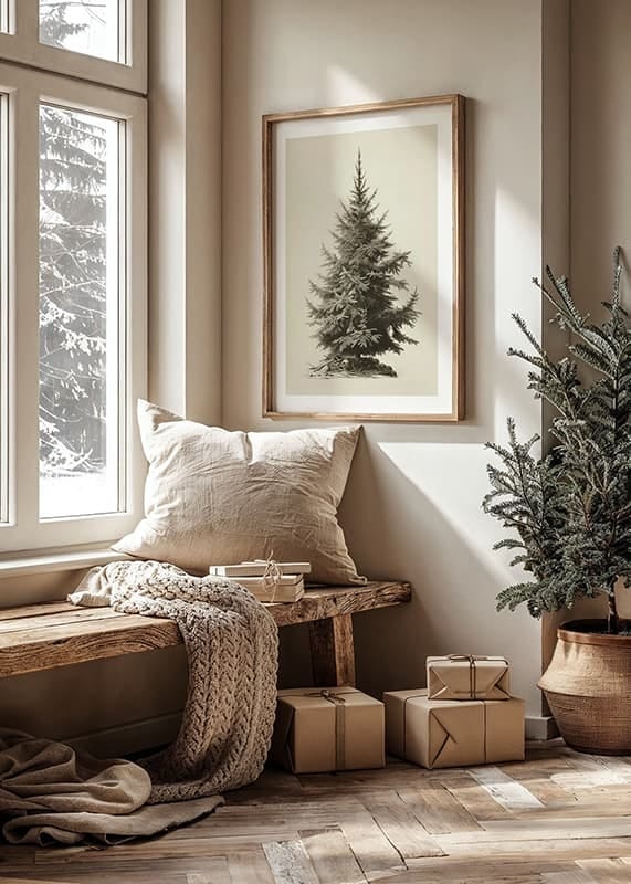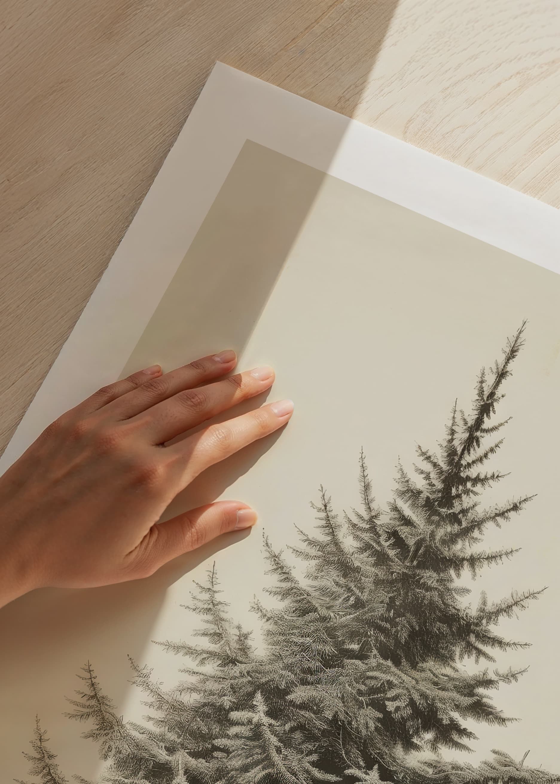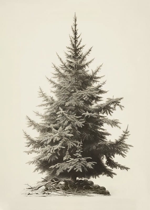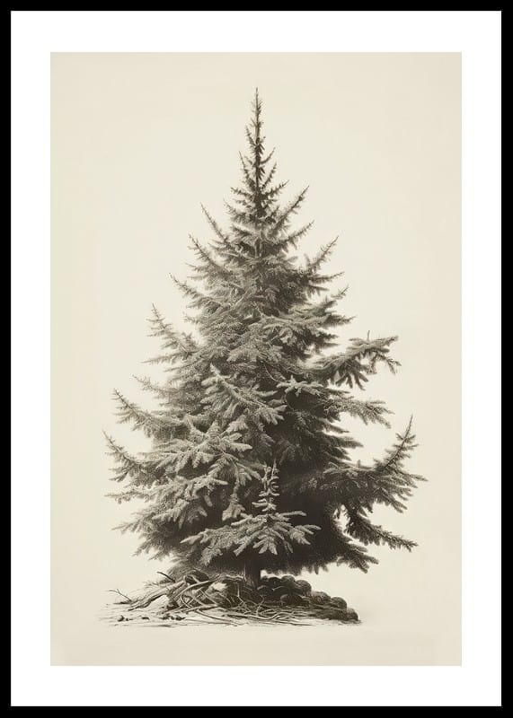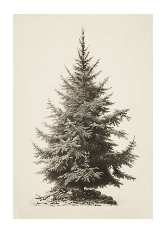 Mitt i motivet står en ståtlig gran med frodiga barr och tydliga grenar, illustrerad i en tidstypisk vintagestil. De naturliga detaljerna är varsamt återgivna och trädet vilar mot en ljus, enkel bakgrund. Denna poster ger ett klassiskt vintertema och passar bra i hem som vill förmedla en traditionell julkänsla.