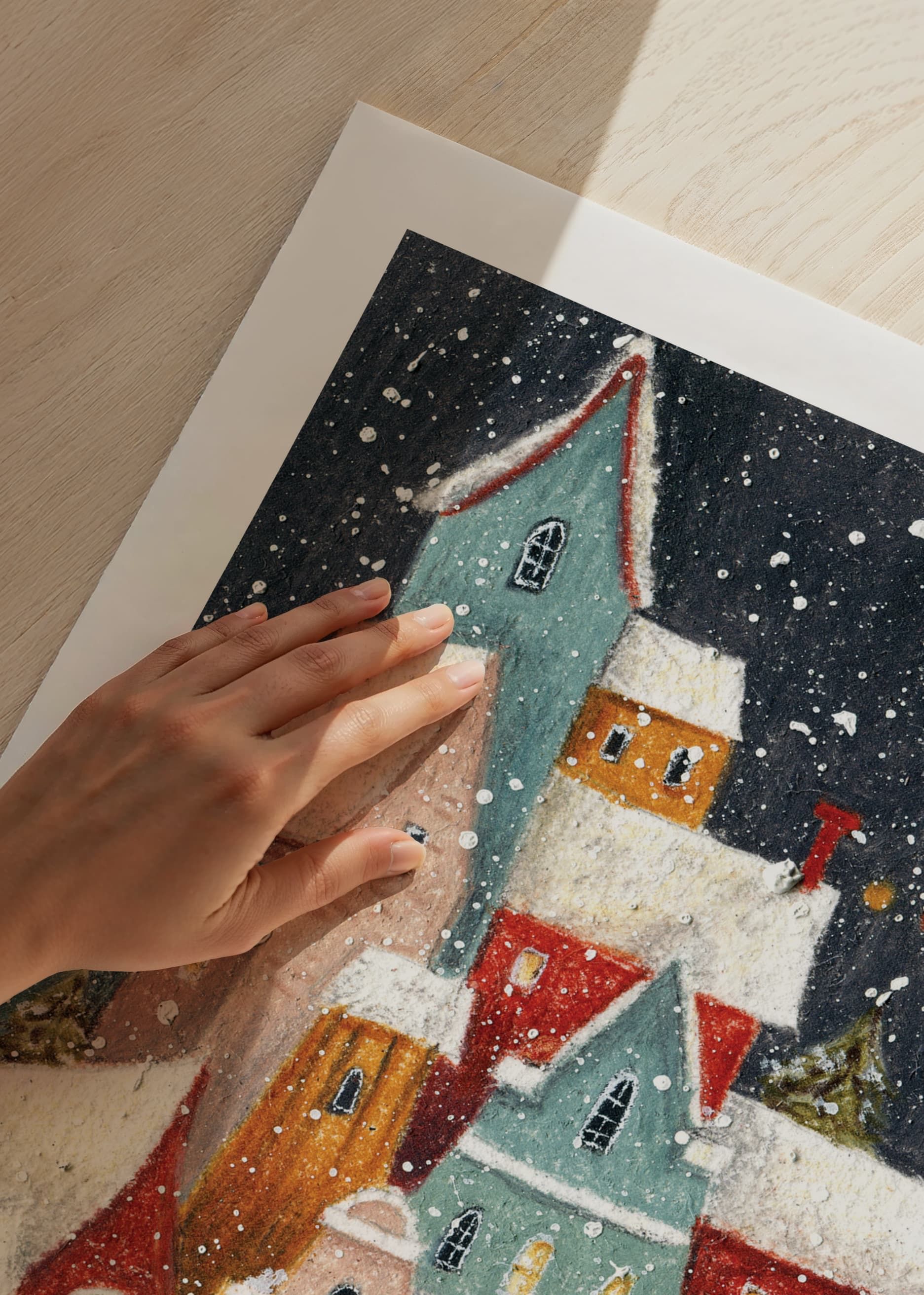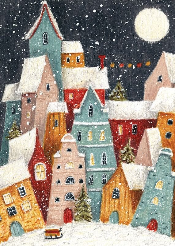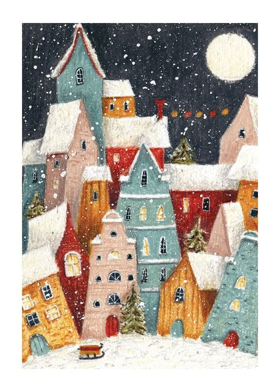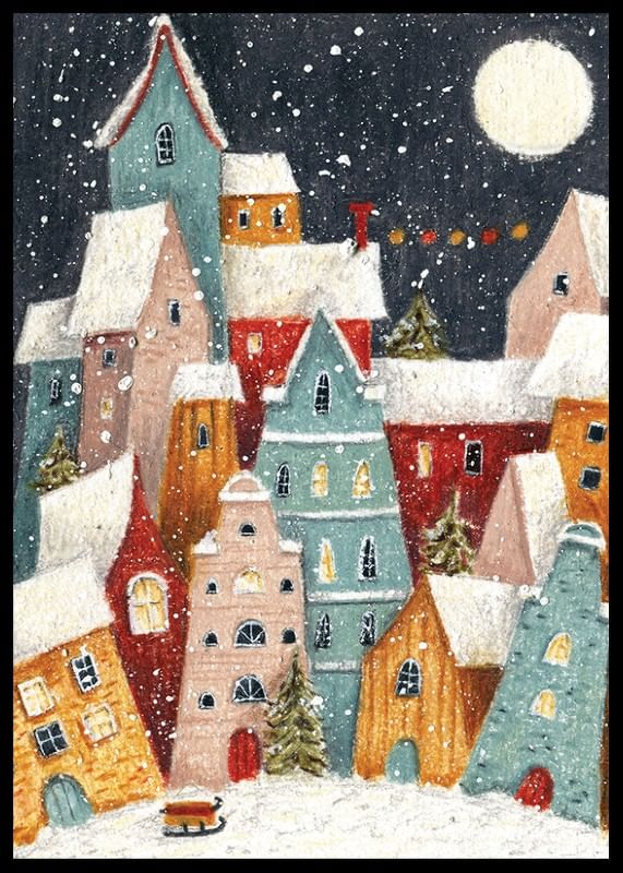 Flerfärgade hus med snötäckta tak samlas nära varandra under ett mörkt himlavalv med fullmåne och virvlande snöflingor. Små fönster lyser varmt, granar syns mellan byggnaderna och en släde står i förgrunden. Denna poster ger en lekfull och vintrig stämning som passar bra i hall eller barnrum.