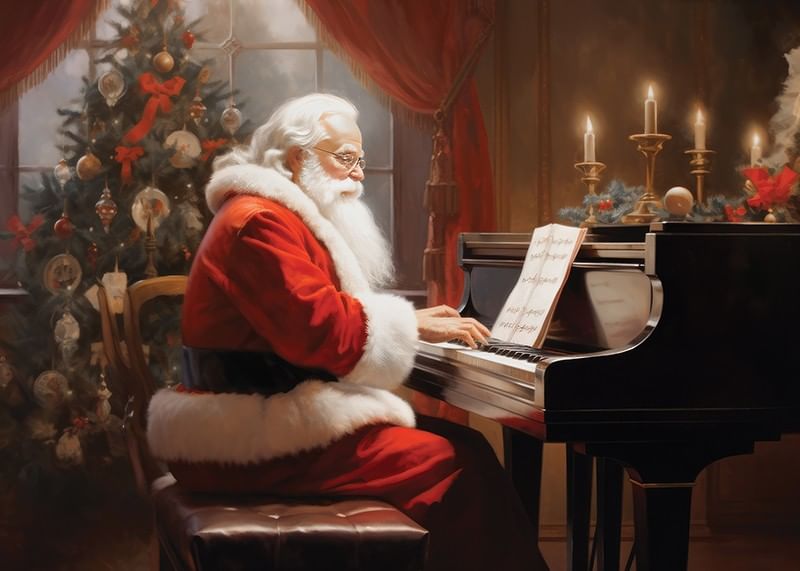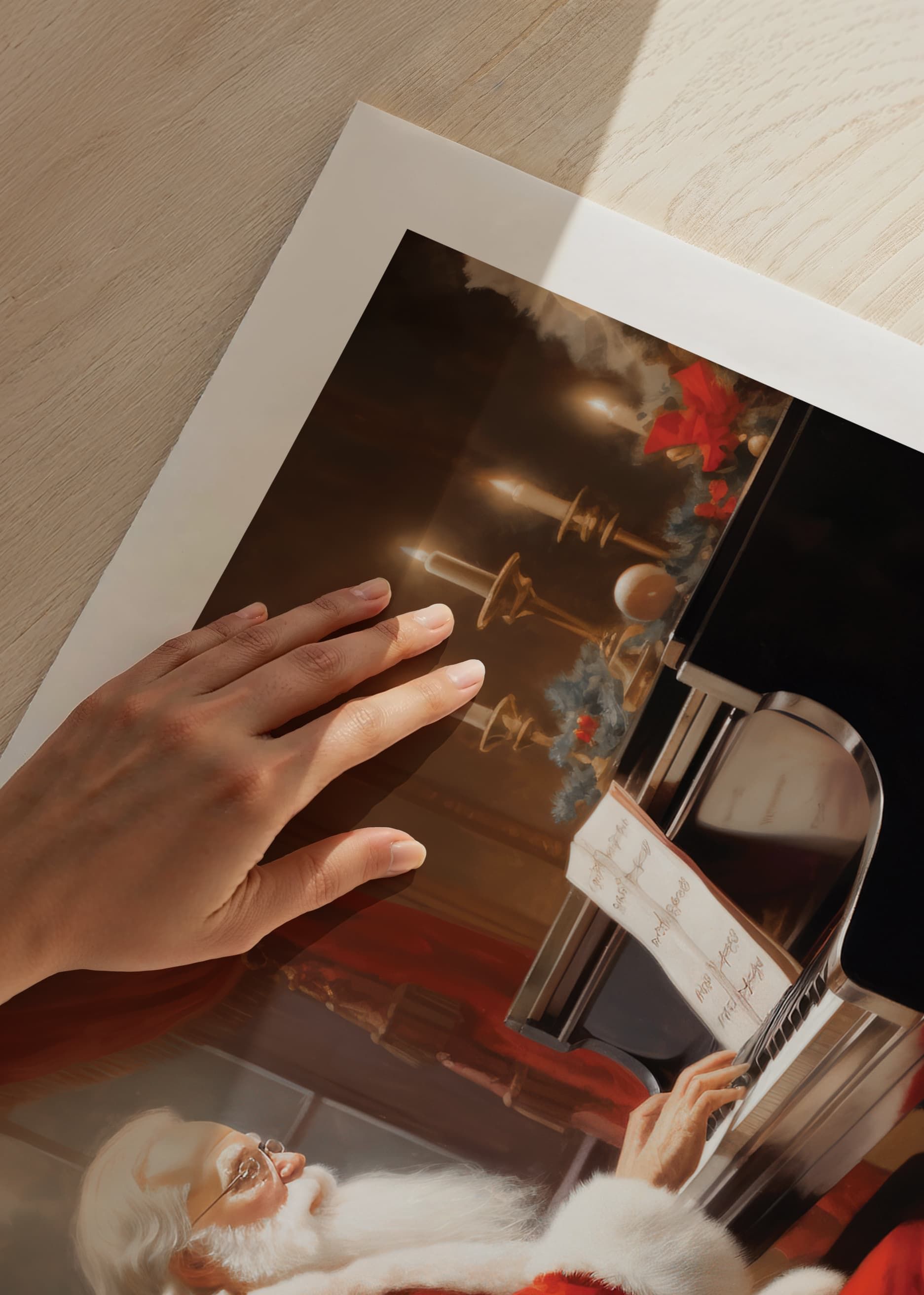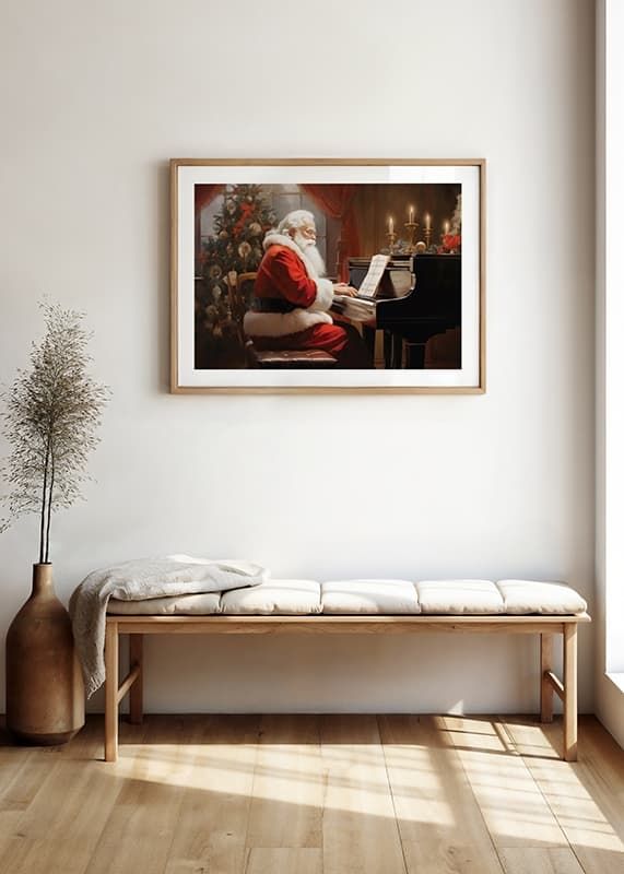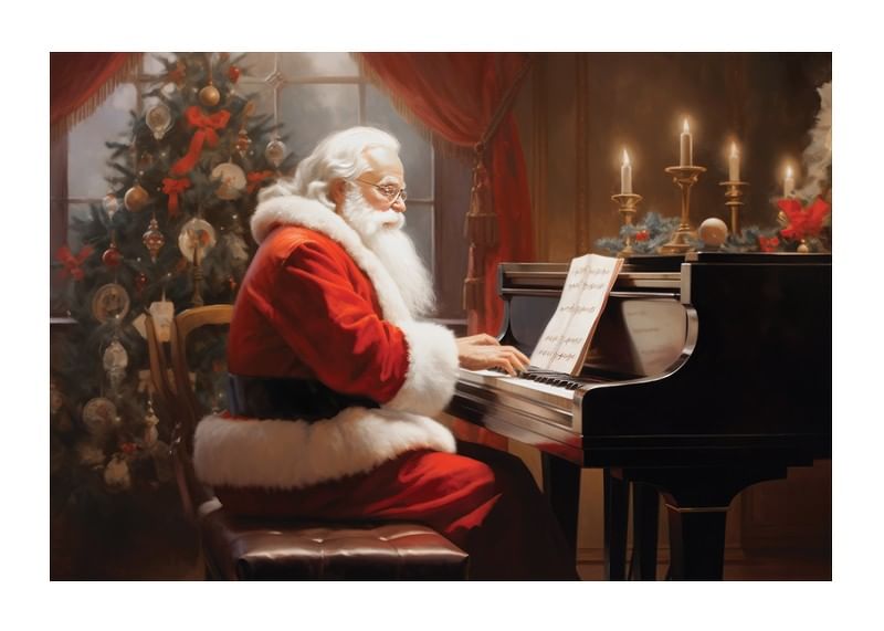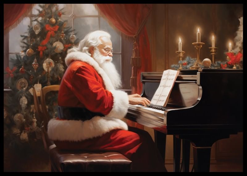 Motivet visar en tomte i klassisk röd dräkt som sitter vid ett svart piano och spelar med notblad framför sig. I bakgrunden syns en dekorerad julgran samt ett fönster med röda gardiner, och flera tända ljus står på pianot. Denna poster passar i vardagsrum eller musikrum för en stämningsfull julkänsla.