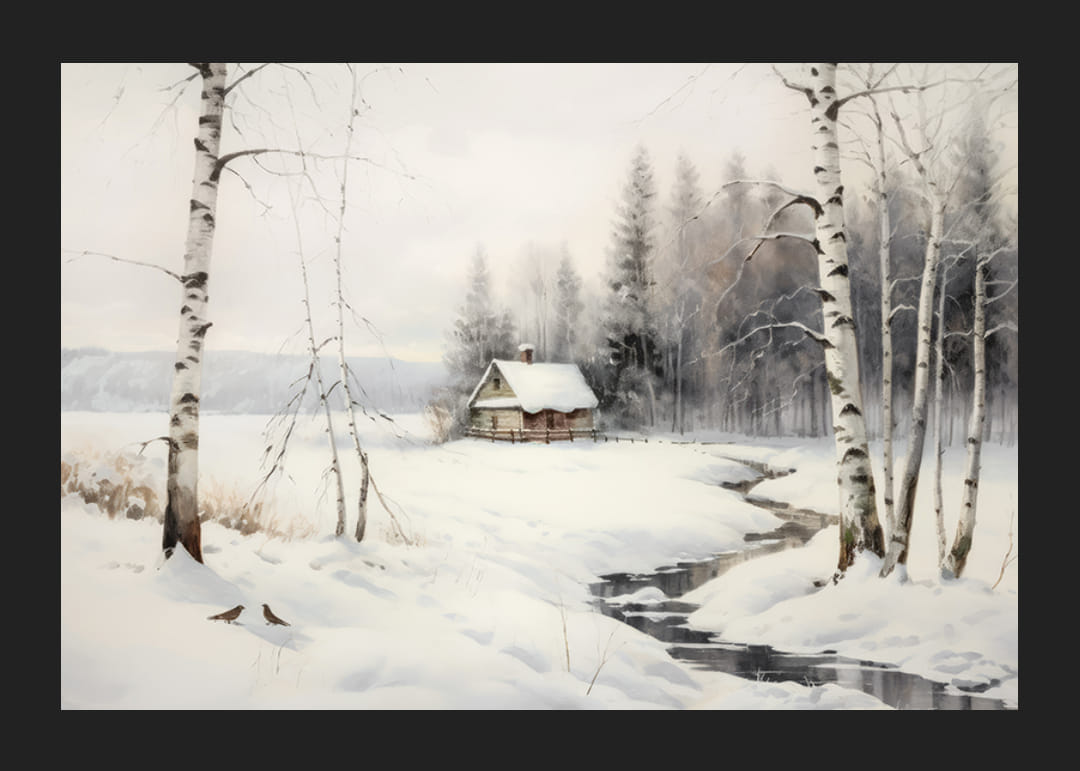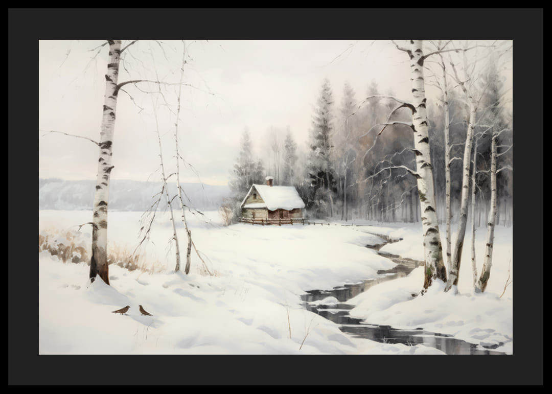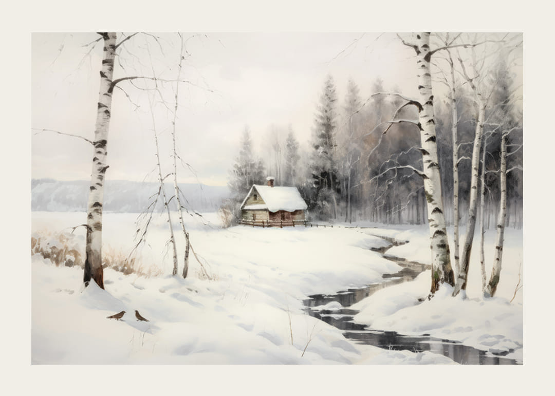 Motivet består av en liten trästuga med snötäckt tak omgiven av björkar och höga granar. En slingrande bäck skär genom det vita snötäcket, och några småfåglar syns längs kanten. Ljusa, dämpade färger skapar ett stillsamt intryck. Denna poster passar fint i rum där en vinterkänsla eftersträvas.