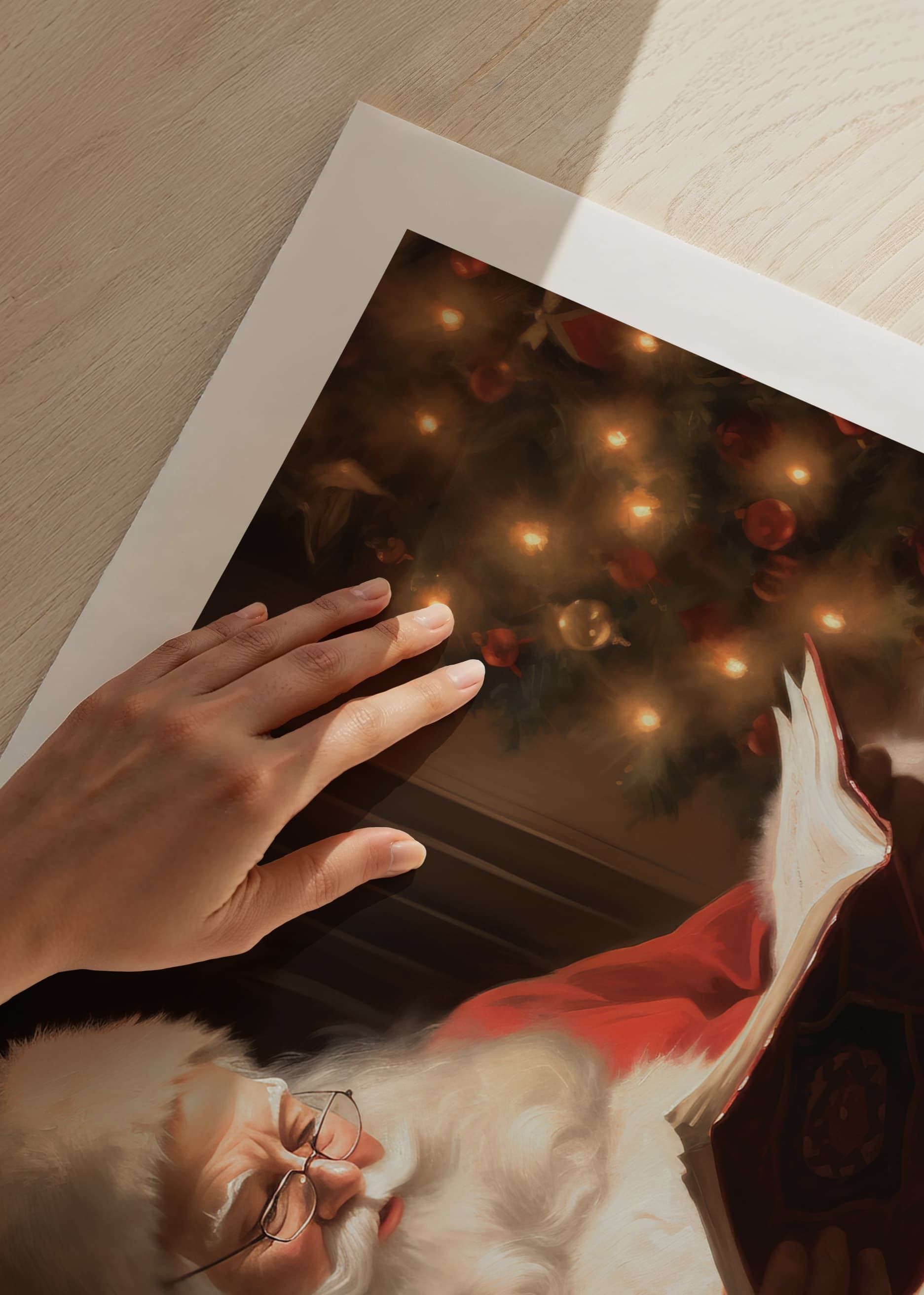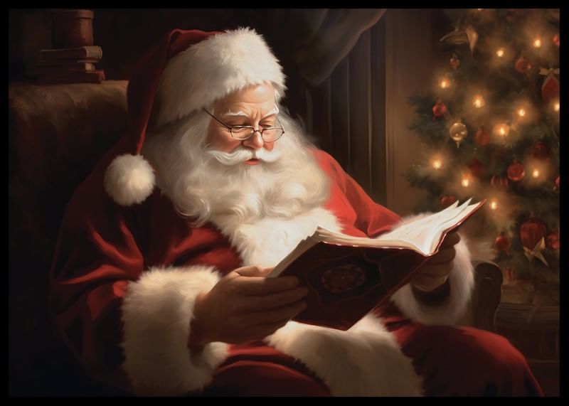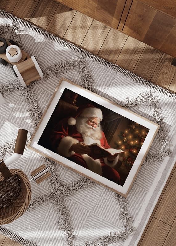 Jultomten sitter bekvämt i en fåtölj och läser en bok, omgiven av varm belysning från en dekorerad julgran i bakgrunden. Den klassiska röda dräkten och de vita detaljerna framträder tydligt mot mörkare toner och mjuka skuggor. En poster som förhöjer den traditionella julstämningen i vardagsrum eller hall.