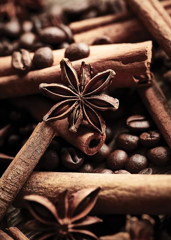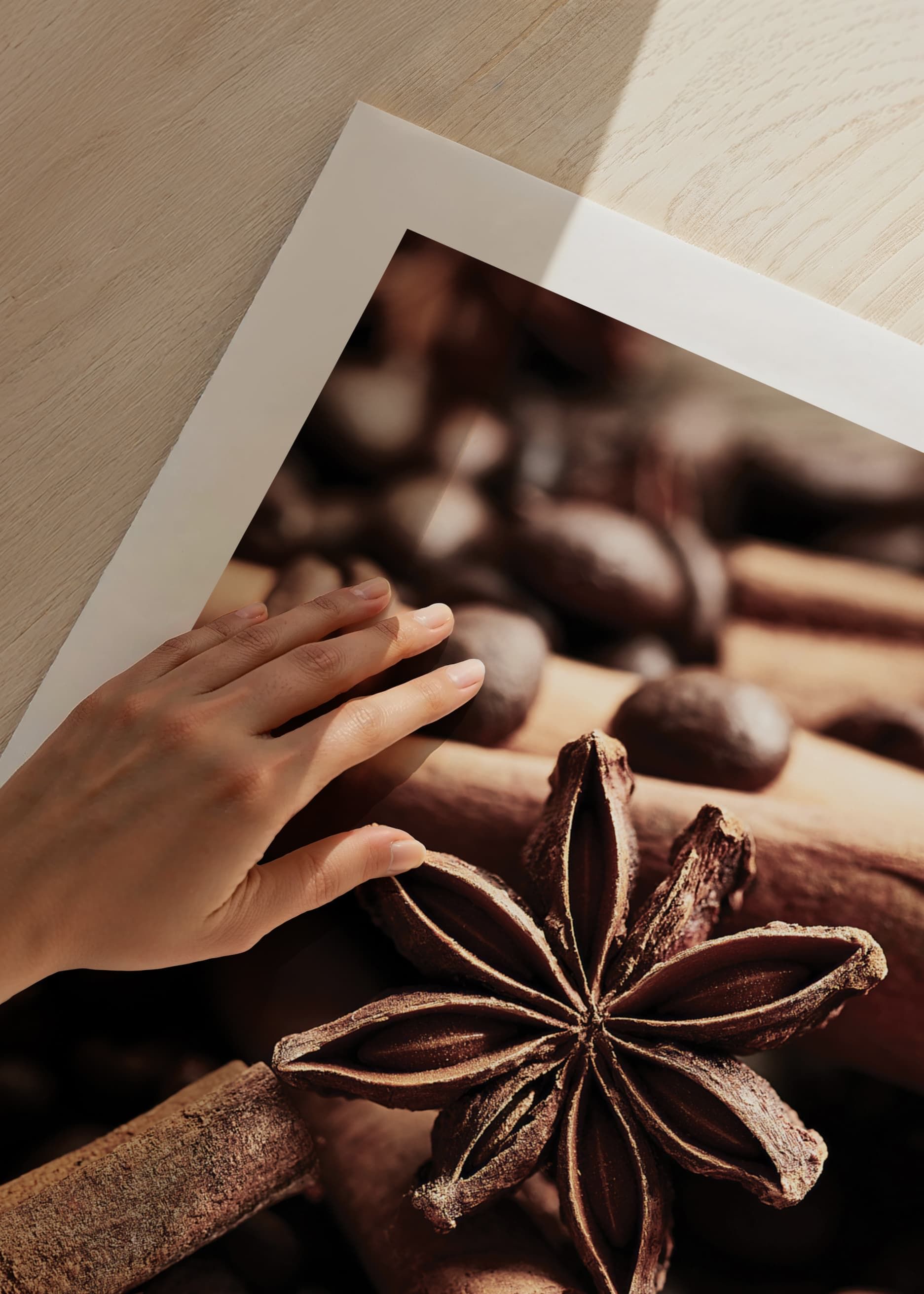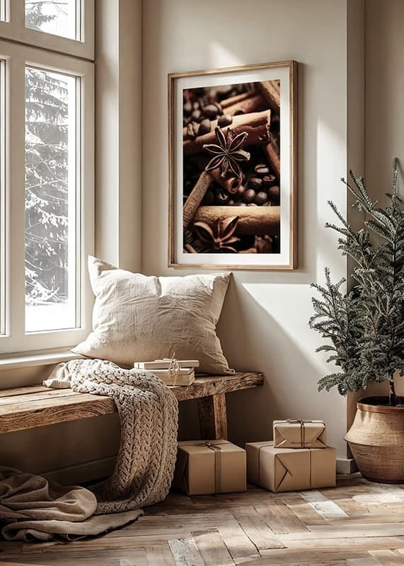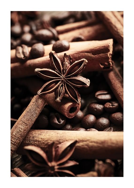 Närbild av kanelstänger och stjärnanis bland mörka kaffebönor, fångade i varma bruna toner. De tydliga texturerna och den mjuka ljussättningen skapar ett inbjudande och ombonat intryck. Denna poster ger kök eller caféhörna en smakfull detalj som framhäver intresset för matglädje och kryddor.