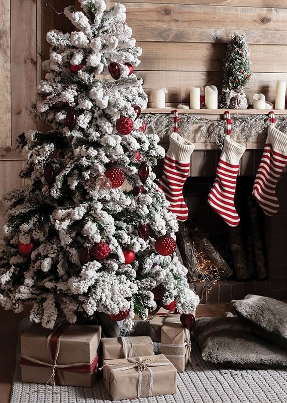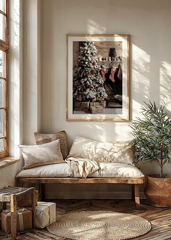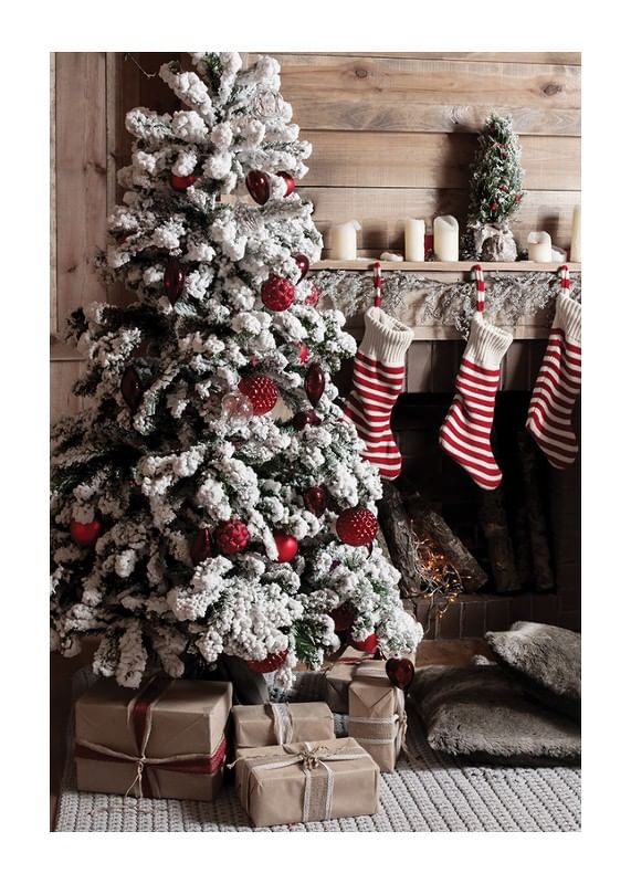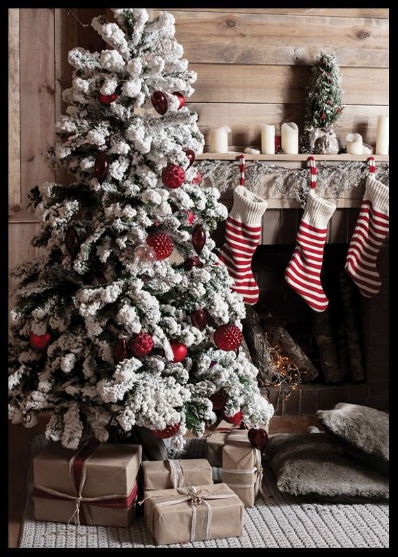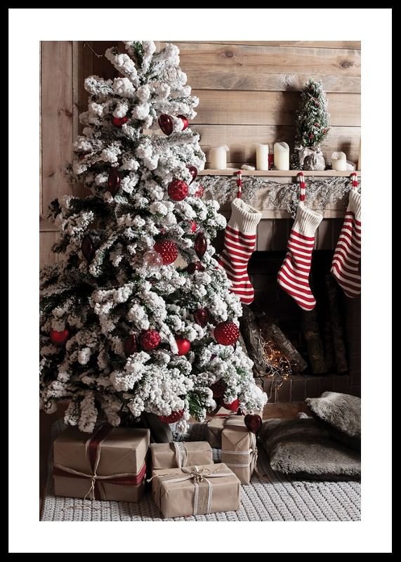 Snötäckt julgran dekorerad med röda kulor står vid en rustik öppen spis, där röda och vita randiga julstrumpor hänger. Under granen ligger inslagna paket i bruna papper bredvid mjuka plädar. En tidlös poster som skapar en varm atmosfär och lyfter julkänslan i vardagsrum eller hall.