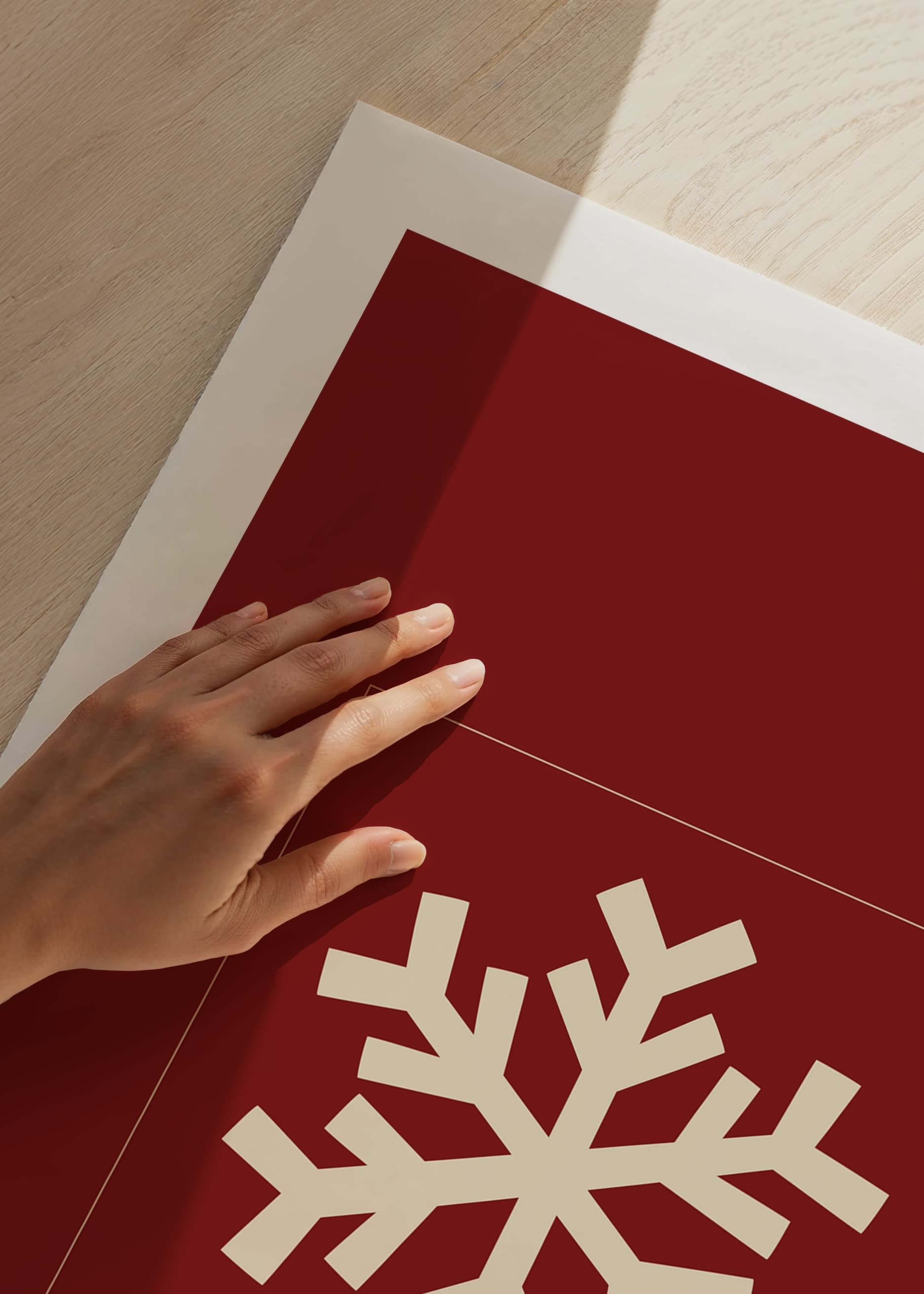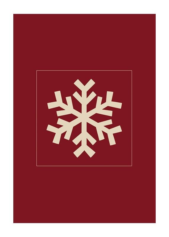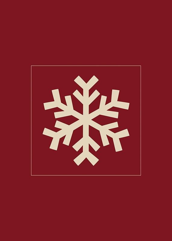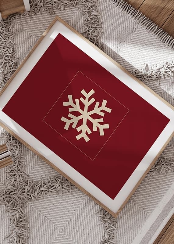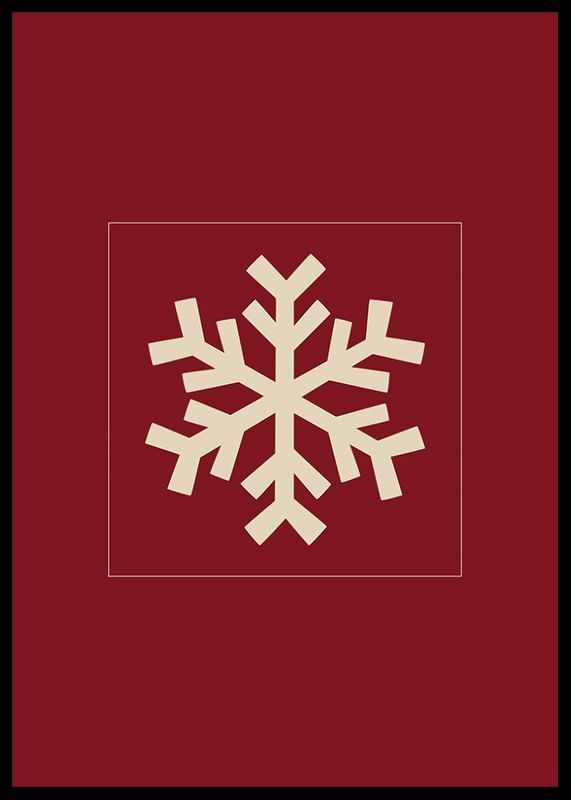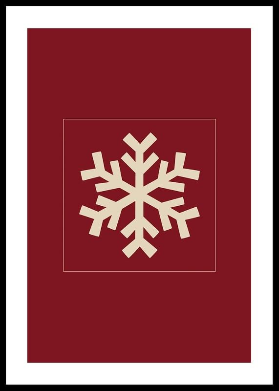 Motivet består av en stiliserad snöflinga i beige, placerad centralt mot en mörkröd, enfärgad bakgrund. Den grafiska formen ger ett modernt och vintrigt uttryck som passar för säsongens dekorationer. Denna poster tillför en diskret julkänsla till exempelvis hall eller vardagsrum.