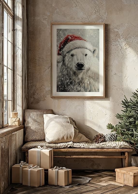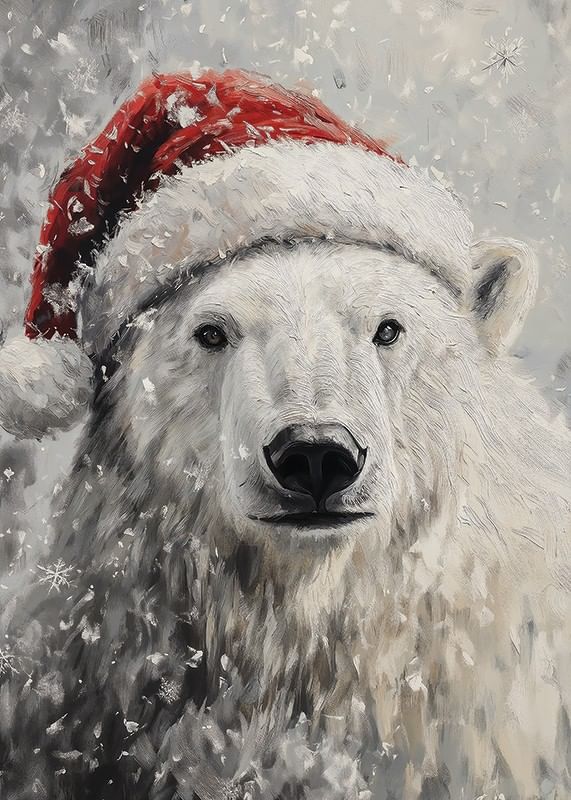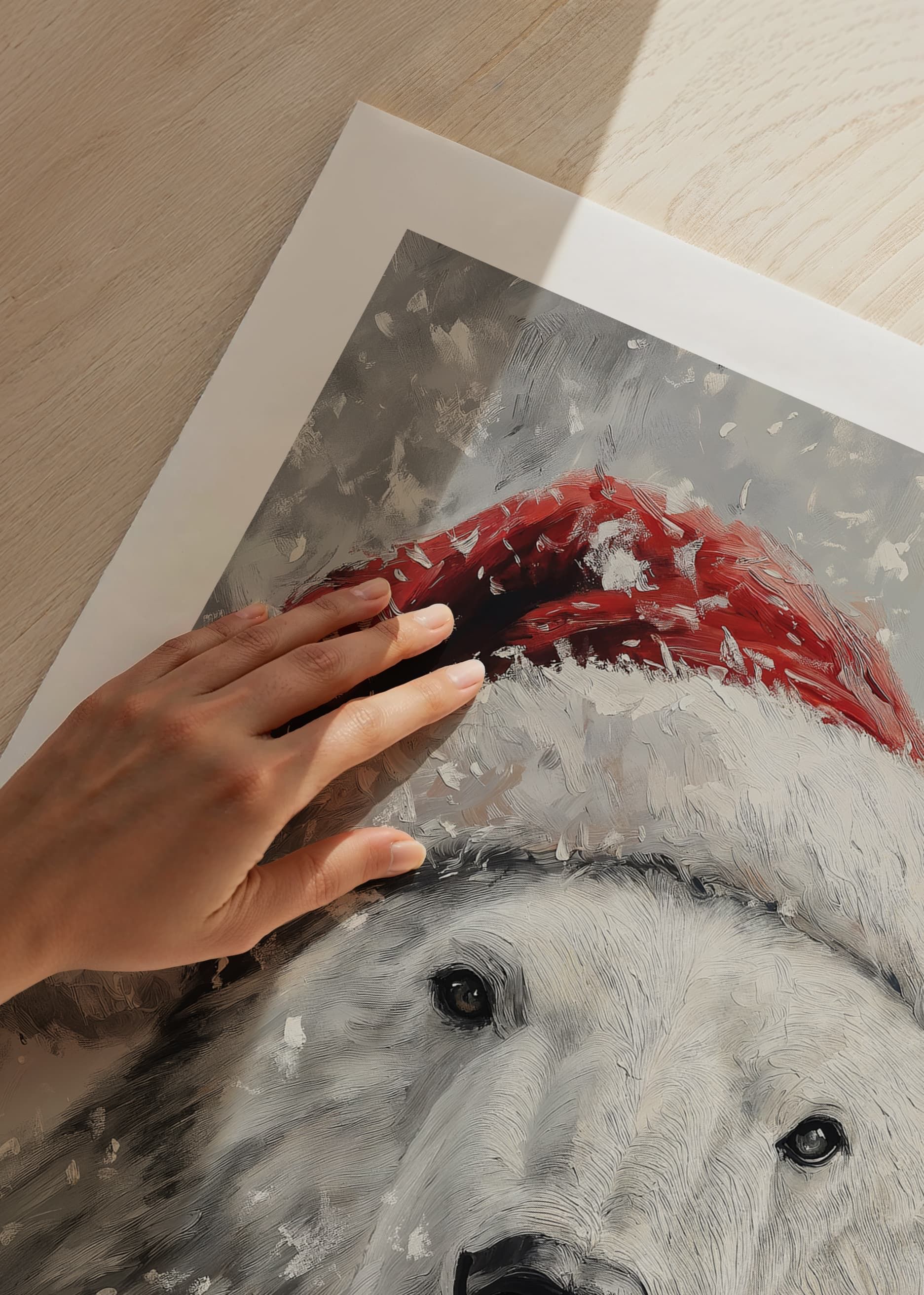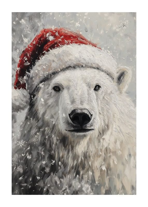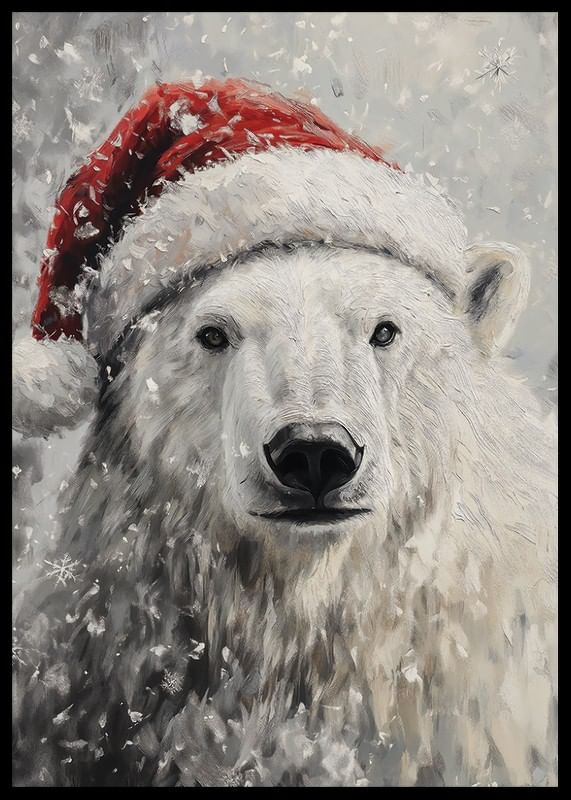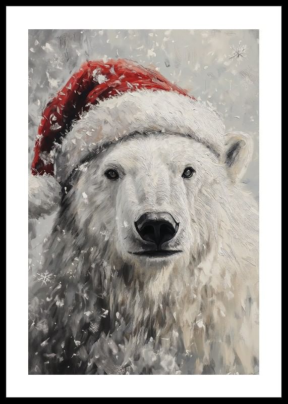 Närbild av en isbjörn med vit päls och svart nos, klädd i röd tomteluva med vit kant. Bakgrunden är ljust grå med virvlande snöflingor som skapar ett vintrigt intryck. Den här postern förmedlar både arktisk natur och julstämning, och passar fint i hall eller vardagsrum under vintertid.
