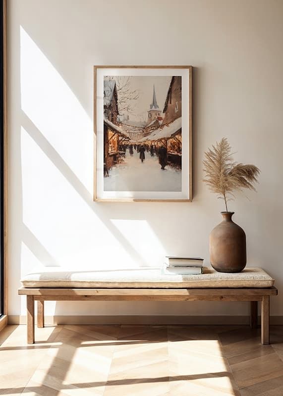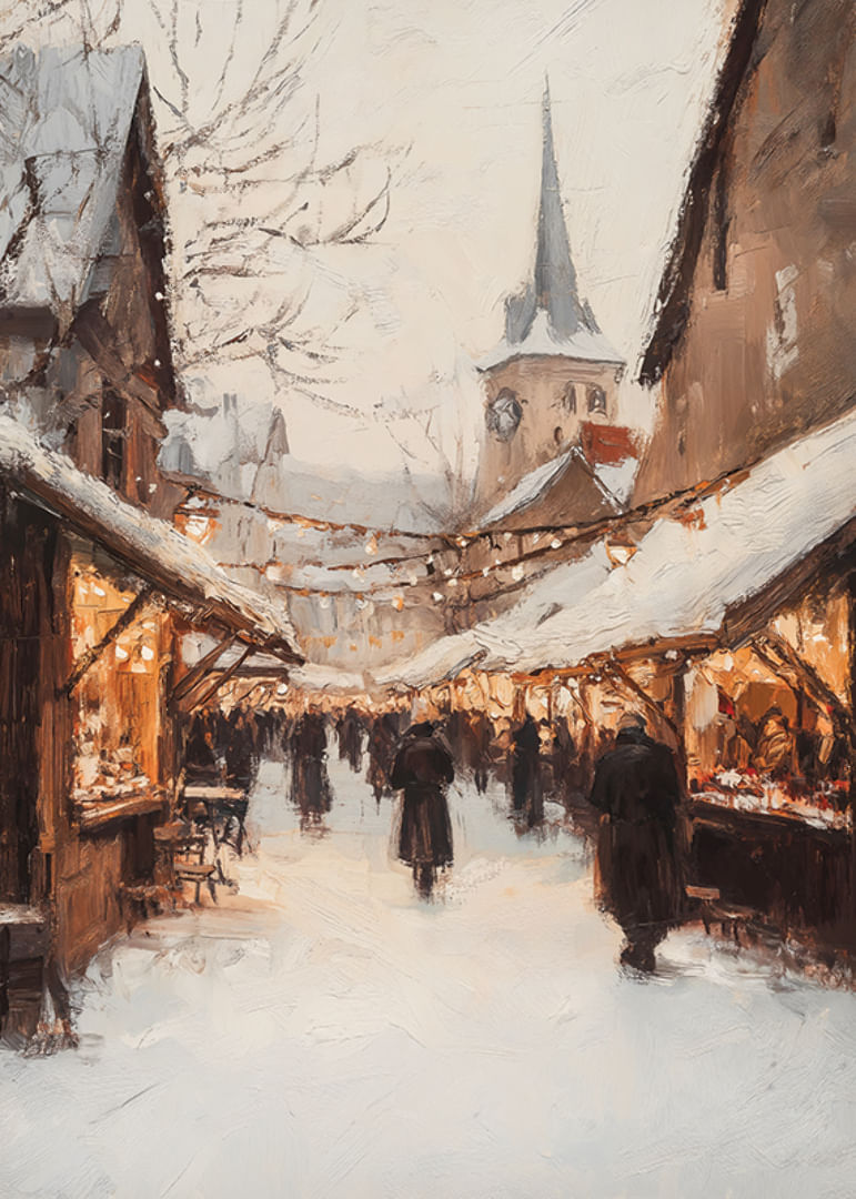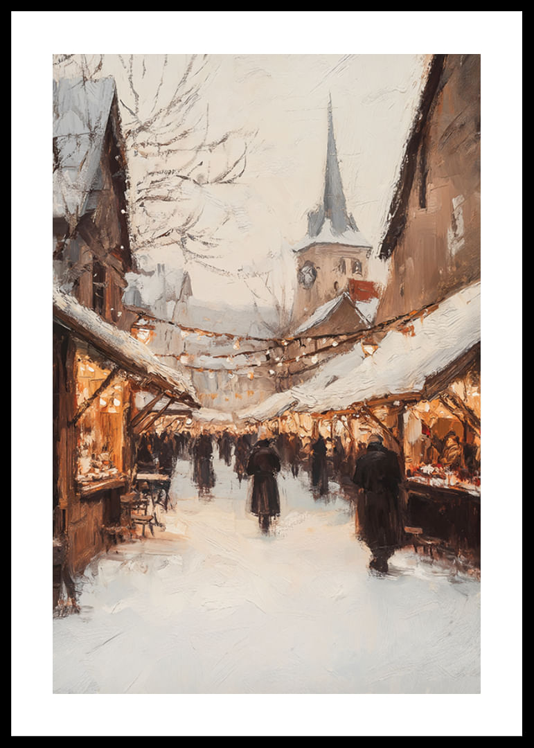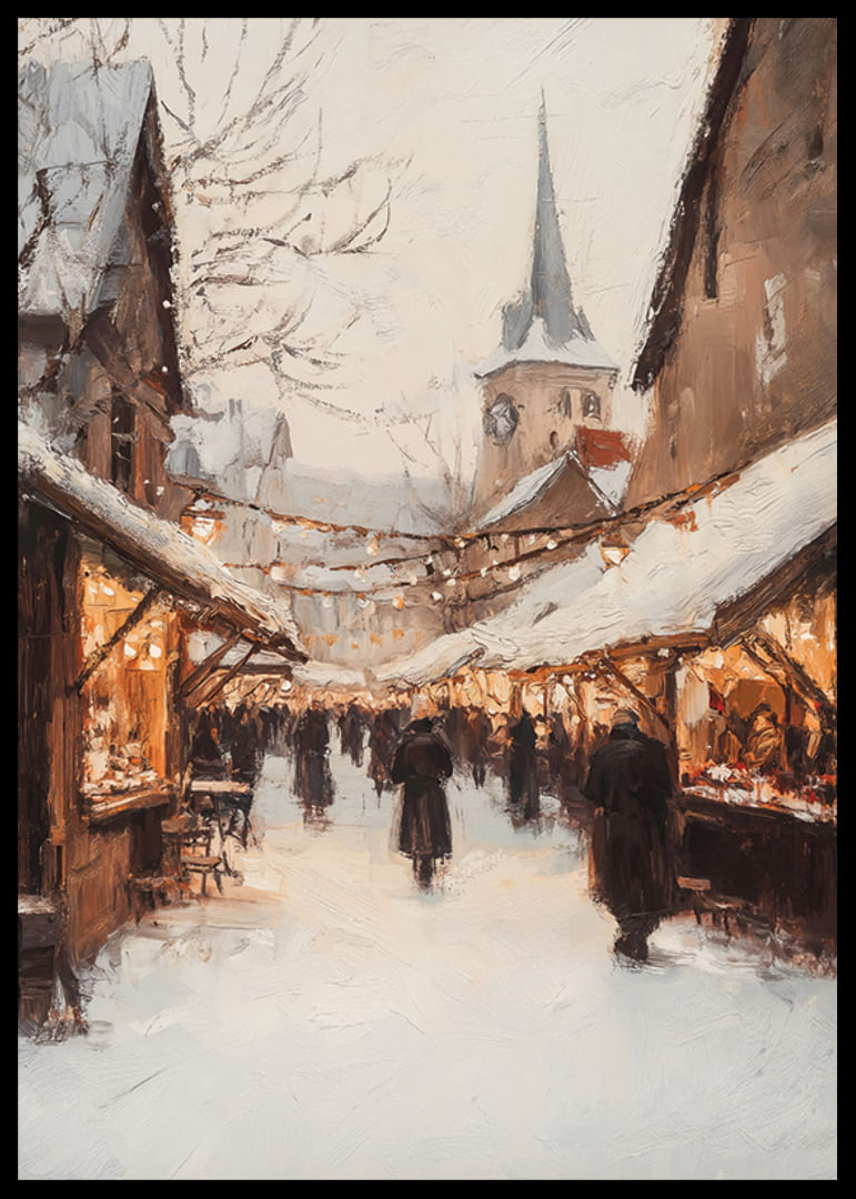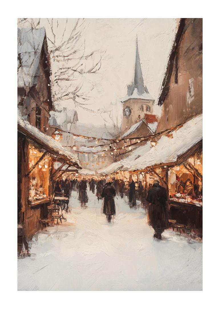 Snötäckta träbodar upplysta av varma ljusslingor ramar in en gågata där människor promenerar bland hantverk och godsaker. I bakgrunden syns en kyrkspira mot vinterhimlen och svagt snöklädda träd. Den här postern ger en klassisk vintrig känsla och passar fint i hall eller vardagsrum.