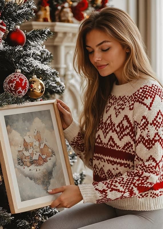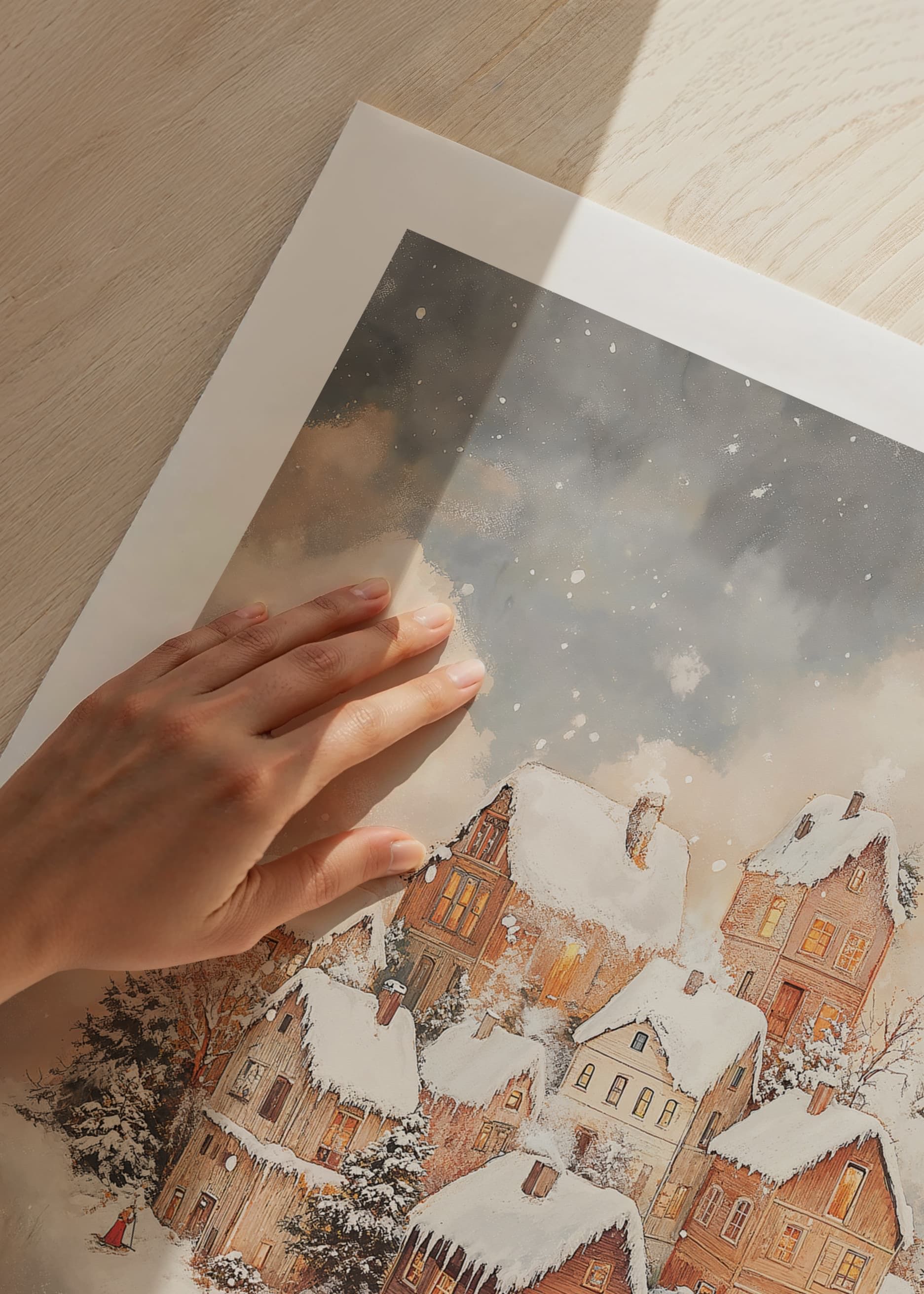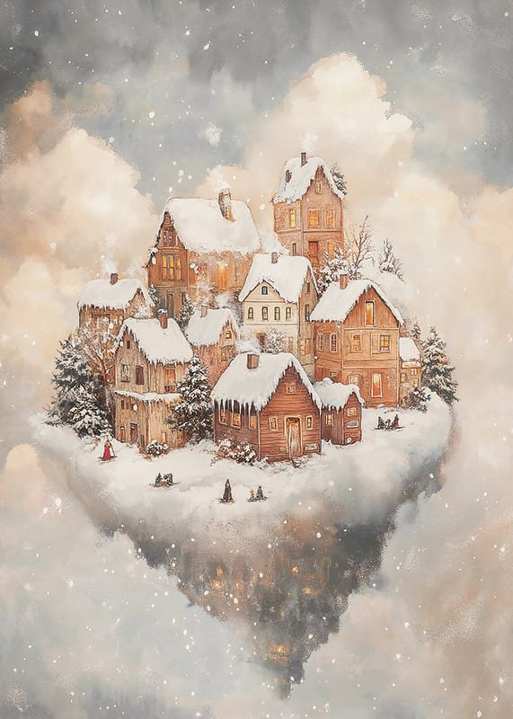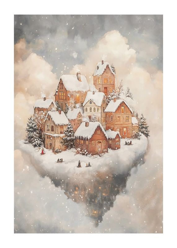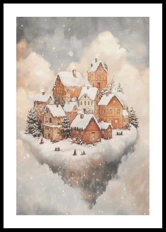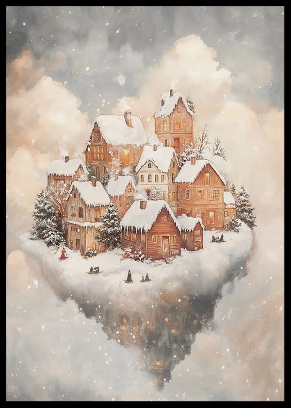Ett kluster av små trähus med snötäckta tak svävar högt bland mjuka moln. Varma ljus lyser inifrån fönstren och granar står kring byggnaderna, medan snöflingor sakta faller mot marken. Denna poster skapar en vintrig stämning och passar fint i barnrum eller vid säsongsbetonad inredning.