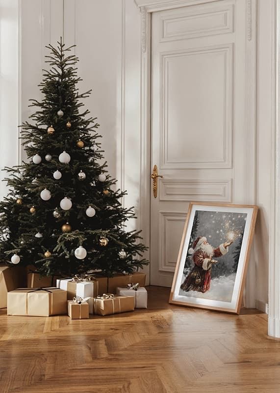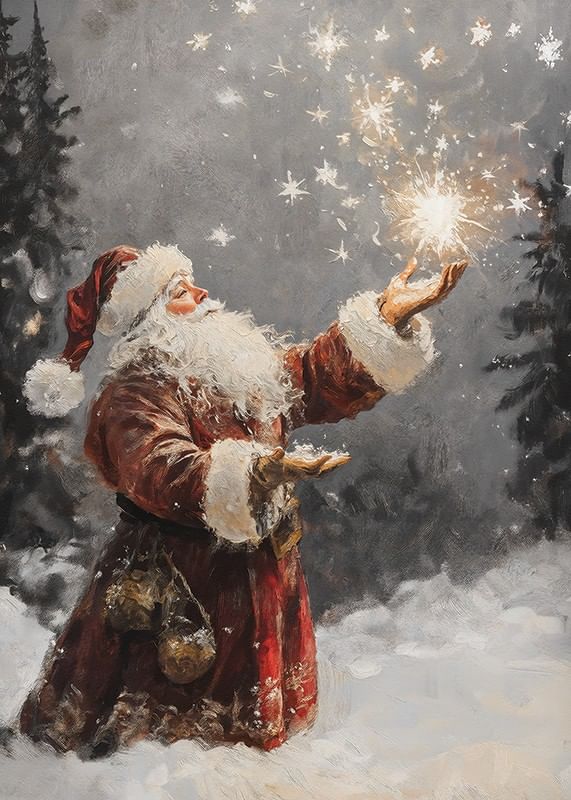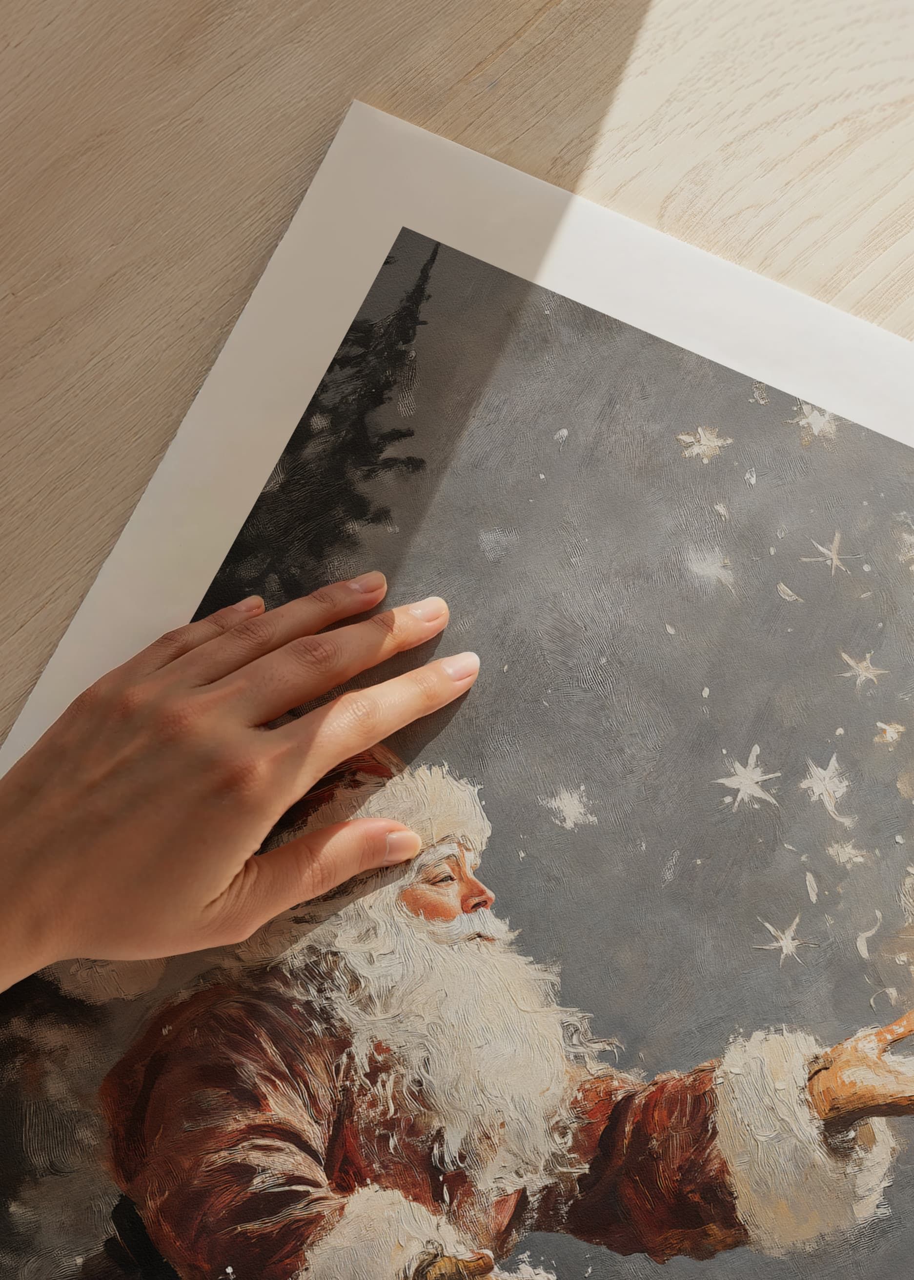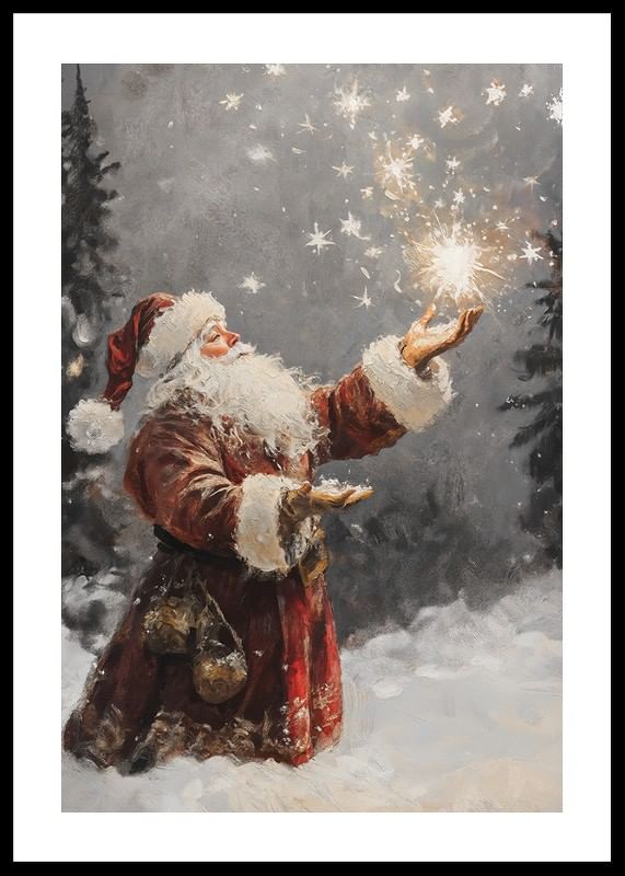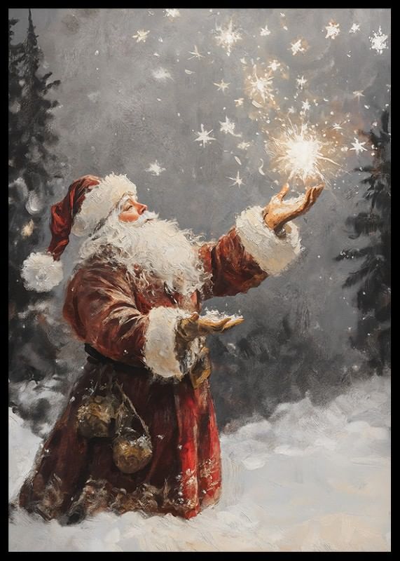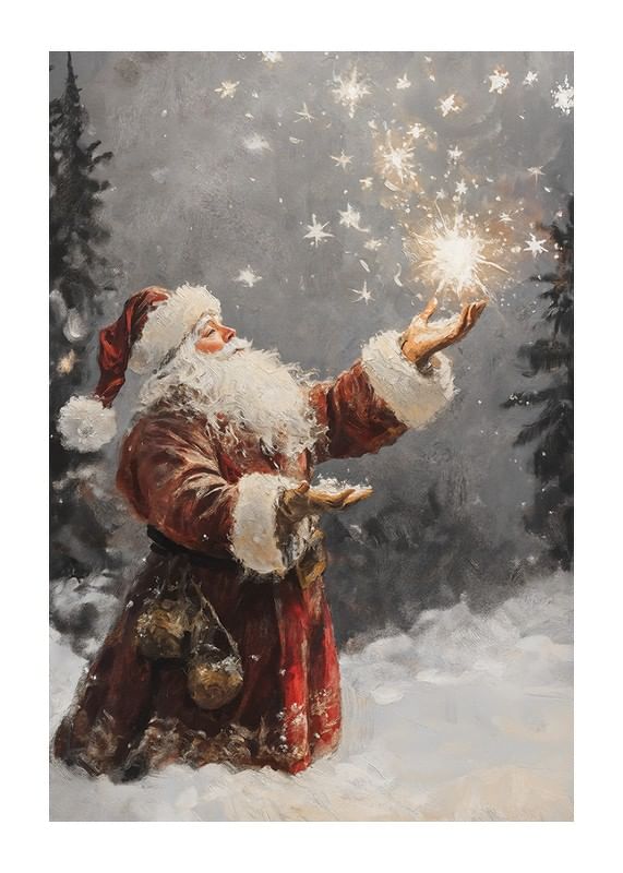 Tomte i klassisk röd dräkt står i snö omgiven av mörka granar, med ansiktet vänt mot natthimlen och händerna lyfta mot svävande, lysande stjärnor. Målade penseldrag och dova vinterfärger ger en tidlös känsla. Denna poster tillför varm julstämning till hemmets sällskapsrum eller hall.