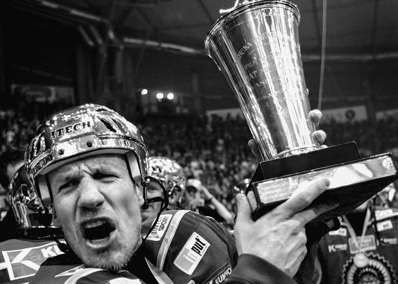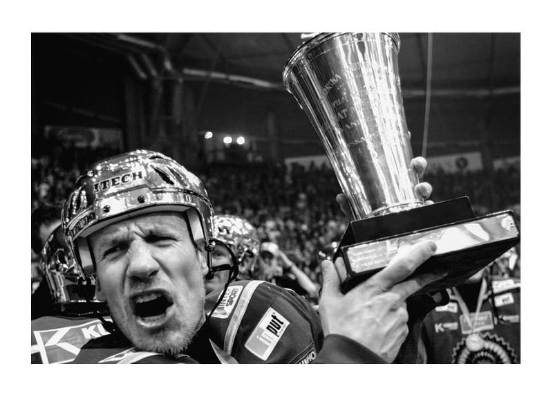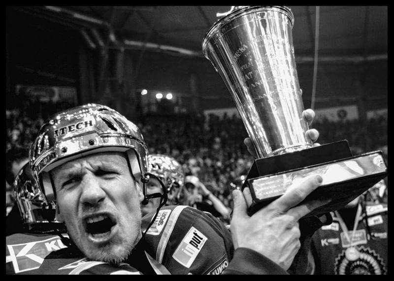Niklas Andersson lyfter bucklan efter seger i final 5 mot Färjestad BK den 11 april 2005.