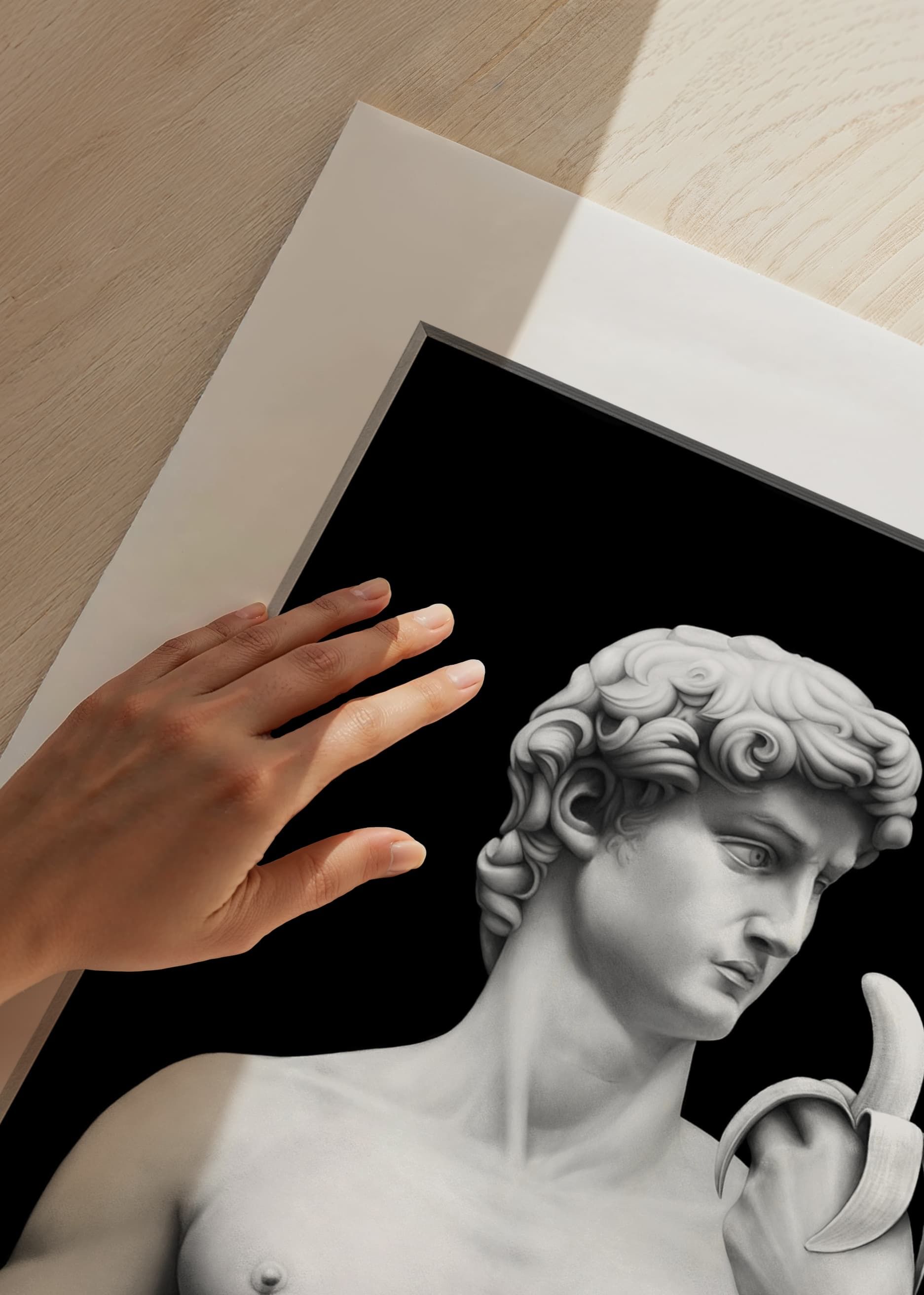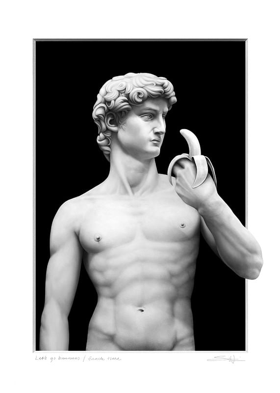 Motivet visar Michelangelos Davidsstaty tolkad i detaljrik blyertsstil, där figuren humoristiskt håller en skalad banan i handen mot svart bakgrund. Kontrasten mellan klassisk skulptur och modern vardagsdetalj ger ett samtida uttryck i den svenska konstnären Sanna Wieslanders karakteristiska stil som kombinerar konsthistoriska referenser med surrealistisk humor och lekfulla tolkningar.
