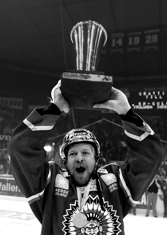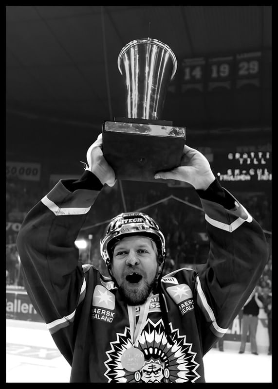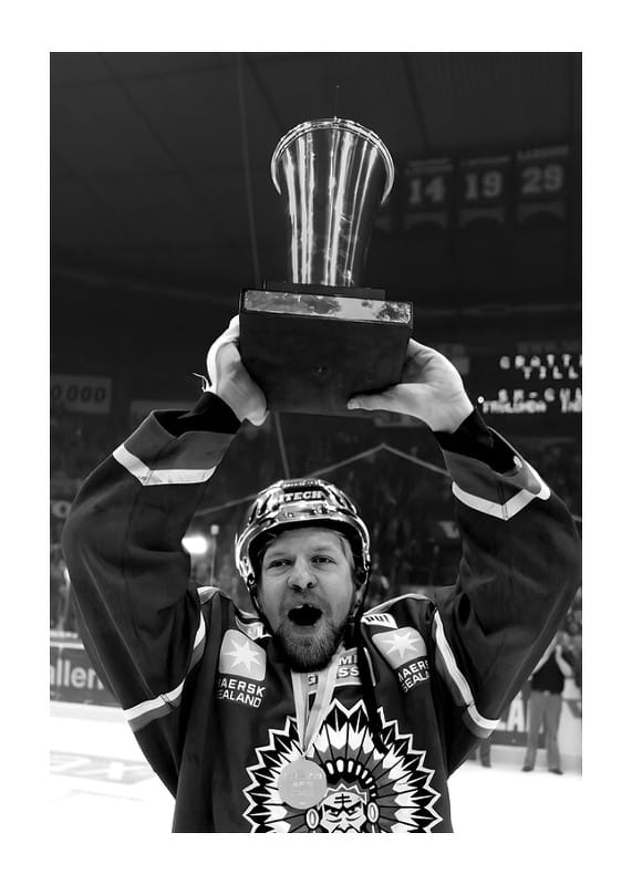 Frölundas Tomi Kallio lyfter bucklan efter seger i SM.finalen mot Färjestad BK år 2003.