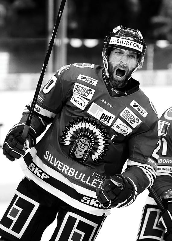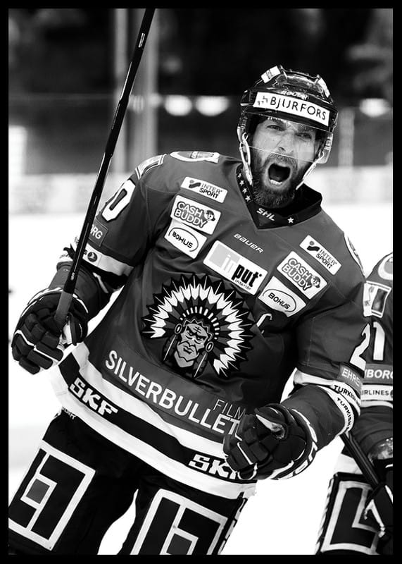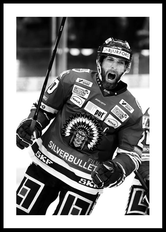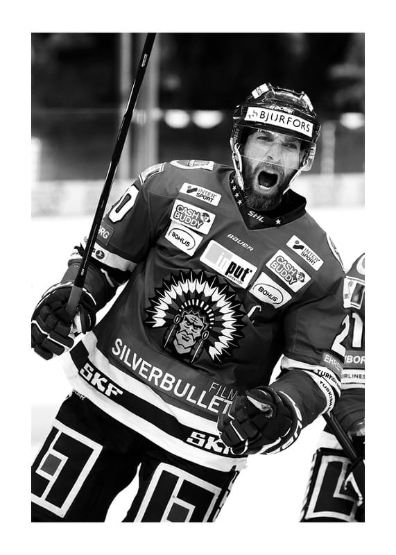 Svartvit poster med Frölundas Joel Lundqvist som jublar efter mål i final 3 i SM-slutspelet mellan Frölunda och Djurgården i april 2019 i Göteborg.