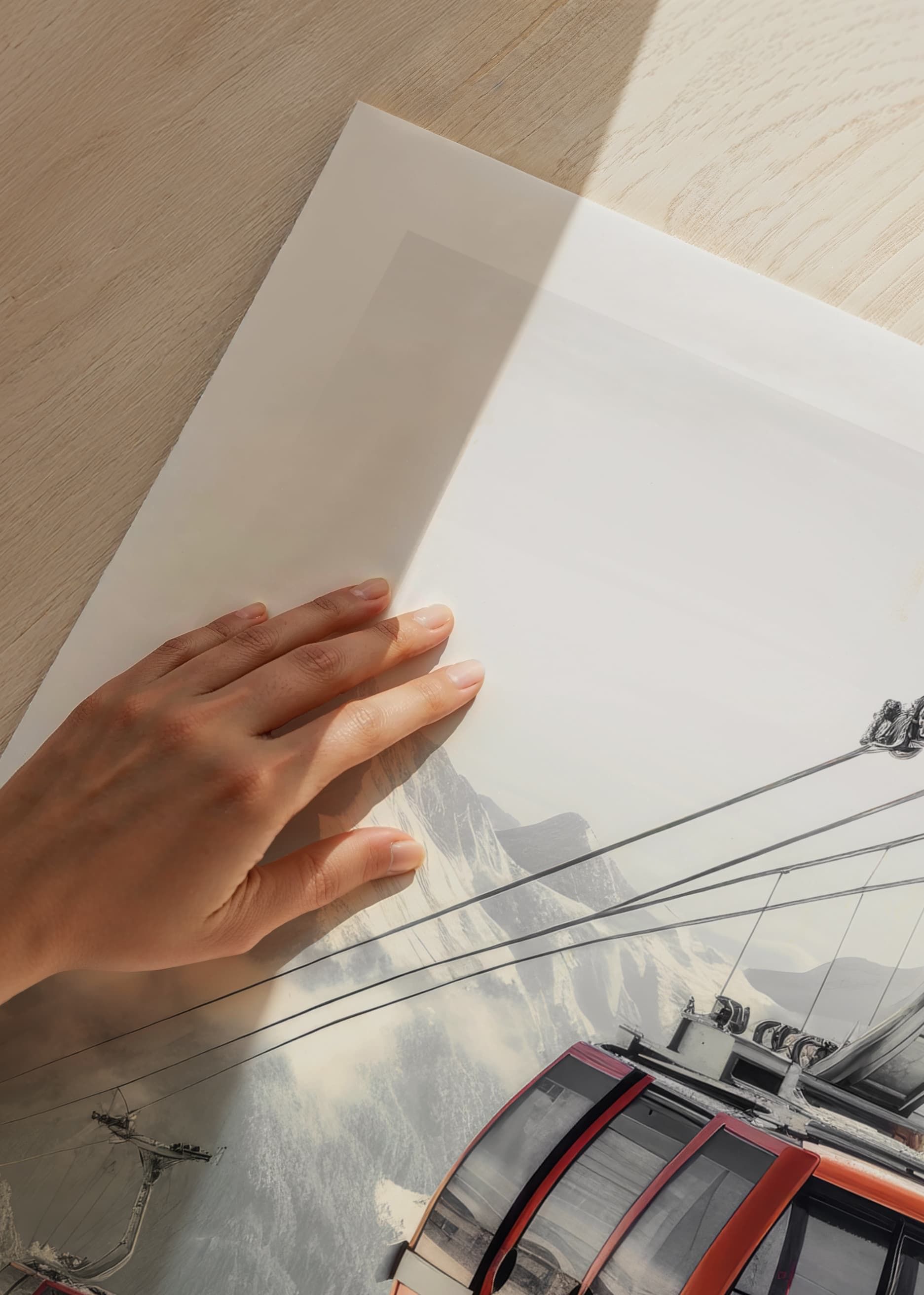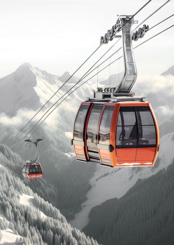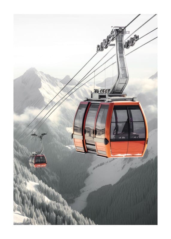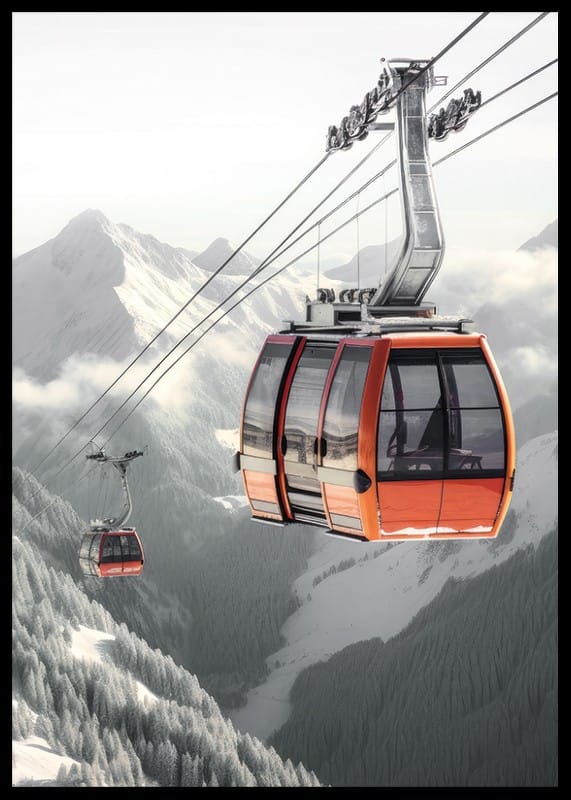 Röda gondolliftar svävar högt ovanför snötäckta träd och dramatiska bergssluttningar. Bakgrunden domineras av mjuka dimslöjor och vassa toppar i gråvita toner. Denna poster förmedlar känslan av vinter och rörelse och passar bra i rum där du vill addera ett inslag av natur och äventyr.