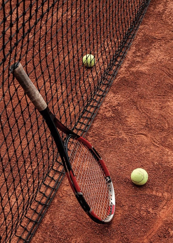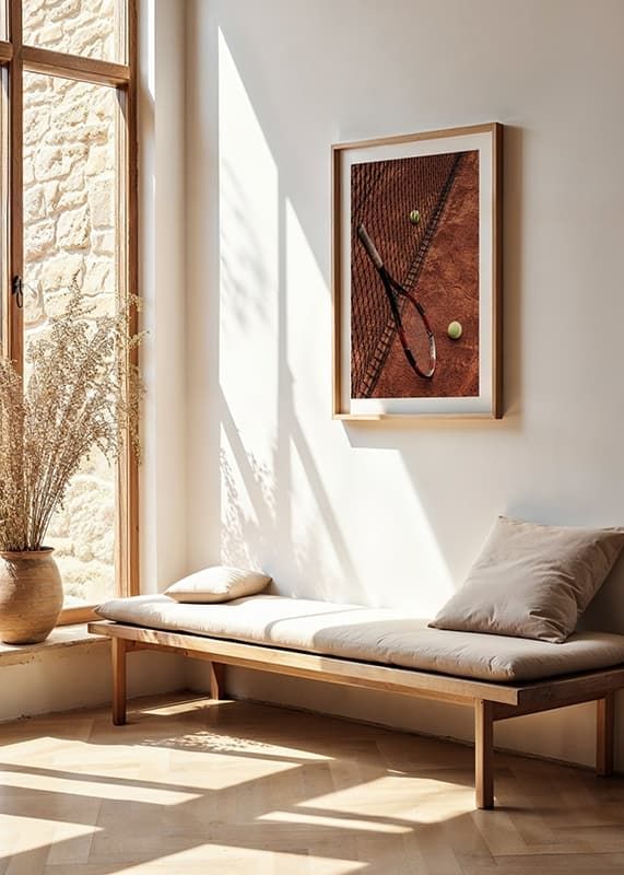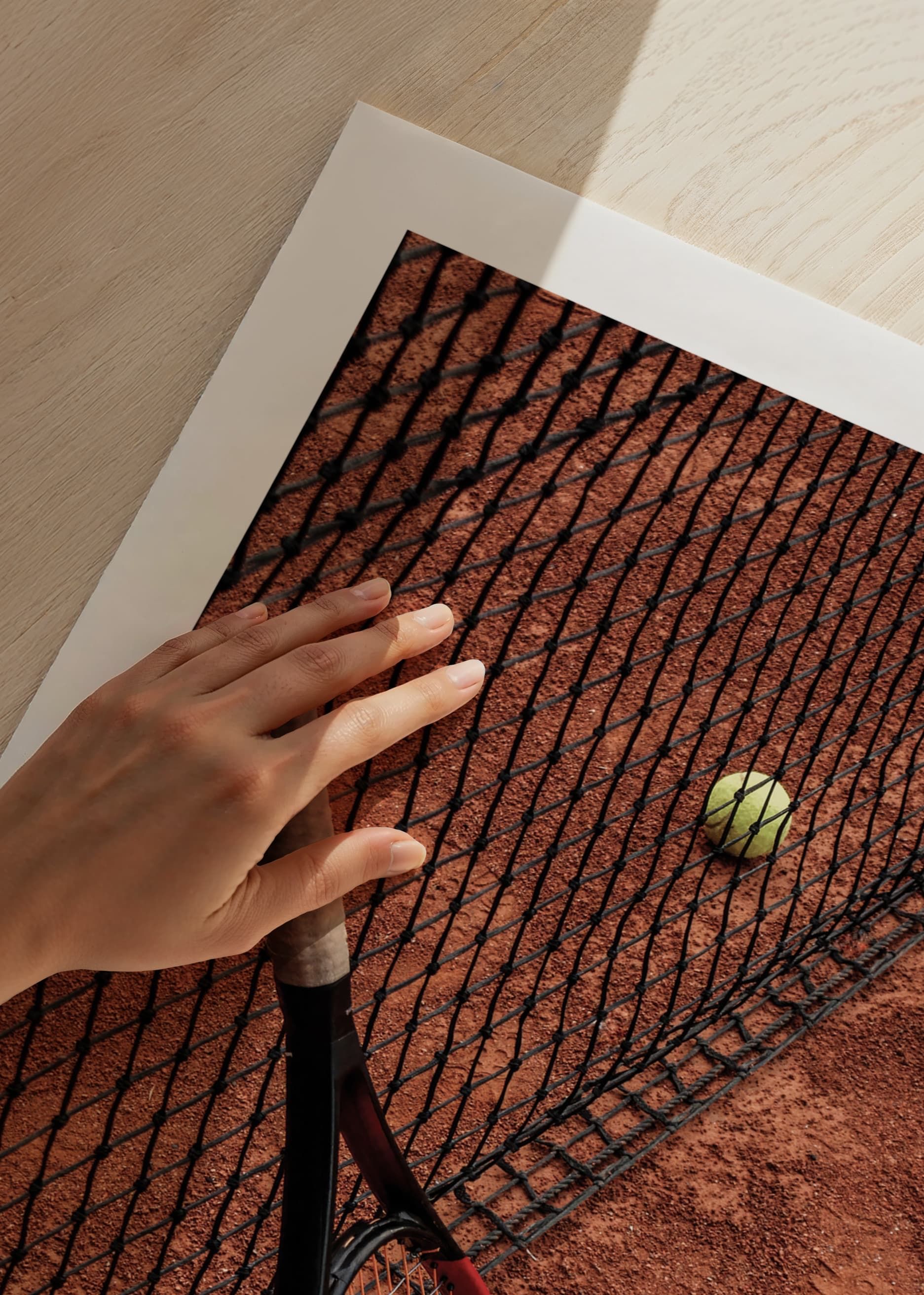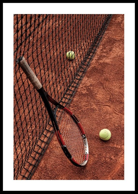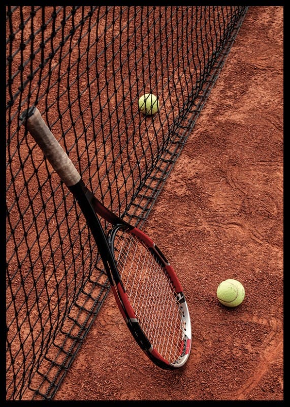 Närbild av ett tennisracket lutat mot ett svart nät på en rödbrun grusplan. Två gula tennisbollar ligger på varsitt sida av nätet, med tydlig textur i underlaget. Den sportiga känslan och de varma färgtonerna gör denna poster till ett dynamiskt inslag i hem, kontor eller träningsmiljö.