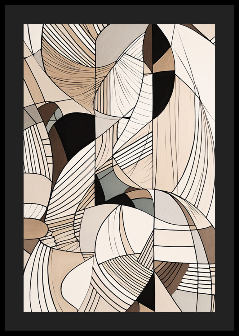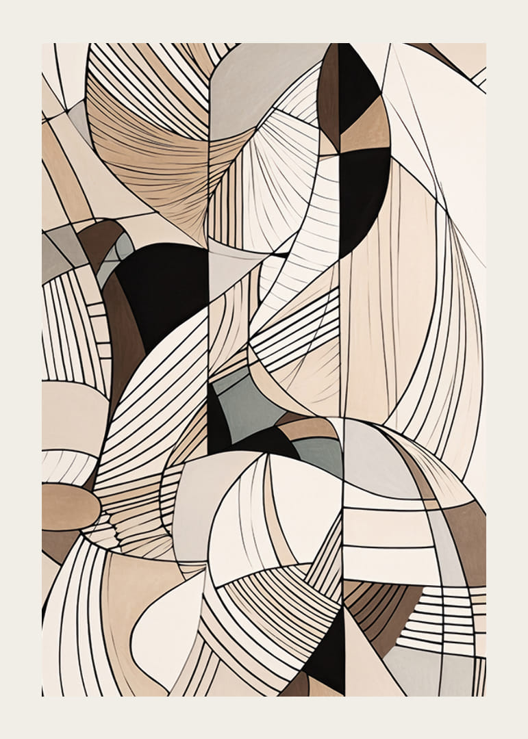 Organiska former och svepande linjer i beige, brunt och svart bildar ett abstrakt botaniskt motiv där de böljande fälten påminner om blad och växtdelar. Det grafiska uttrycket skapar ett lugnt men livfullt intryck. Den här postern passar utmärkt i modern inredning och ger rummet en stilren visuell struktur.