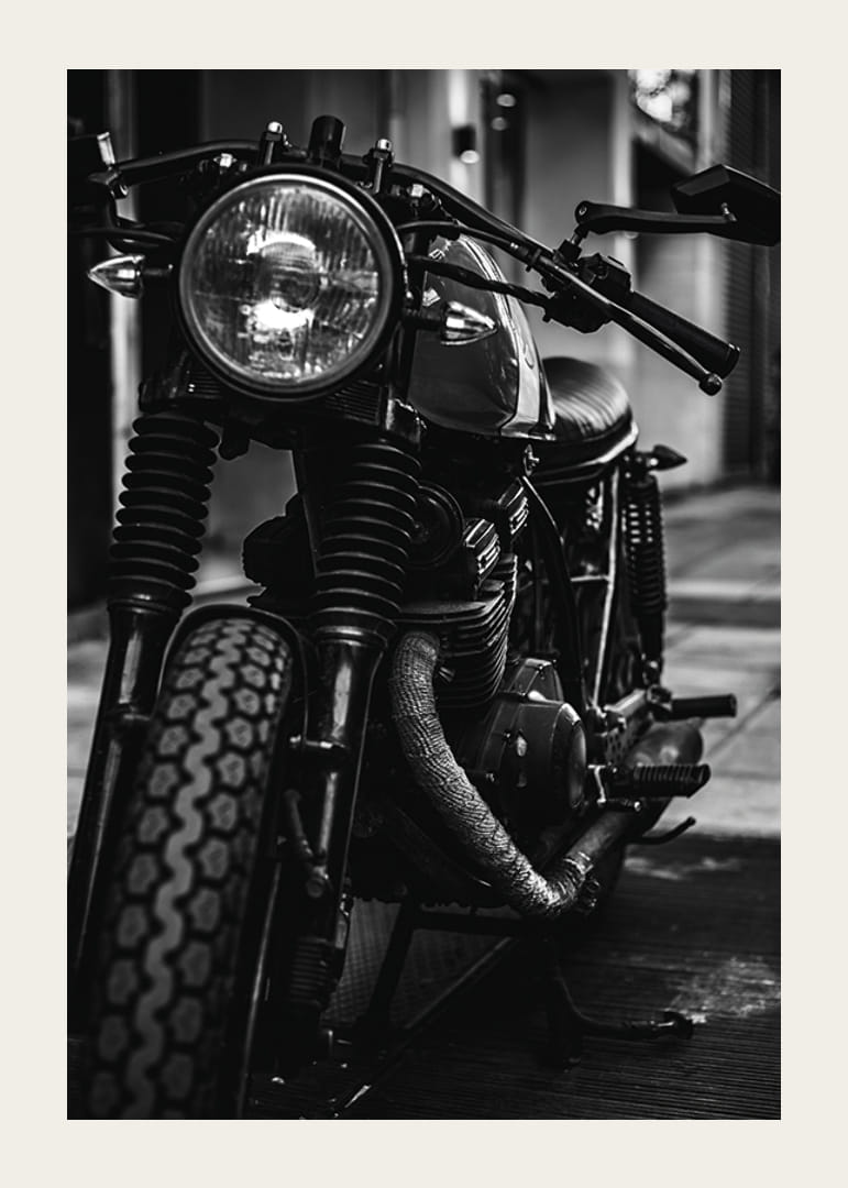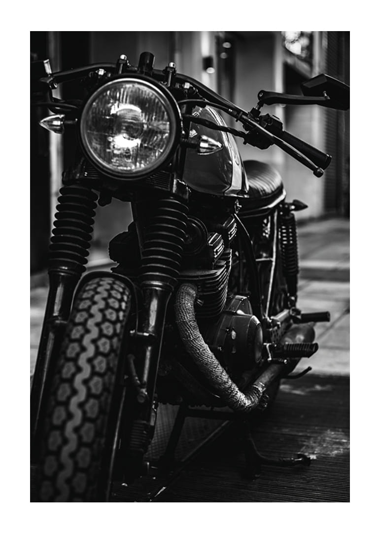 Närbild av en klassisk motorcykel i svartvitt, där detaljer i motor och framhjul framträder tydligt mot en suddig stadsmiljö. De kontrasterande nyanserna ger motivet en rå och autentisk känsla. Den här postern passar utmärkt i rum där industrikänsla eller retrostil eftersträvas, exempelvis i kontor eller vardagsrum.