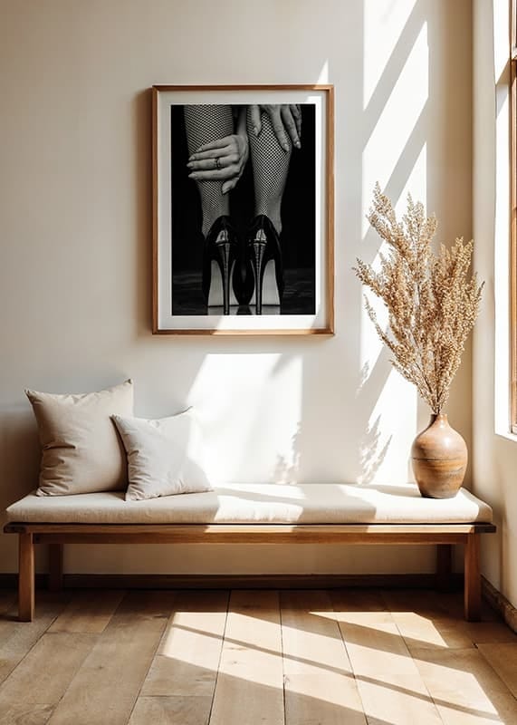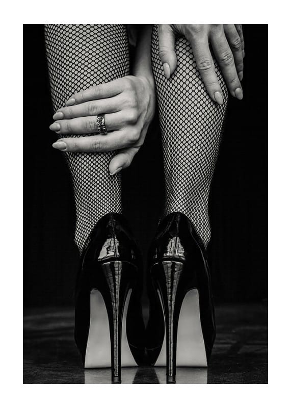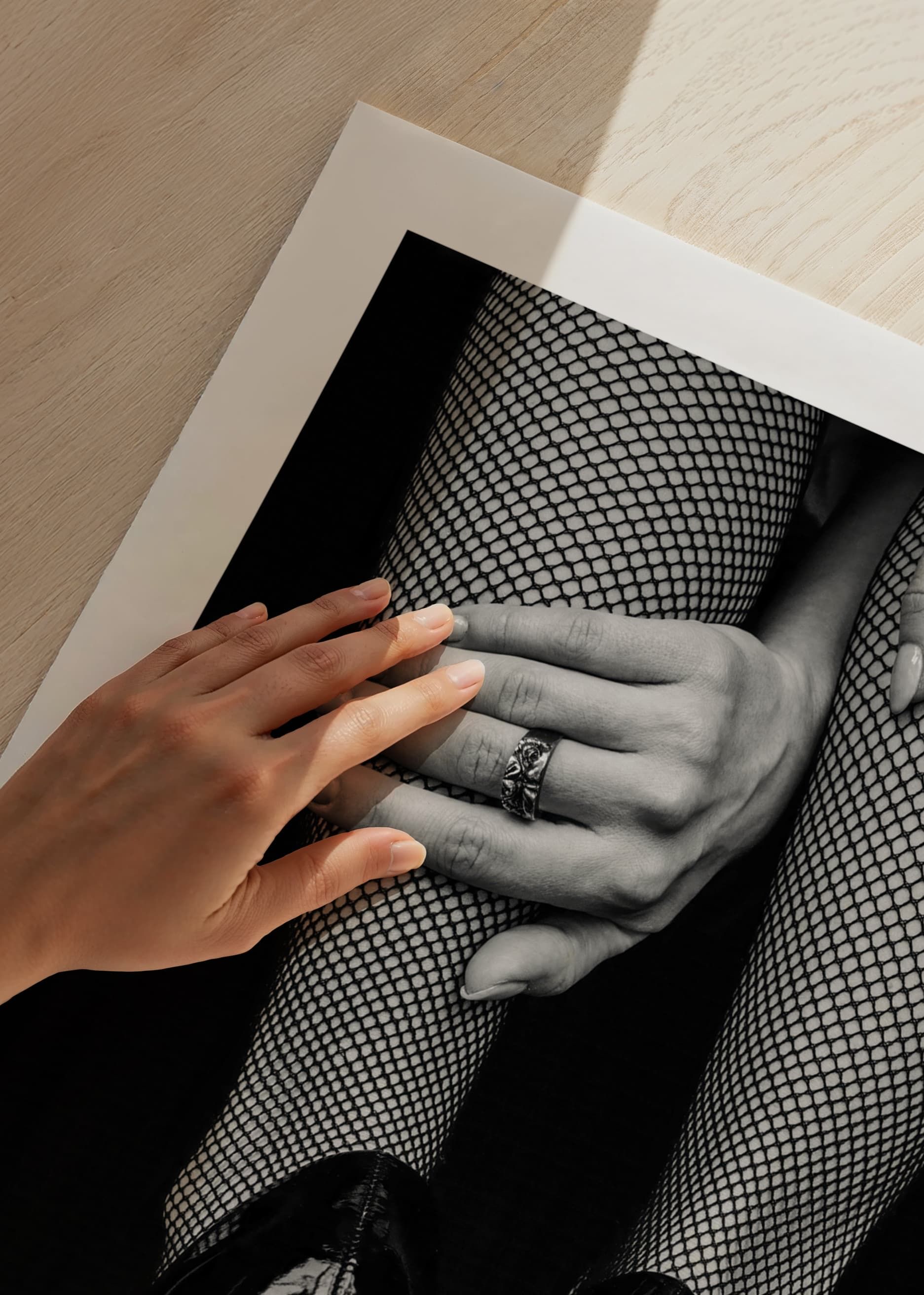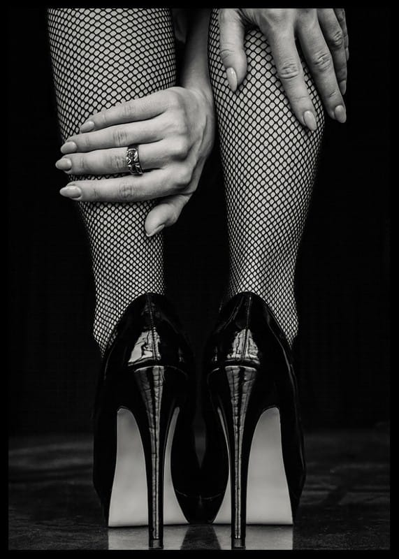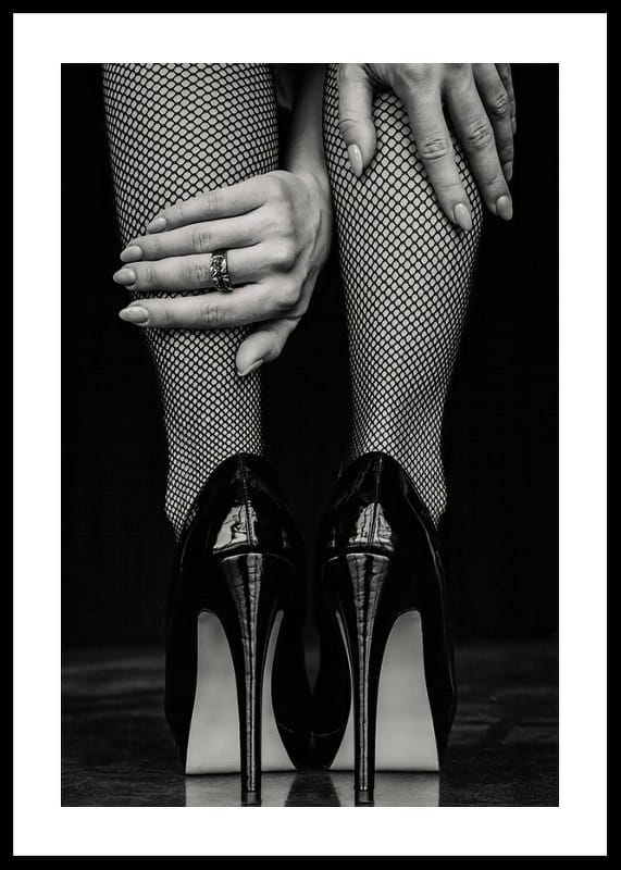 Närbild av ben klädda i nätstrumpbyxor och höga svarta lackskor, där händerna vilar över smalbenen och en ring syns tydligt. Stilren svartvit komposition framhäver kontrasterna mellan texturer och former i motivet. En modeinspirerad poster som tillför grafisk känsla till exempelvis hall eller sovrum.