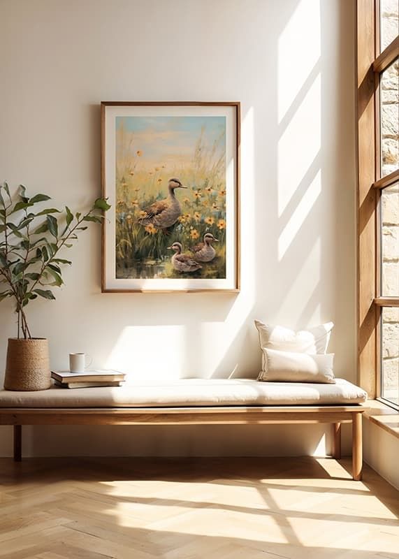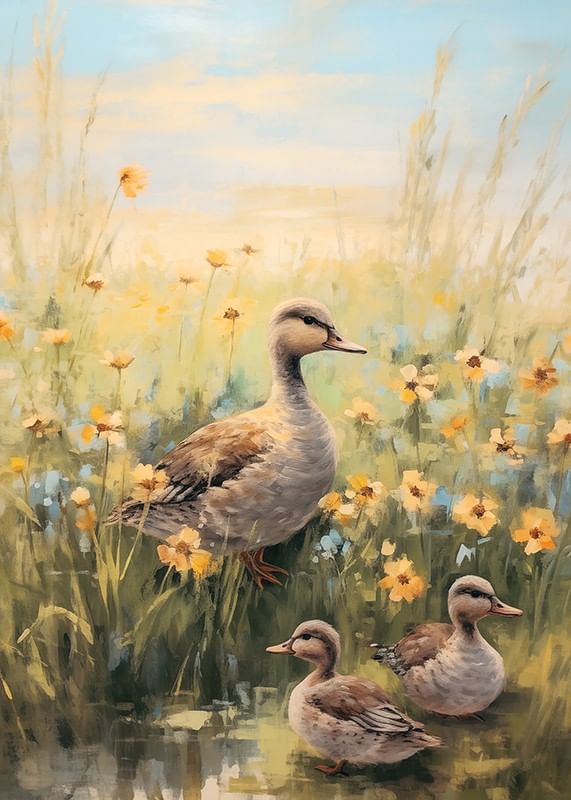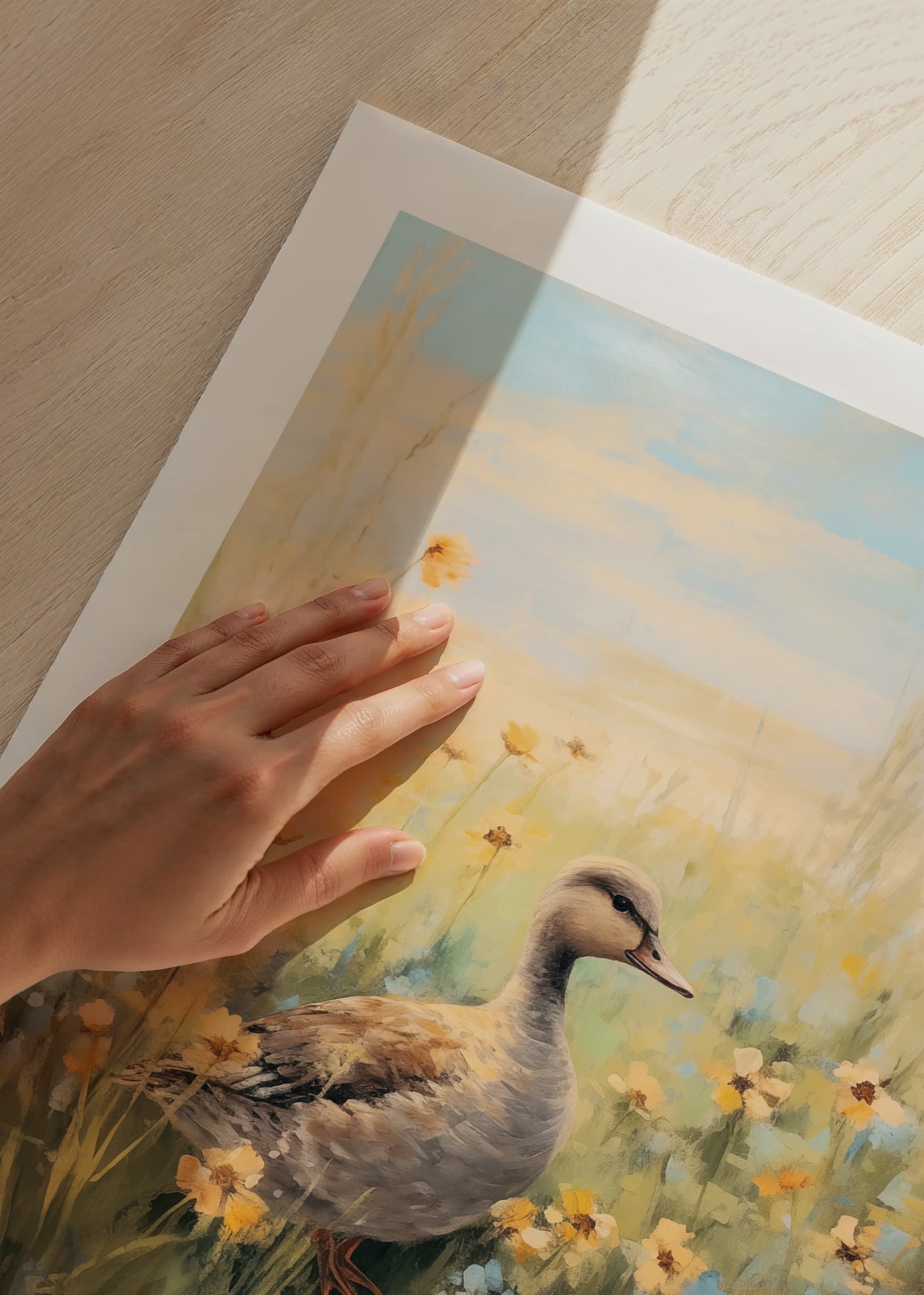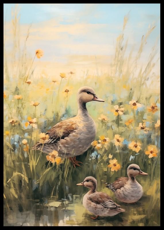 Andmamma står i grönskande sommaräng omgiven av gula och vita blommor medan två andungar följer efter. Ljusblå himmel och mjukt dagsljus ger motivet en klar och naturlig känsla. Med sitt naturnära uttryck tillför denna poster ett lugnt och varmt inslag i barnrum, hall eller vardagsrum.