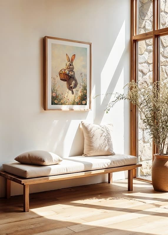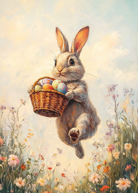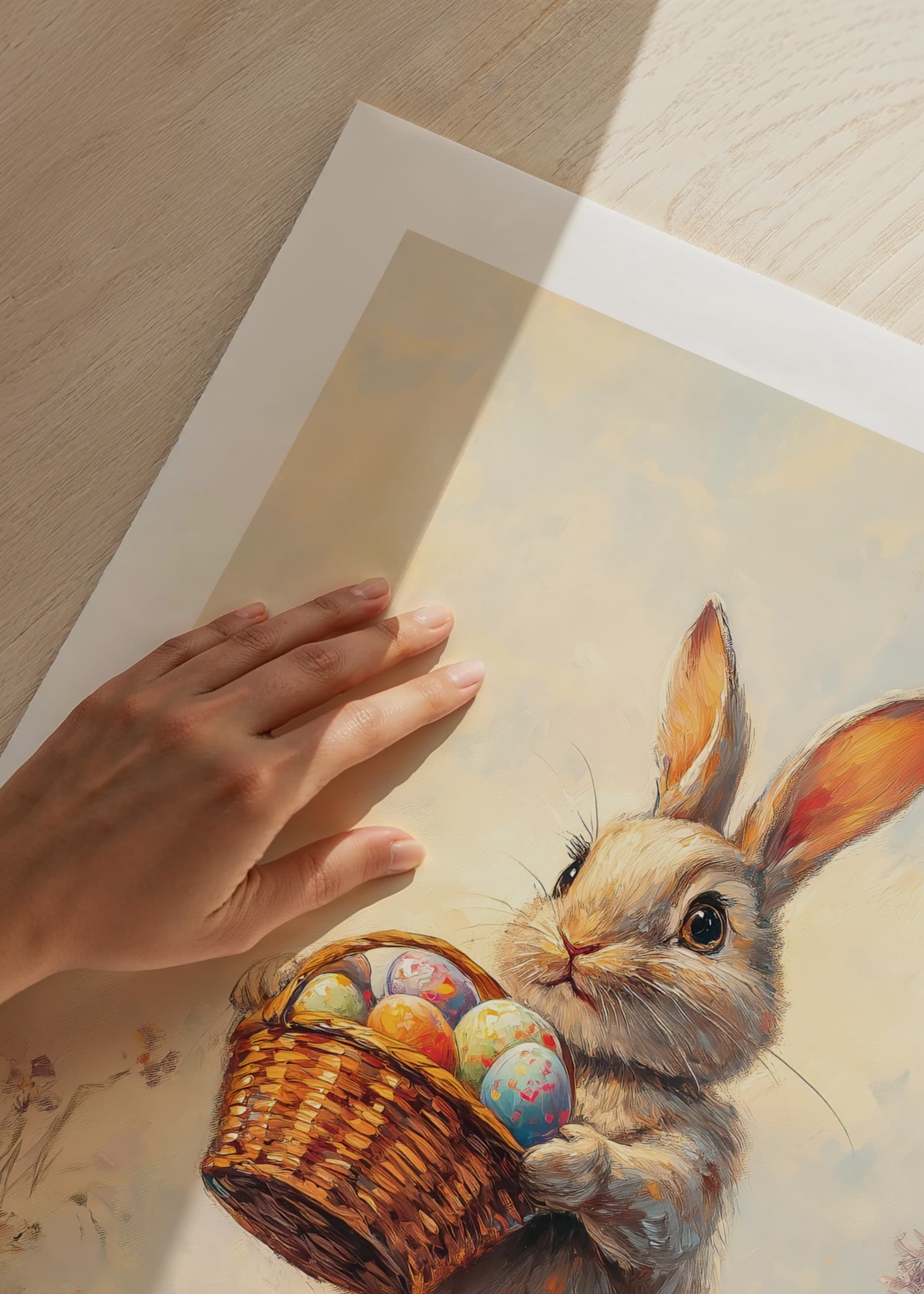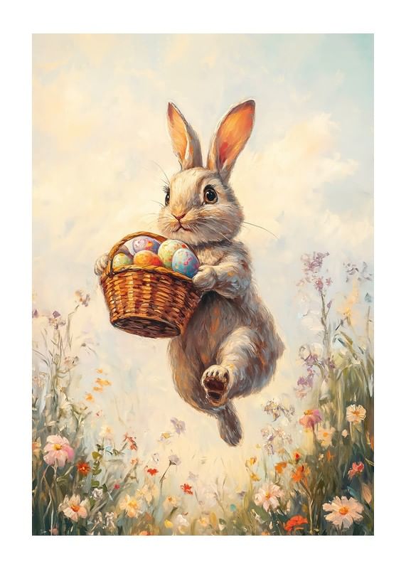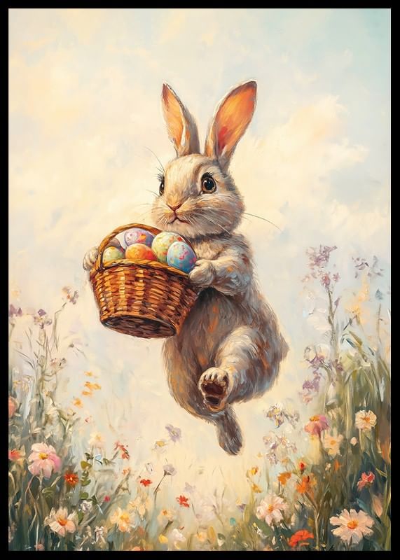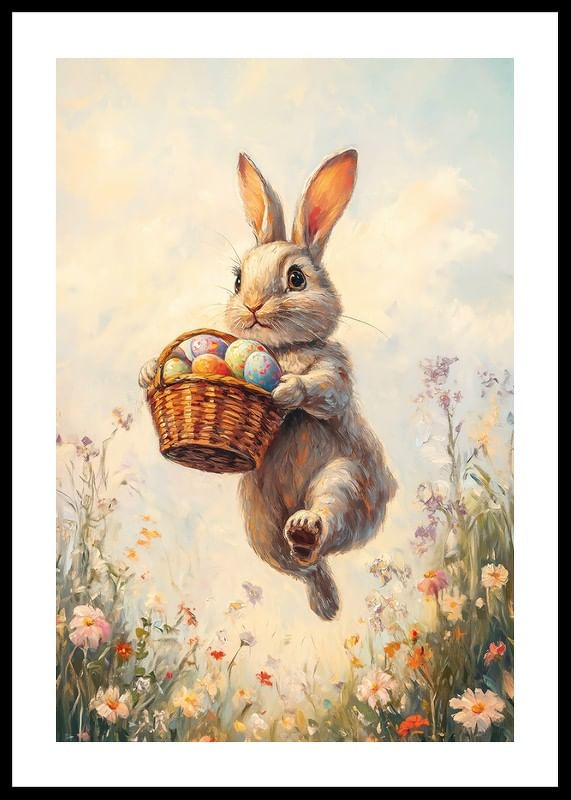 En lurvig kanin hoppar över en blomsteräng och håller en flätad korg fylld med mönstrade påskägg i pastellfärger. Bakgrunden präglas av mjukt ljus och milda färger som framhäver de livliga blommorna. Denna poster ger en lekfull vårkänsla och passar fint i barnrum eller hall.