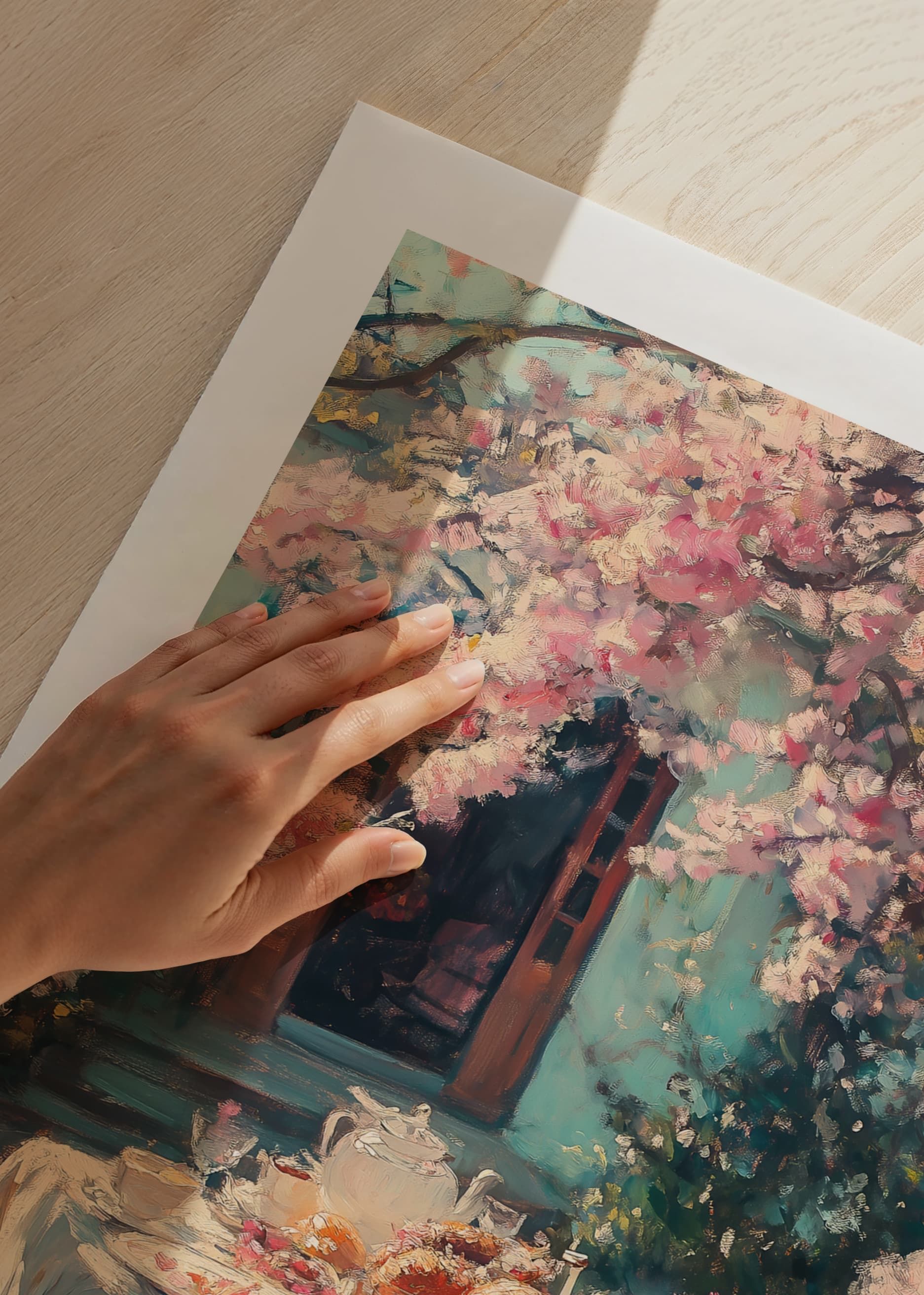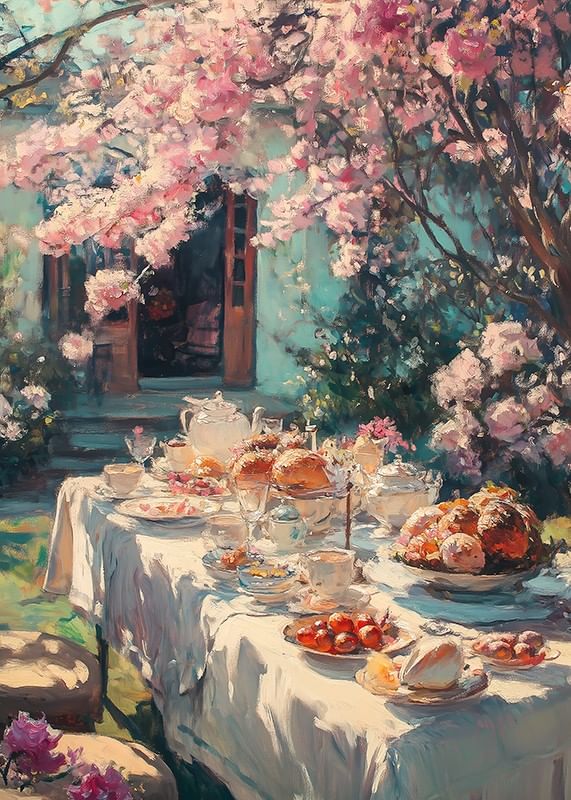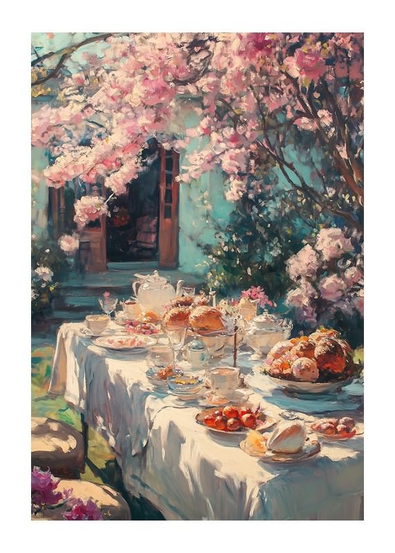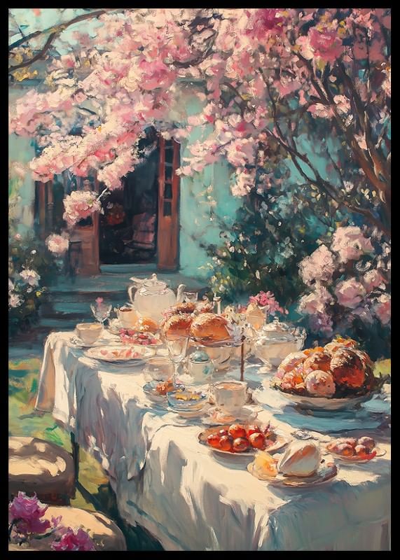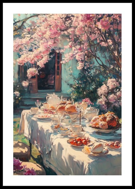Långbord täckt av vit duk är uppdukat med porslin, bröd, bakverk och frukt under ett rosa blommande körsbärsträd. Mjukt dagsljus filtreras genom grenarna och bakgrunden visar öppna dörrar mot en blågrön fasad. Denna poster ger vårkänsla och passar i kök eller matrum.