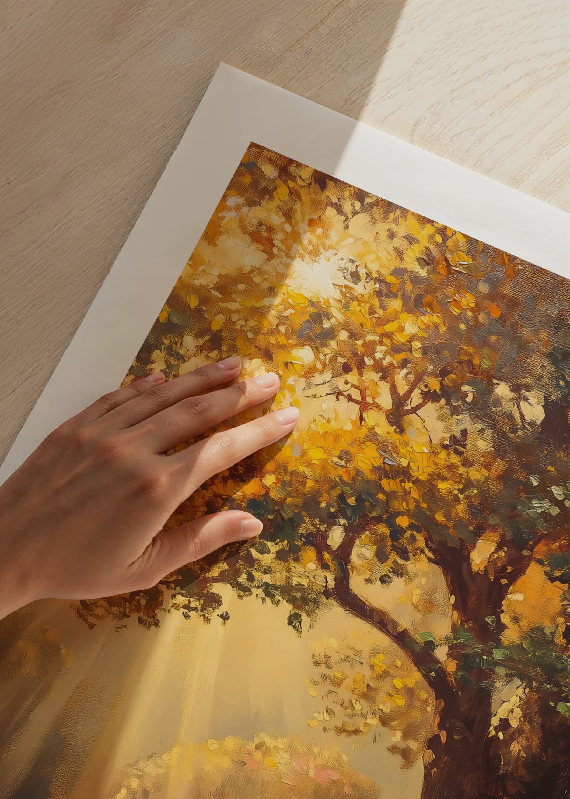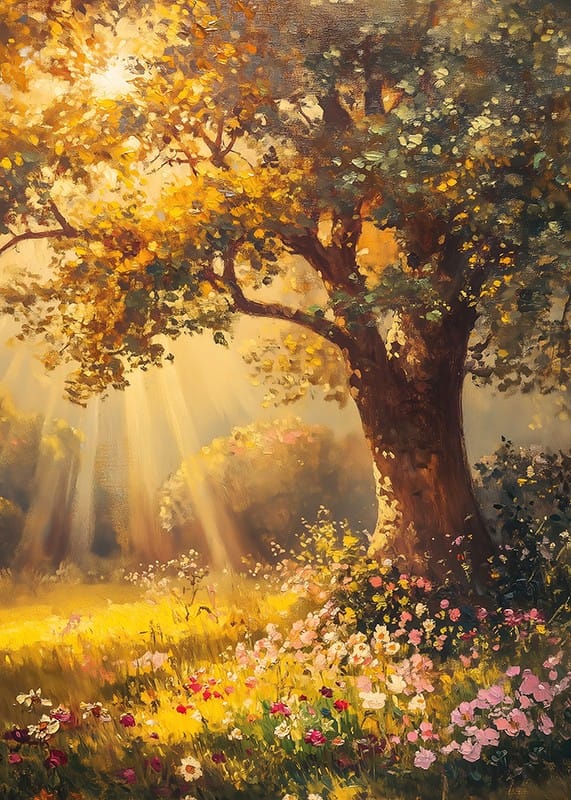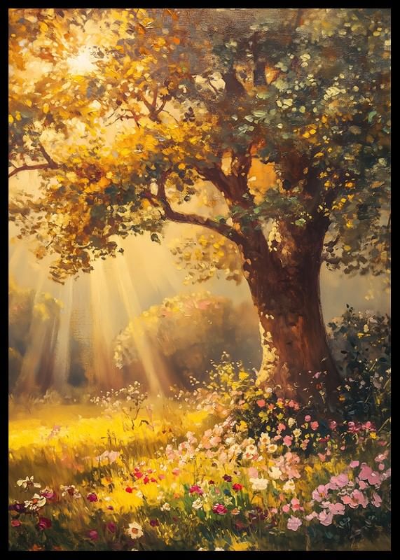 Ett motiv där en stor ek breder ut sina grenar över en solbelyst äng fylld av färgglada vilda blommor. Varma strålar bryter genom lövverket och skapar ett mjukt ljusspel i bilden. Med sina harmoniska toner adderar denna poster en naturnära och stillsam känsla till exempelvis vardagsrum eller sovrum.