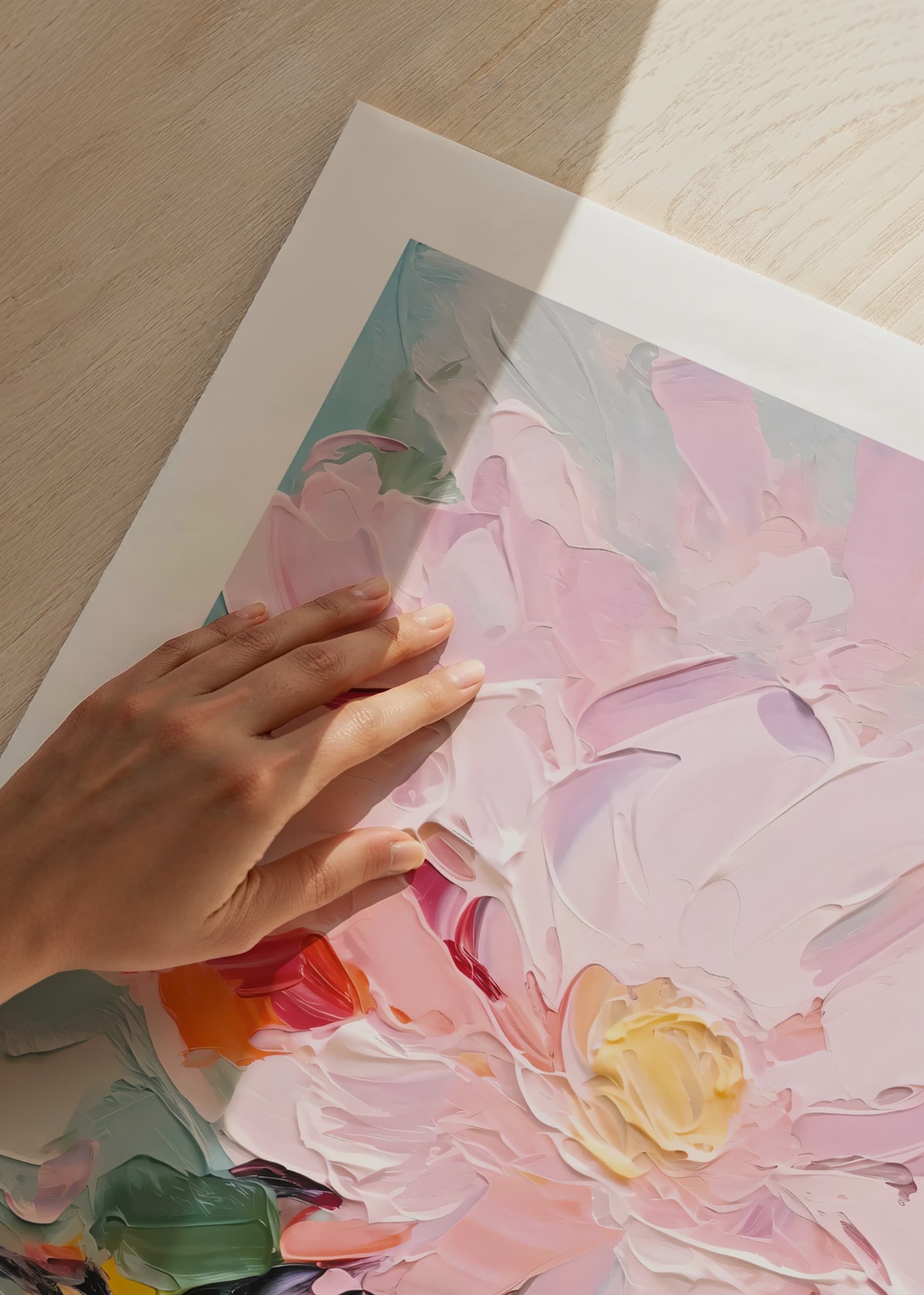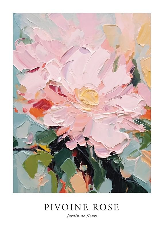 Mjuka penseldrag skildrar en rosa pion i närbild, omgiven av inslag av gröna blad och subtila nyanser av gult och aprikos. Den abstrakta, målade stilen skapar rörelse och liv i motivet. En poster som bidrar med färg och konstnärlig känsla i både vardagsrum och sovrum utan att ta över.