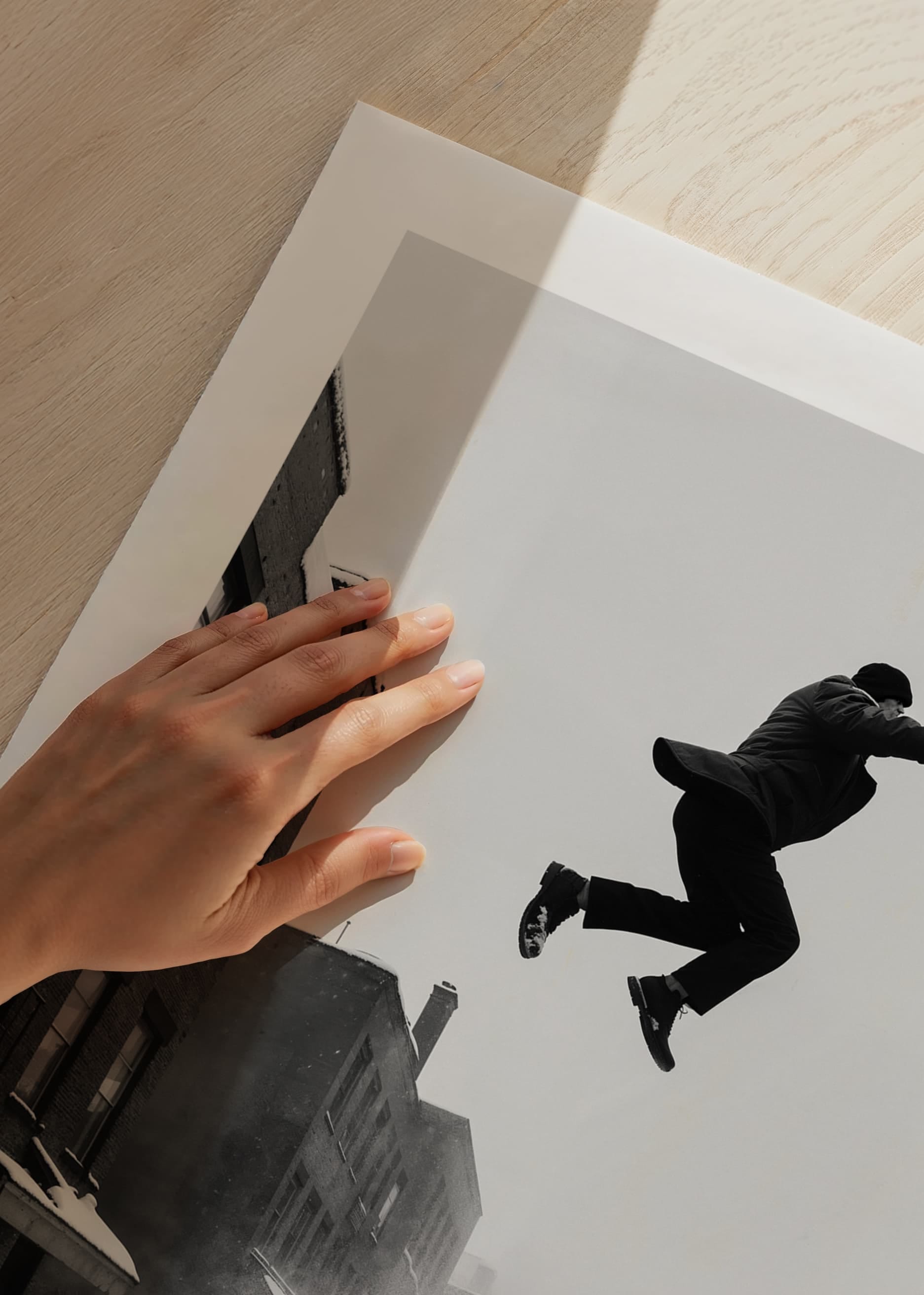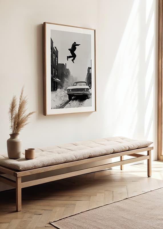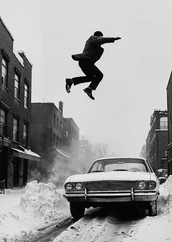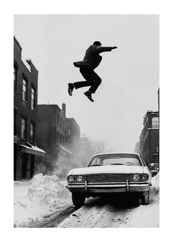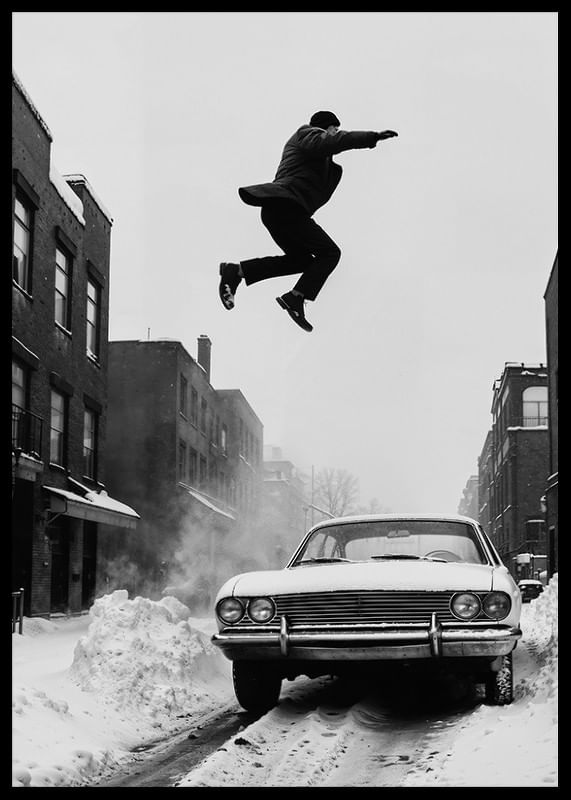 En vinterklädd stadsgata med snöhögar och klassiska tegelhus omges av ett dramatiskt ögonblick där en man, iklädd kavaj och byxor, hoppar över motorhuven på en gammal, klassisk bil täckt av snö. Den svartvita stilen och motivets energi ger denna poster ett urbant uttryck som passar utmärkt i moderna vardagsrum eller arbetsrum.